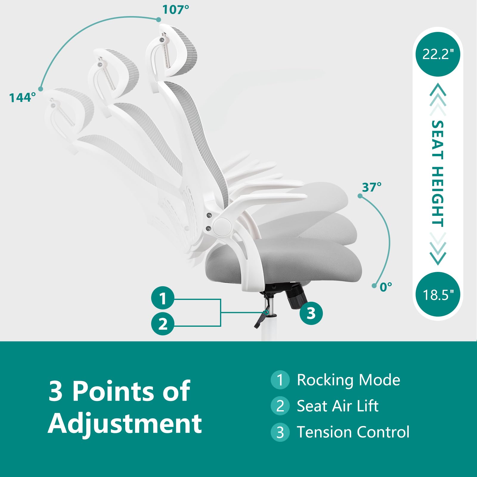 【Free Adjustment Multi-Function】The height of the swivel computer chair can be adjusted according to demand. Also, you can tilt backward to relax, switch your sitting posture, and adjust the tilting angle by twisting the tension column under the chair seat, the 90 -120-degree rocking design meets your different sitting positions. It also features 360-degree rotation. Height adjustable from 18.5 to 22.2 inches, matching different stature.