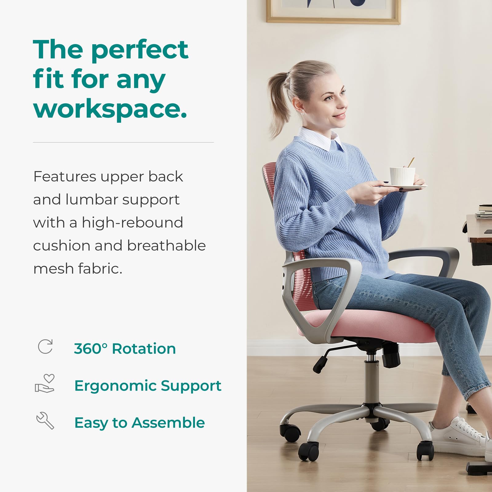 【All Day Comfort】The desk chair has a soft high-density sponge seat, which is covered with durable & breathable mesh fabric and has good elasticity. It is difficult to deform to keep them comfortable for long hours. Perfect for your home office, bedroom, classroom, school, computer desk, apartment, guest workstation, gaming room, or conference room. This office chair is the perfect gift for family and friends.
