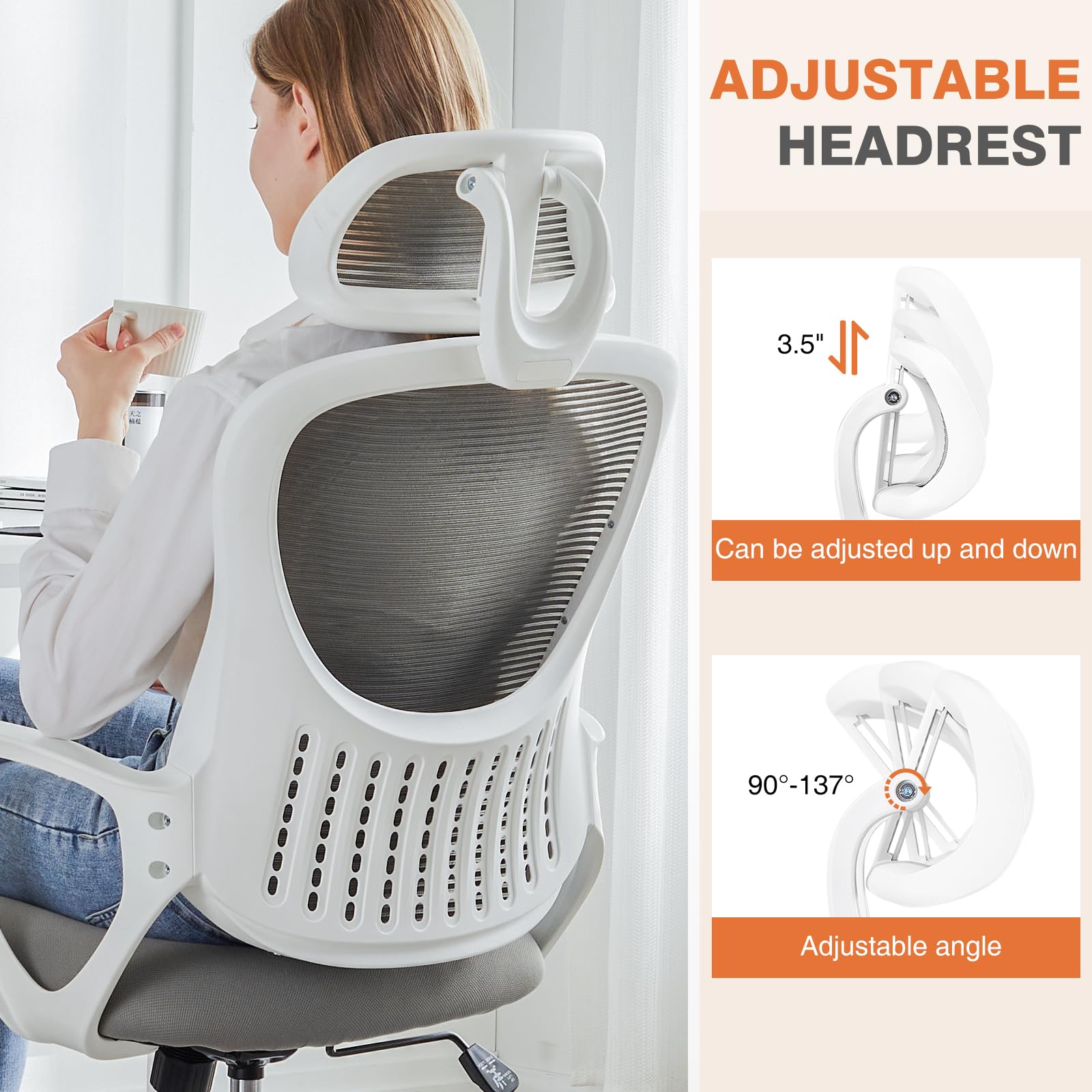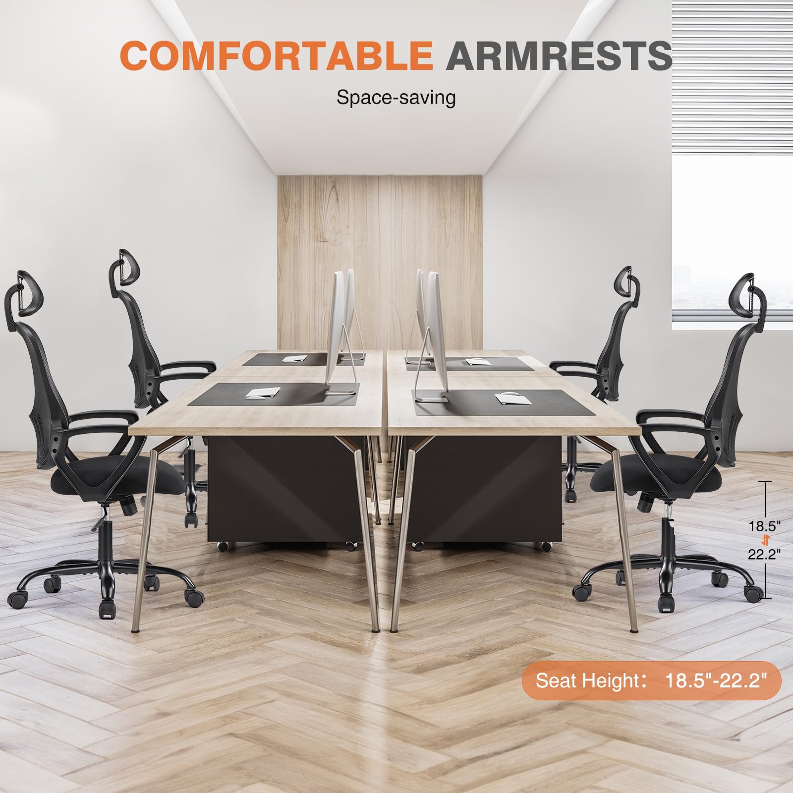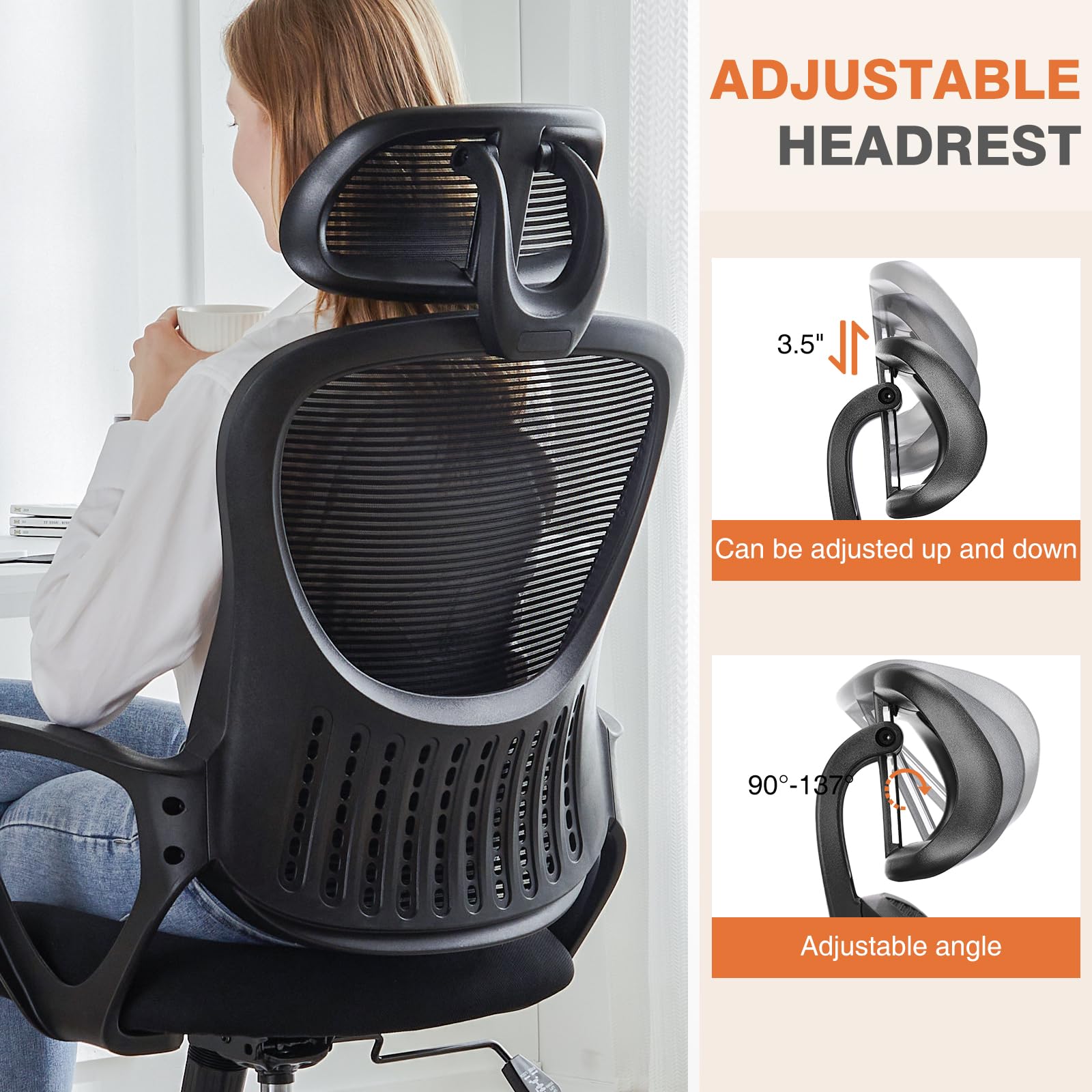 Sweetcrispy Office Computer Desk Chair, Ergonomic High-Back Mesh Rolling Work Chairs with Wheels and Adjustable Headrests, Comfortable Lumbar Support, Comfy Flip-up Arms for Home,Bedroom,Study, Black