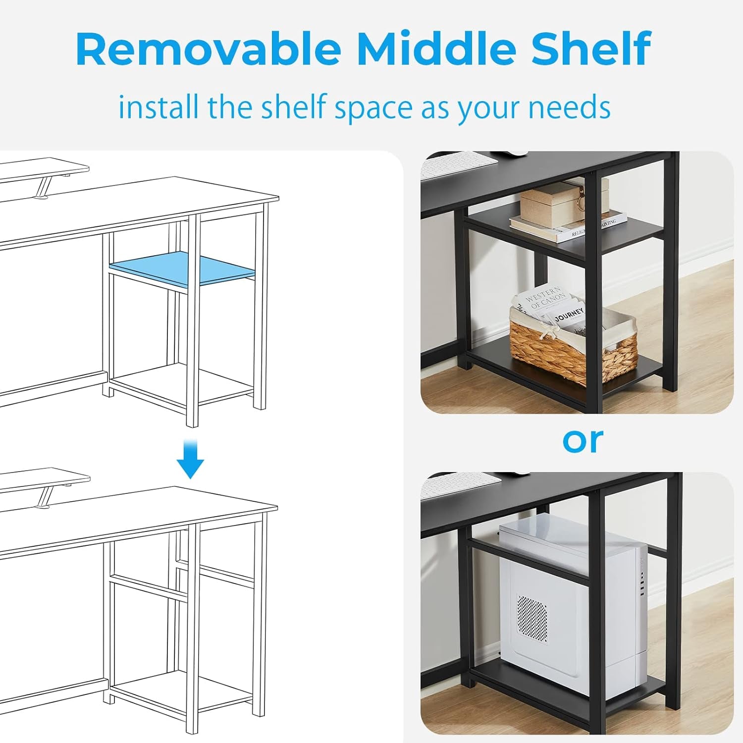 • Reversible Storage Shelves: Customize your storage with two-tier shelves that can be installed on either side of the desk. Perfect for books and storage boxes, with the option to remove the middle shelf for larger items.