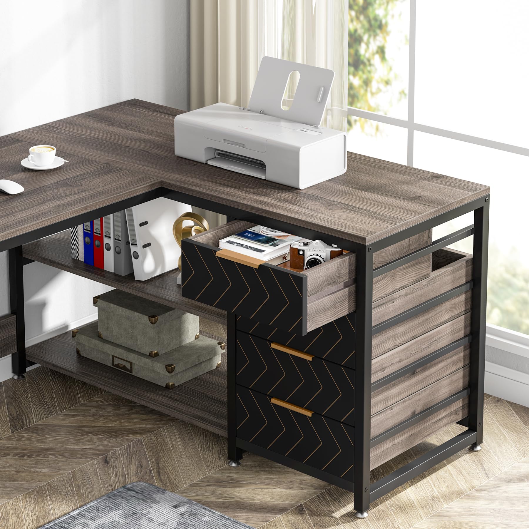 【All-in-One Office Desk】Coming with 4 side file drawers, and 2 open storage shelves, this executive desk creates a versatile workstation that will meet all your needs.