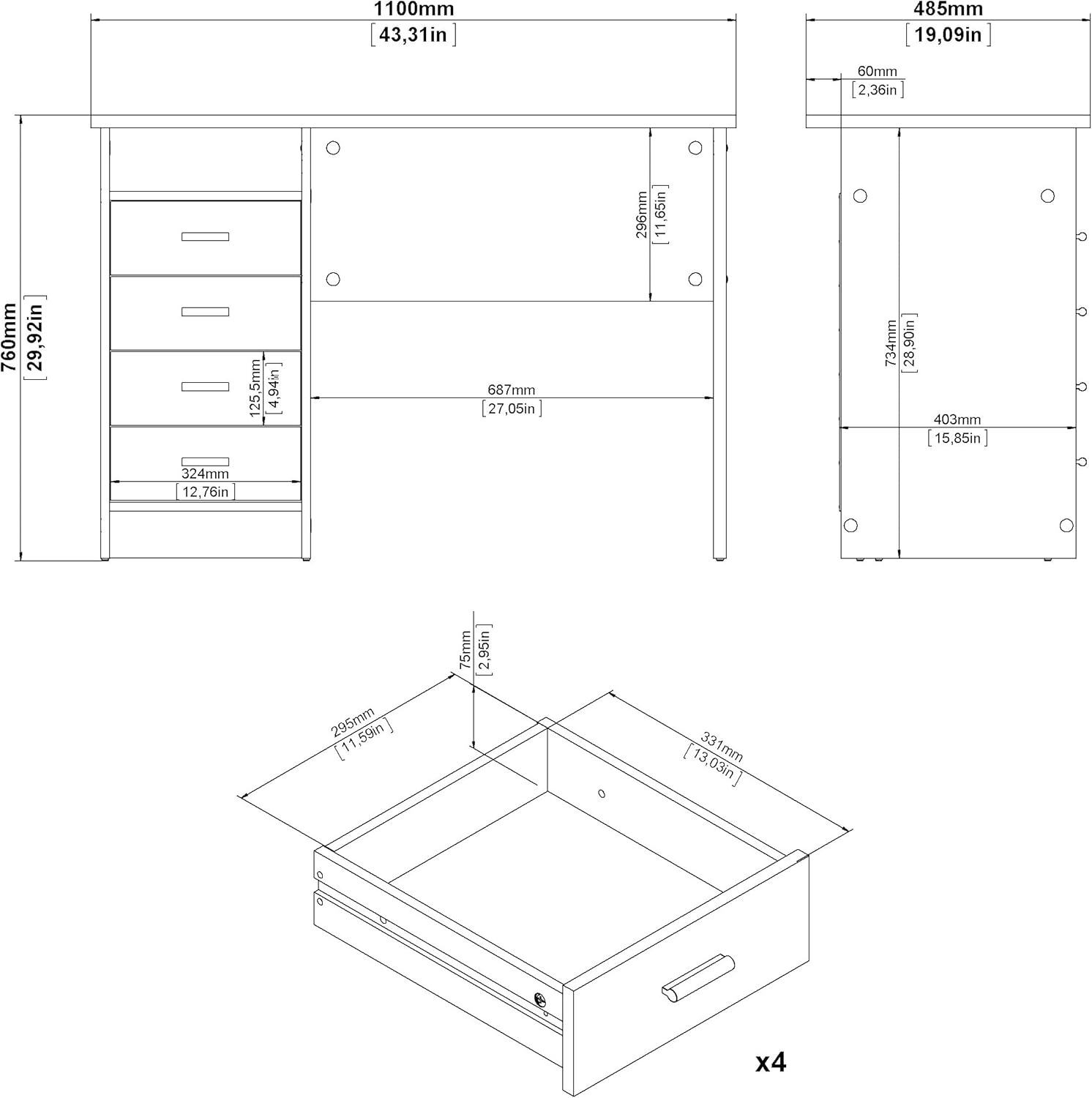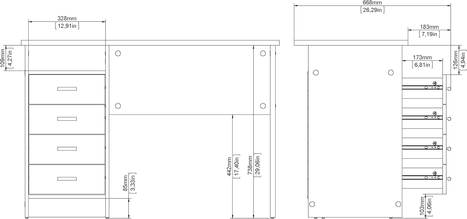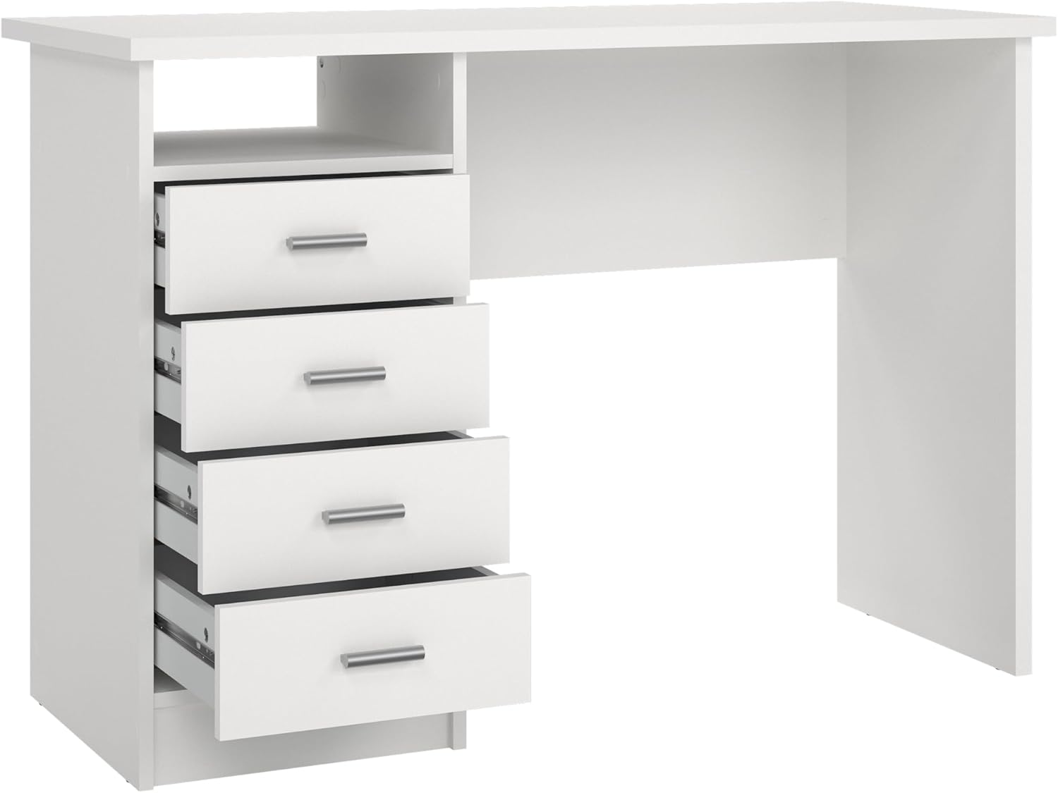 Add function and style to your new office space with the Warner Desk with 4 Drawers. This desk provides one open shelf for easily accessible items and the four drawers provide plenty of storage to assist with office clutter. The drawers are backed with metal glides complemented with aluminum bar handles. With a foil finish, the top coat of this desk provides durability and protects against stains, smears, and fading.
