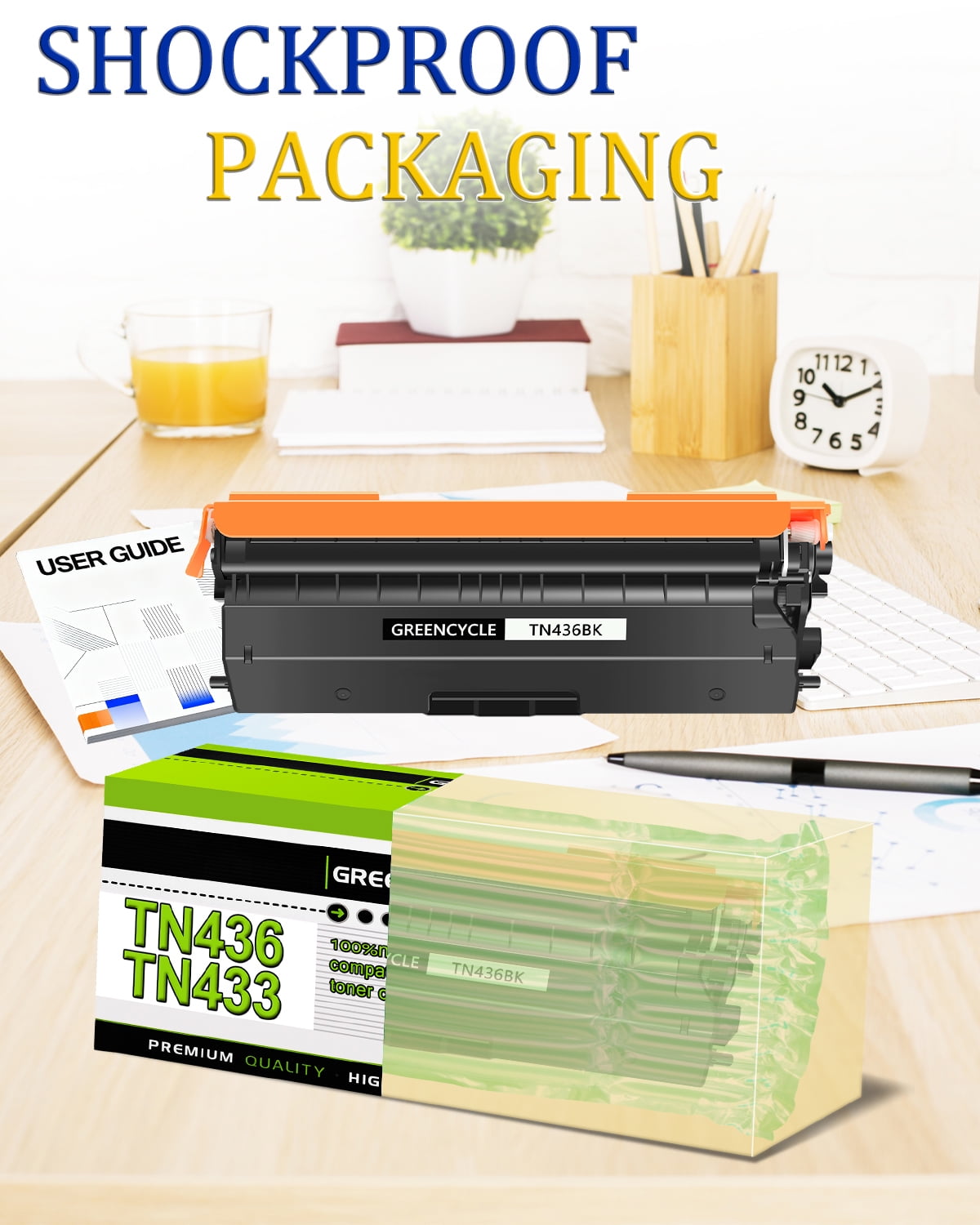 GREENCYCLE TN436BK Compatible Toner Cartridge for TN436 TN433 TN431 toner cartridge. Product Information: GREENCYCLE compatible TN436 toner cartridge is a replacement for the OEM model with the same compatibility and superior quality. We are committed to helping more writers, graphic designers and publishers create excellent work. We pay attention to more details to ensure you experience superior print quality. Page yield: 6,500 pages per black toner cartridge based on 5% page coverage of A4 Letter. Compatible for Brother printer: HL-L8360CDW MFC-L8900CDW HL-L8260CDW HL-L9310CDW MFC-L8690CDW MFC-L8610CDW MFC-L9570CDW DCP-L8410CDW How to install a toner cartridge with a drum unit: Step 1: Unpack the new cartridges & shake the toner 6-8 times gently to loose the toner evenly. Step 2: Remove the orange plastic protective cover. Step 3: Insert the toner cartridge into the drum unit. Step 4: Insert the toner cartridge & drum unit into the corresponding slots until it snaps into place. Close your printer cover, and ready to print.