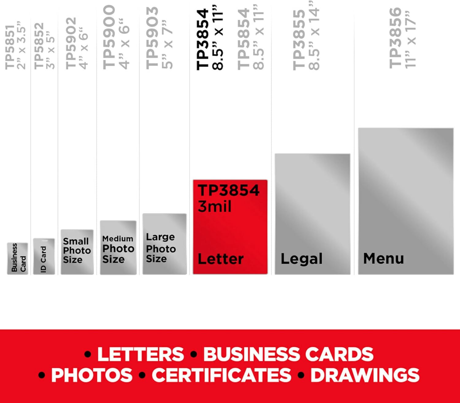 Scotch Thermal Laminating Pouches are ultra-clear pouches that protect and add professionalism to documents you use frequently. These laminating pouches allow important information to show through with a clear, photo-safe finish. Lamination pouches are ideal for creating marker-proof, tear-proof and spill-proof paper items that you want to last in the home, office or classroom. These self laminating pouches are great school supplies and office supplies. Use laminate pouches for laminating signs, flyers, schedules, certificates, to-do lists, children’s artwork and other frequently used documents. Most household cleaners are safe to use on these laminator pouches, so you can disinfect them and know your important documents are germ-free (1). One package contains letter-size pouches that fit items up to 8.9 in. x 11.4 in. Each pack contains 100 pouches. For the best results, use these laminating pouches with Scotch Thermal Laminators. (1) Do not sanitize pouches before the lamination. Test a small amount in a corner before use, especially on important documents. Do not use acetone.