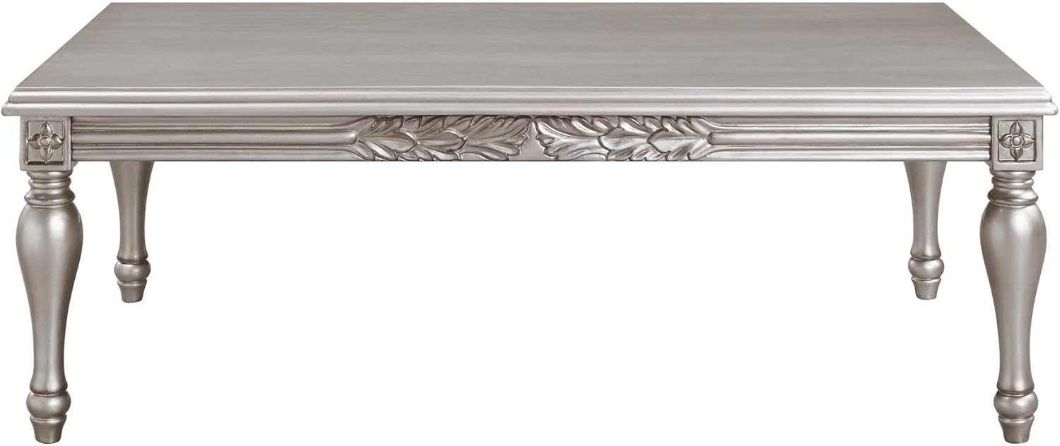 Filled with glitz, drama and romantic spirit, this attention-grabbing accent piece will bring a fresh twist to your home. It draws on elements from sleek modern aesthetic and vintage engraving style. Lustrous platinum finish are added to give fresh appeal to the wooden frame. Elaborate carving of flowers and leaves on the table aprons brings a touch of uniqueness and sophisticated beauty to the table. Elevate and liven up the overall space with the Pelumi Coffee Table that gives off a noble and extraordinary feel.