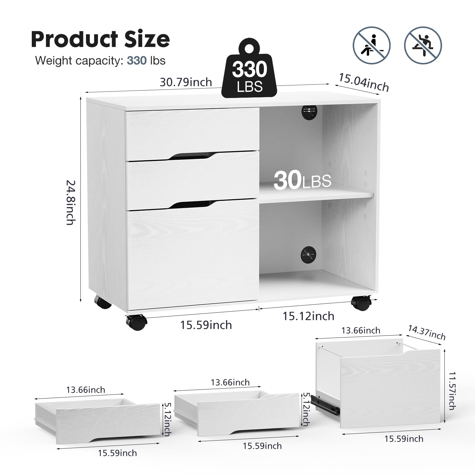 DUMOS Lateral File Cabinet with 3 Drawers Rolling Filing Cabinets Under Desk Storage Printer Stand Wood Organizer with Wheels Adjustable Shelf for Office Home Small Space, White