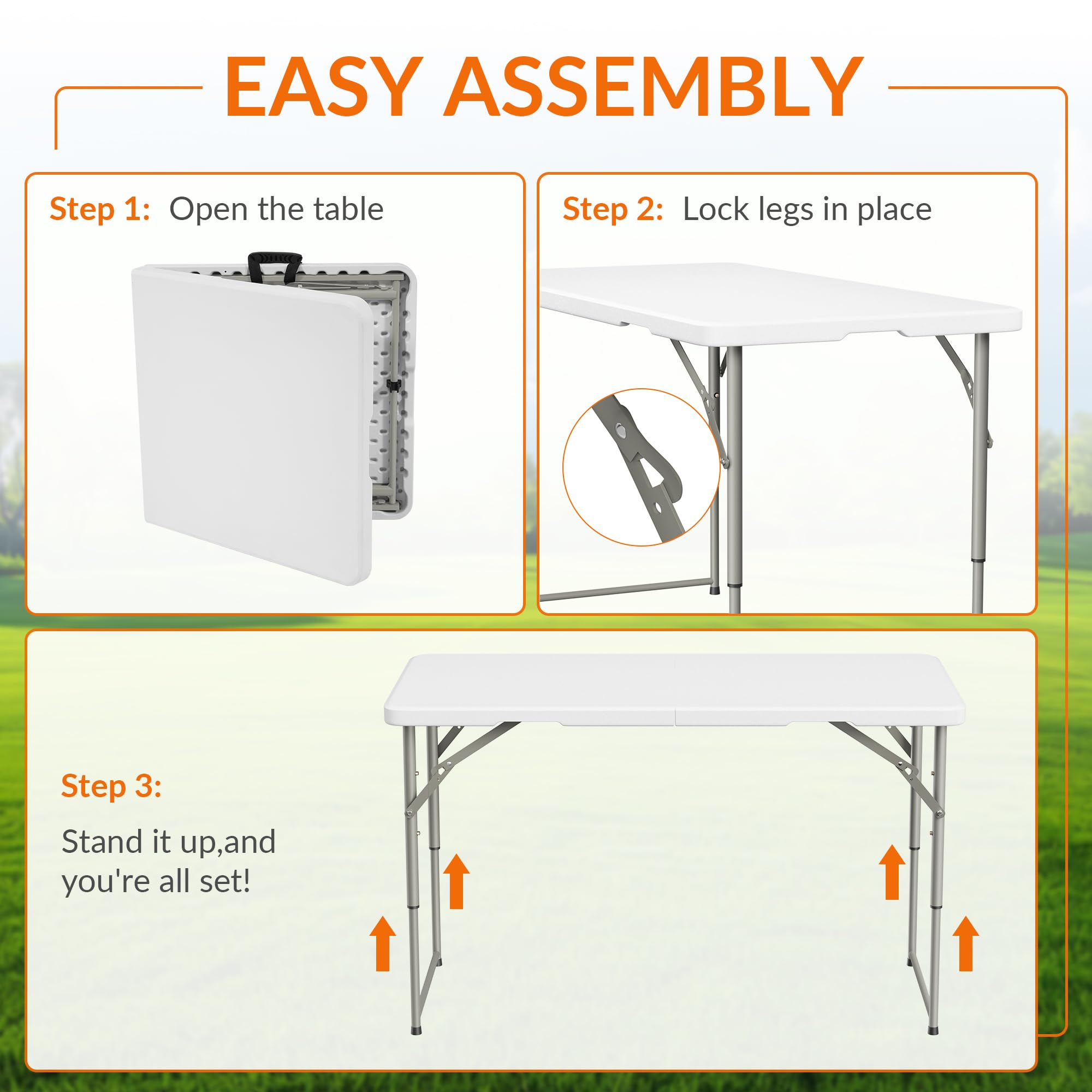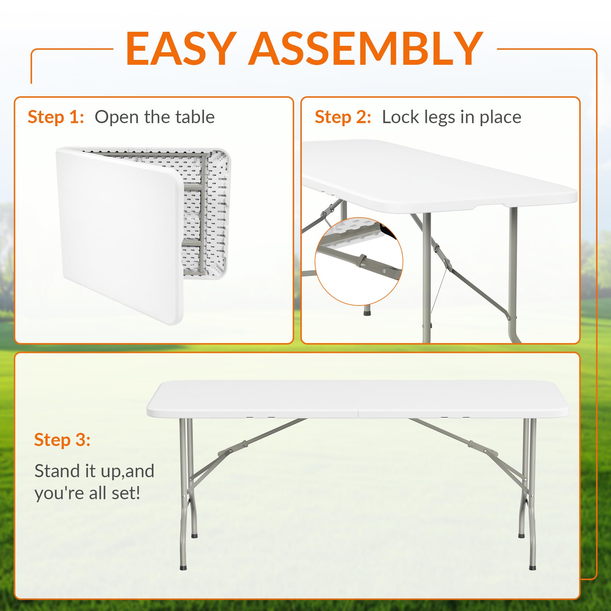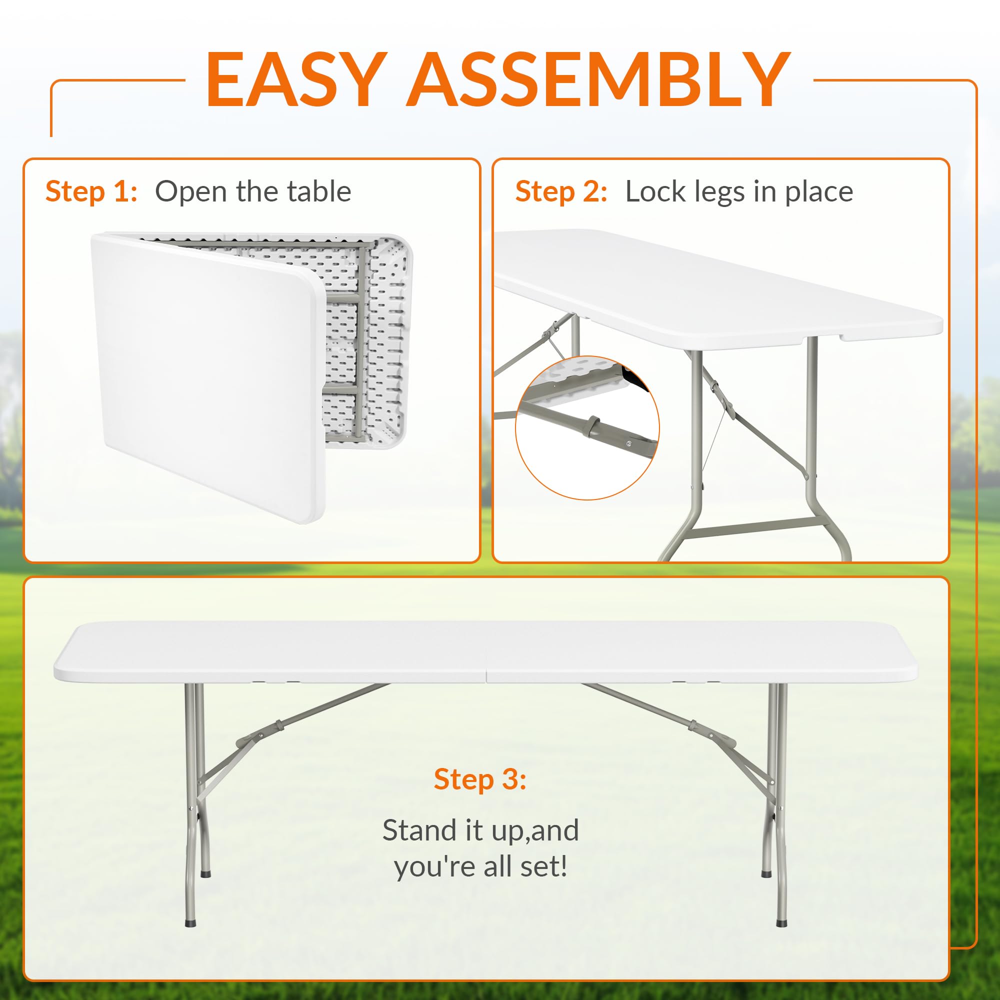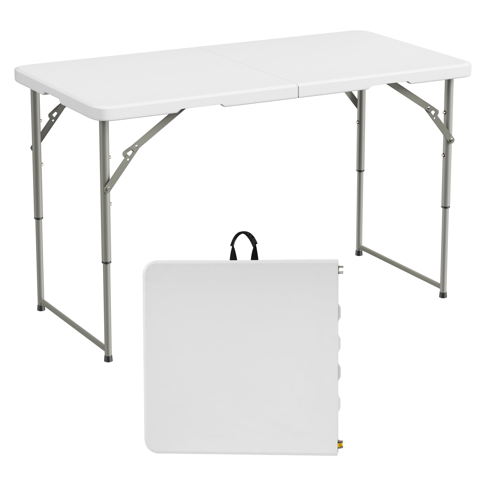 Heavy Duty Folding Table: Constructed with heavy-duty steel legs and a polyethylene plastic table top, this foldable table supports heavy loads for reliable and long-lasting use in a variety of conditions. Use it as a camping table for rugged terrain or as a spacious picnic table for family gatherings