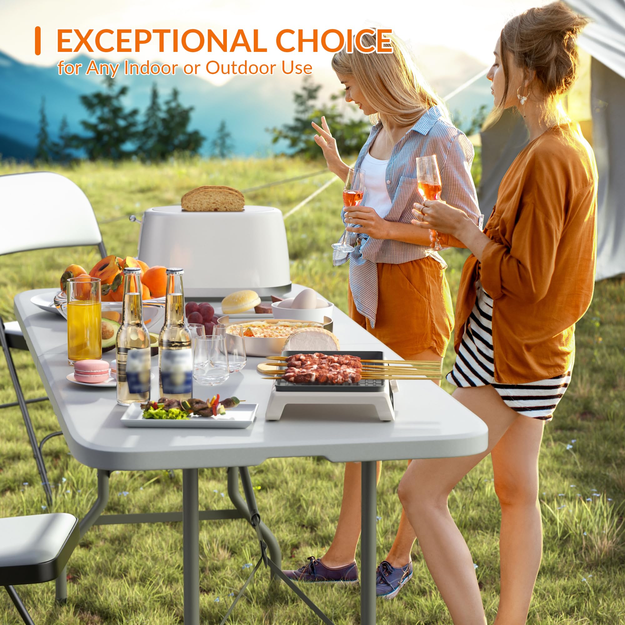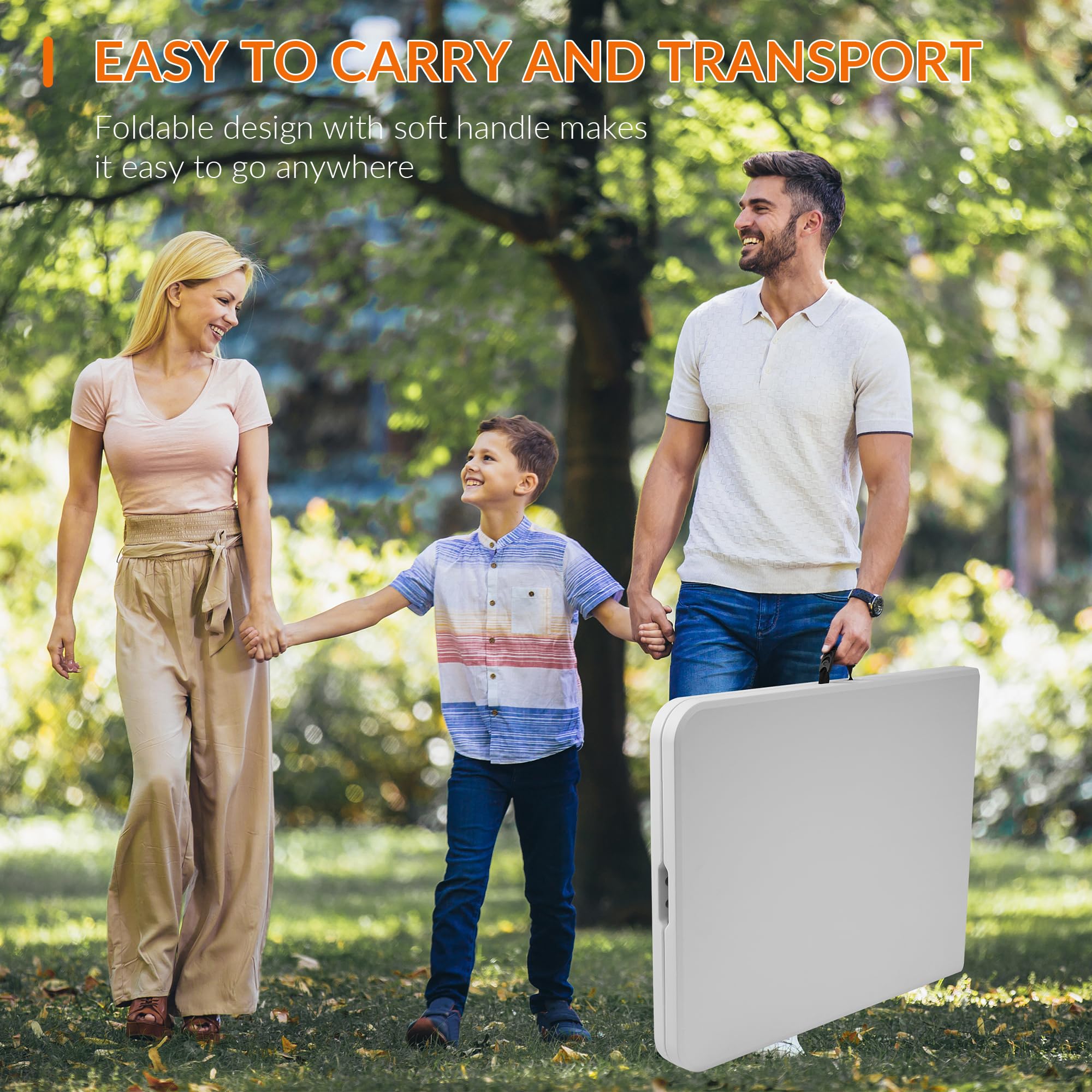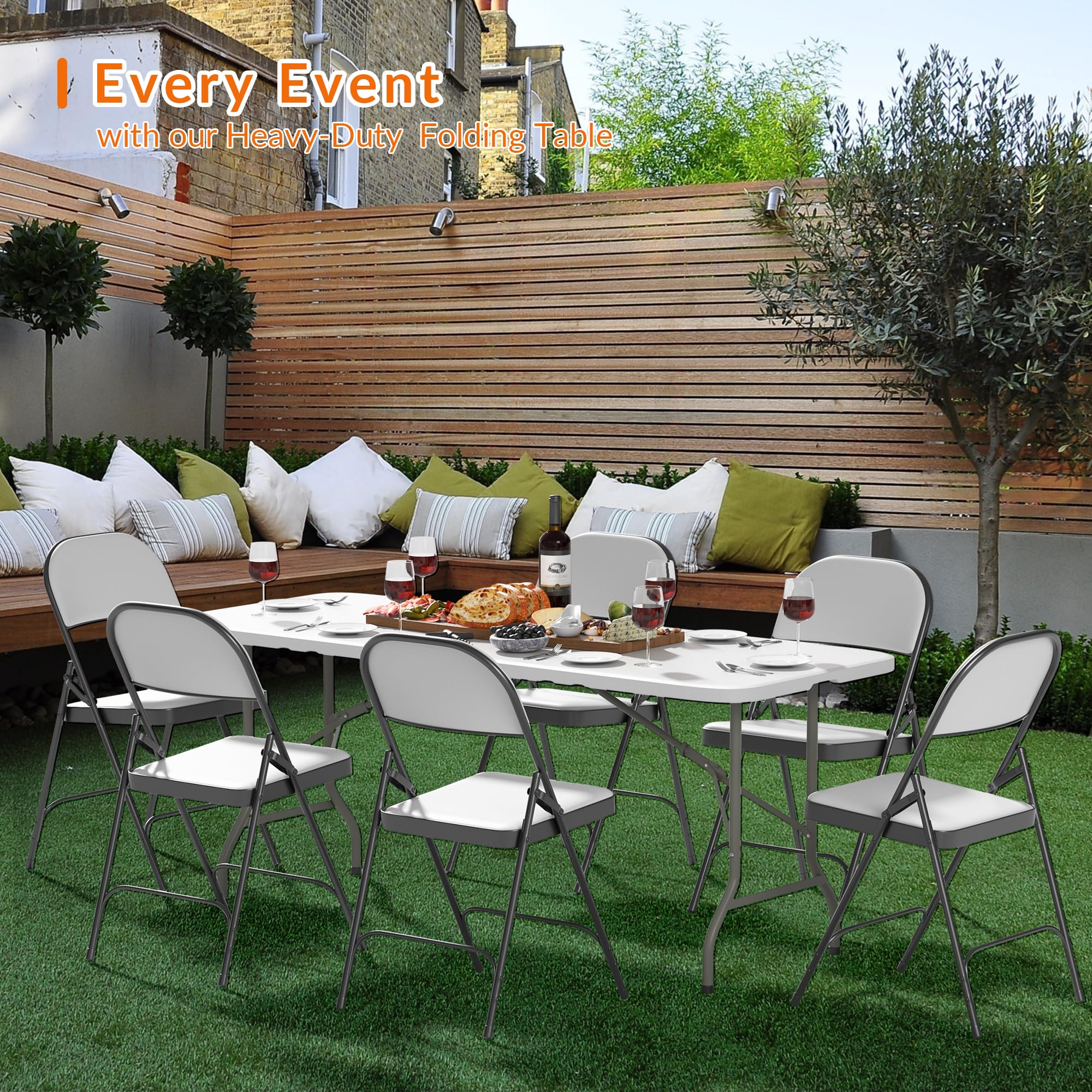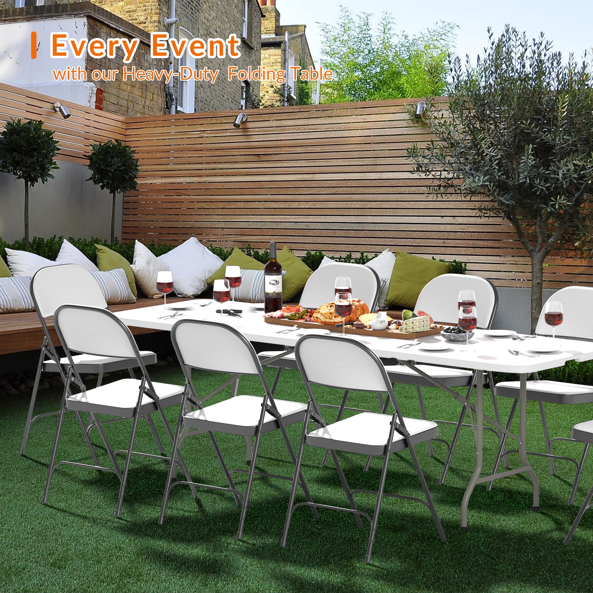 Heavy Duty Folding Table: Constructed with heavy-duty steel legs and a polyethylene plastic table top, this foldable table supports heavy loads for reliable and long-lasting use in a variety of conditions. Use it as a camping table for rugged terrain or as a spacious picnic table for family gatherings
