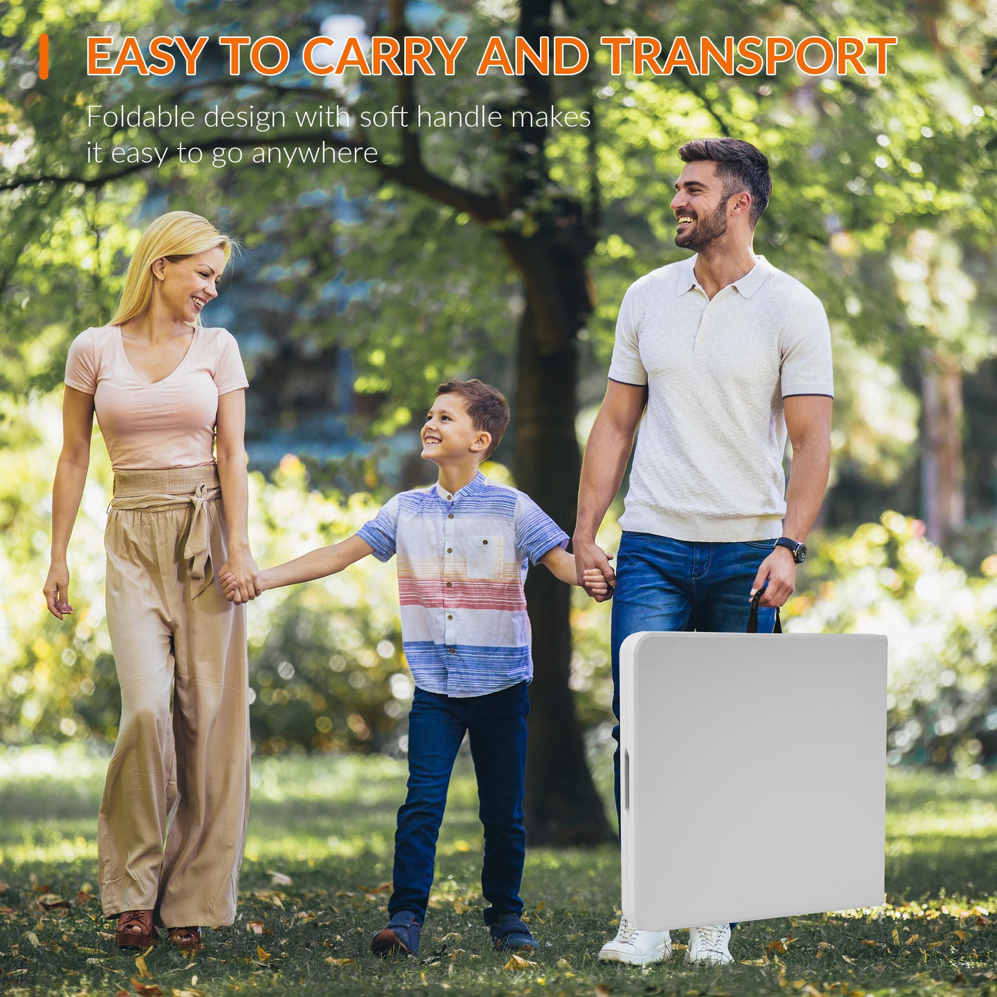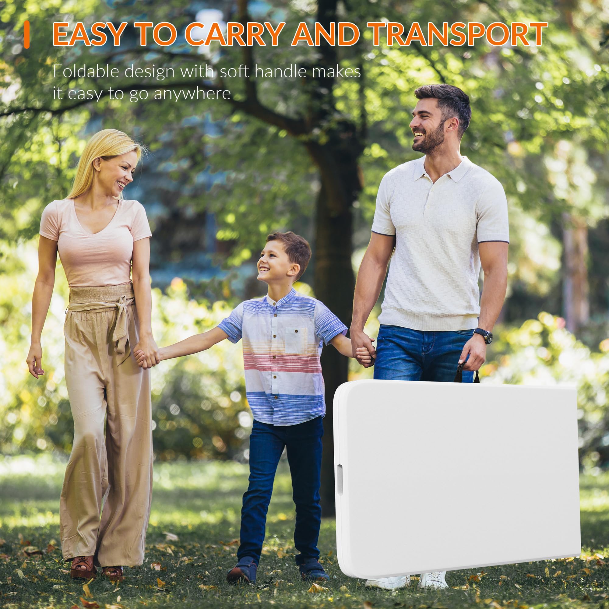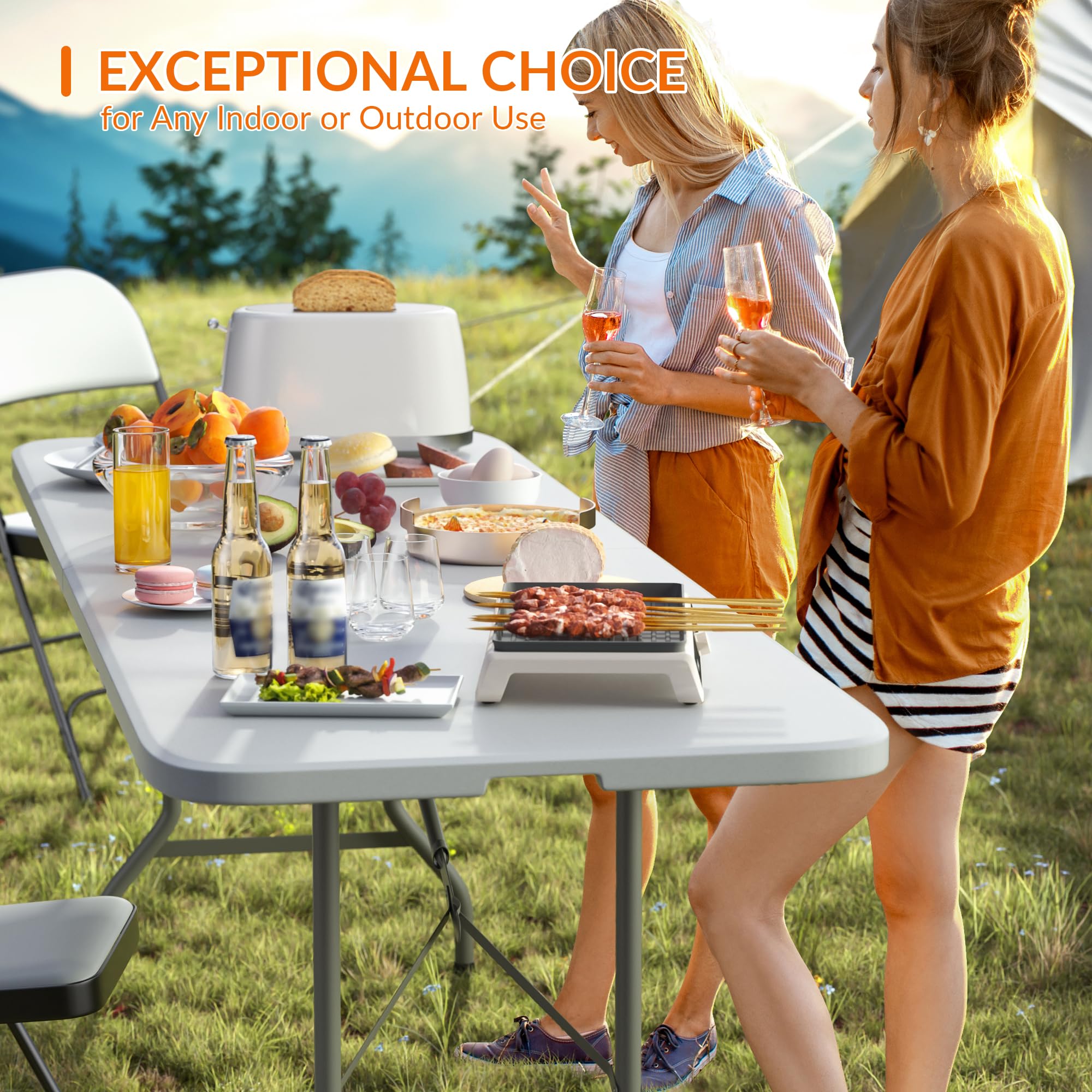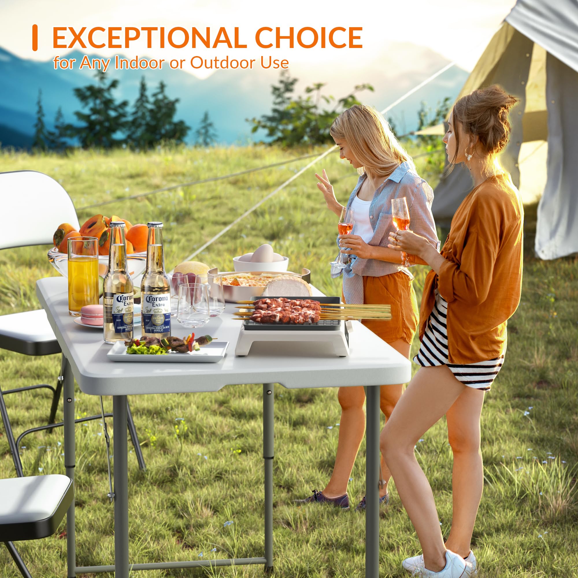 Heavy Duty Folding Table: Constructed with heavy-duty steel legs and a polyethylene plastic table top, this foldable table supports heavy loads for reliable and long-lasting use in a variety of conditions. Use it as a camping table for rugged terrain or as a spacious picnic table for family gatherings