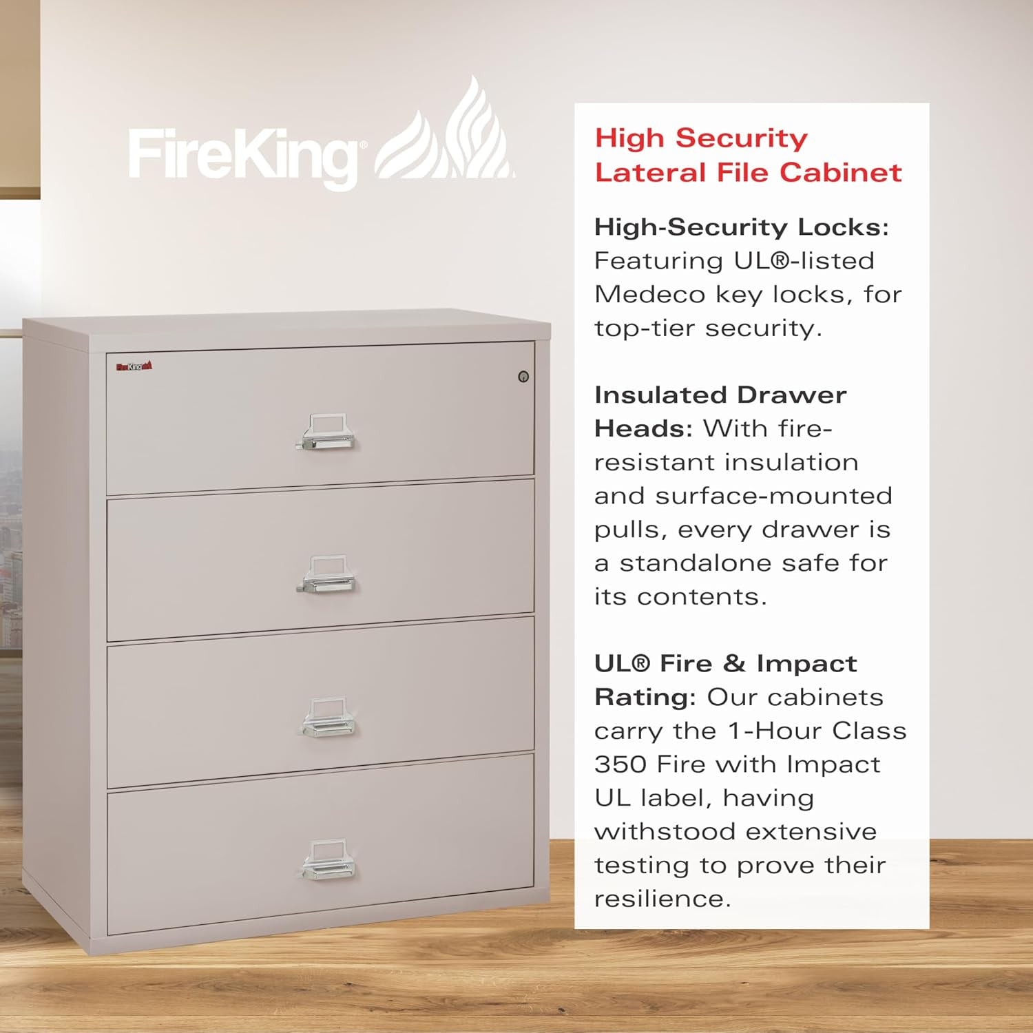 When you are protecting valuable documents you want the best. When it comes to fire protection, half as good is no good. It features four file drawers built with high sides for use with hanging folders and 1 follower block per drawer. 1 high-security UL listed key lock top drawer to control all drawers. Fireproof insulation is 100% gypsum reinforced by a 1” x 2” lattice made of 14-gauge galvanized welded steel wire, providing complete peace of mind from fire, impact, or explosion. 1-Hour Class 350 Fire with Impact UL label. Tests include 1 hour exterior file exposure at 1700°F, a 2000°F explosion test, and a 30 foot drop to test impact integrity. ETL Verified Listed Water Resistant means files are designed to prevent water damage resulting from sprinklers and fire hoses. ETL Verified Mark 1/2 hour fire protection for hard drives, CDs, DVDs, flash drives, and HIPPA documents. 2-position drawer catch allows access to certain drawers while others remain locked. Drawer heads are formed of welded steel and filled with fireproof insulation, and are field replaceable. Finish is an environmentally-friendly electrostatic powder coating applied to all sides, including bottom. The finish is scratch-resistant, providing a lifetime quality appearance. Fire king's Limited lifetime warranty on all mechanical or operable parts. Associated labor costs will be paid by FireKing for two years from the date of purchase. If your FireKing file sustains any damage while protecting documents from a fire, FireKing will replace the file free of charge.