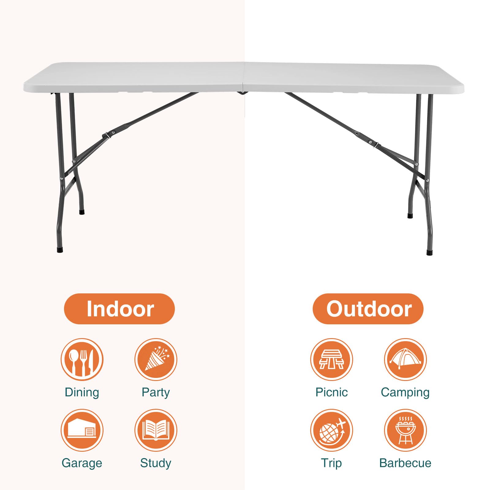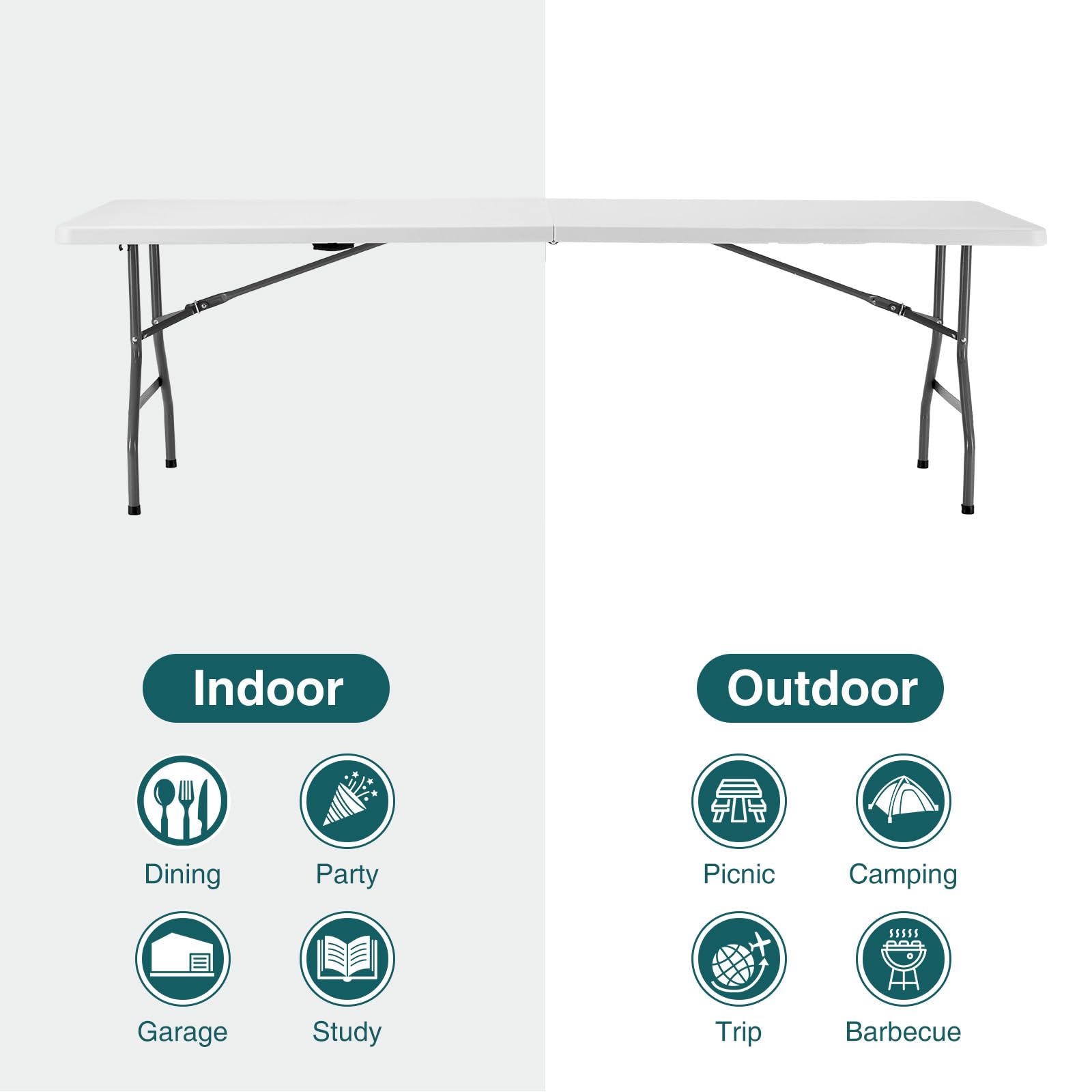 Versatile Application: The Sweetcrispy foldable table is perfect for a variety of uses. Indoors, it can serve as a dining table, game table, and more. Outdoors, it’s ideal for camping, BBQs, weddings, and other events.