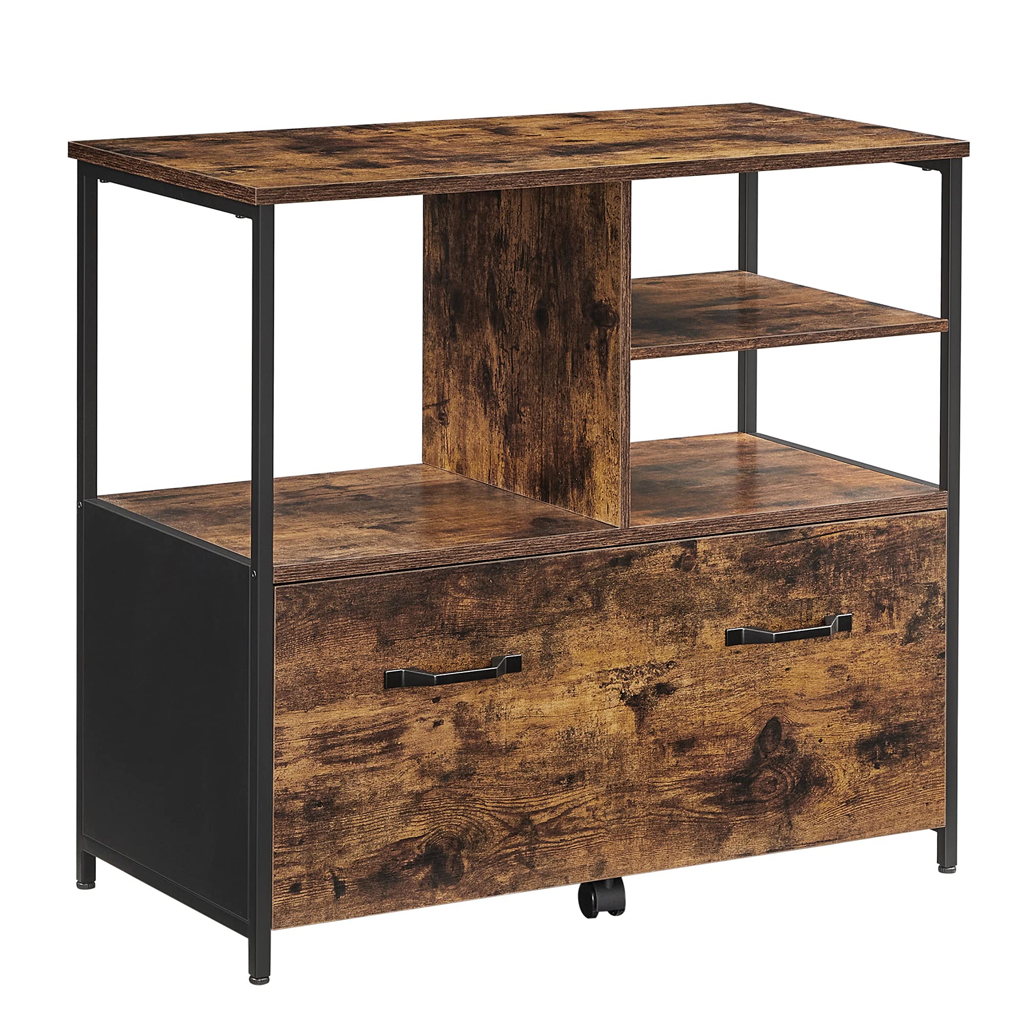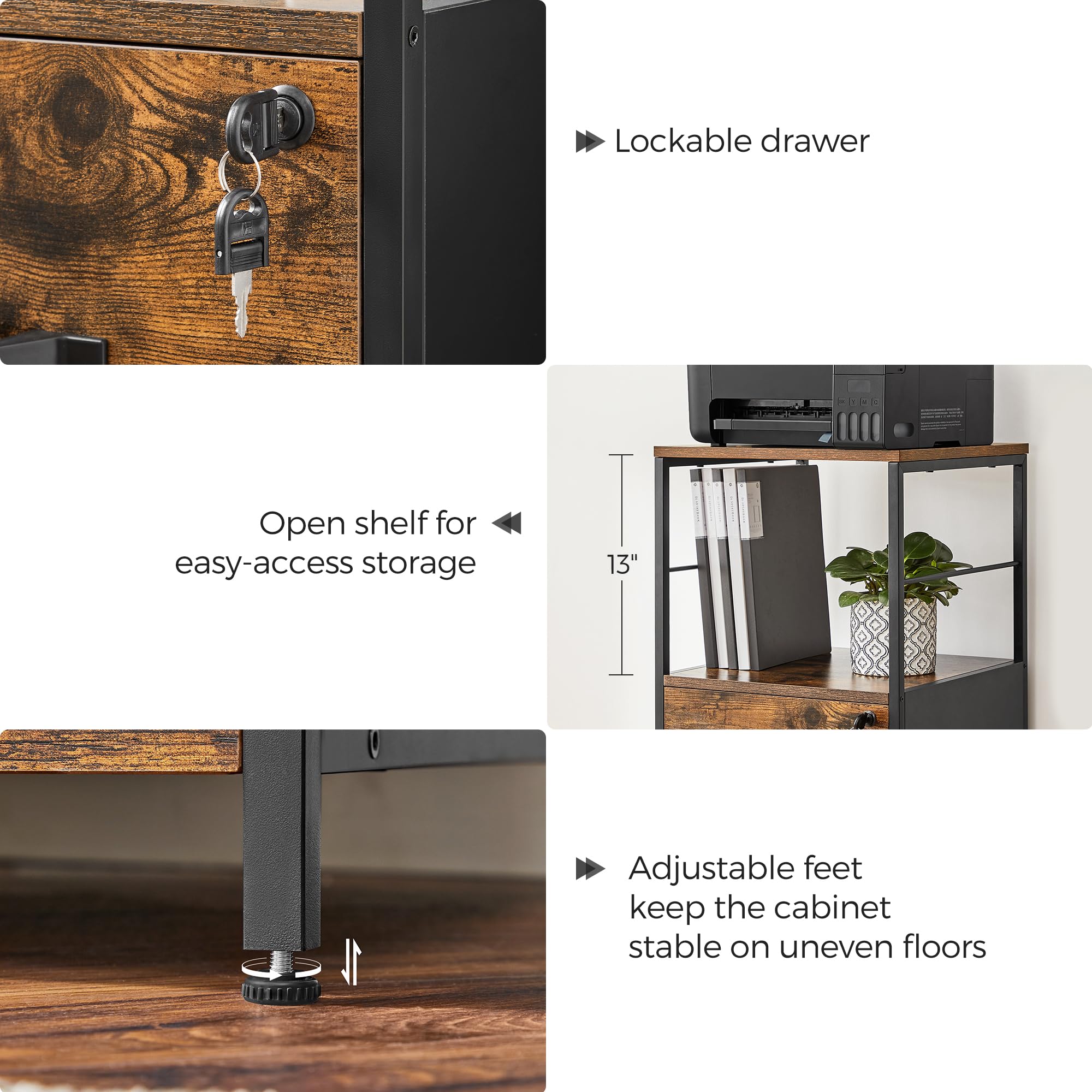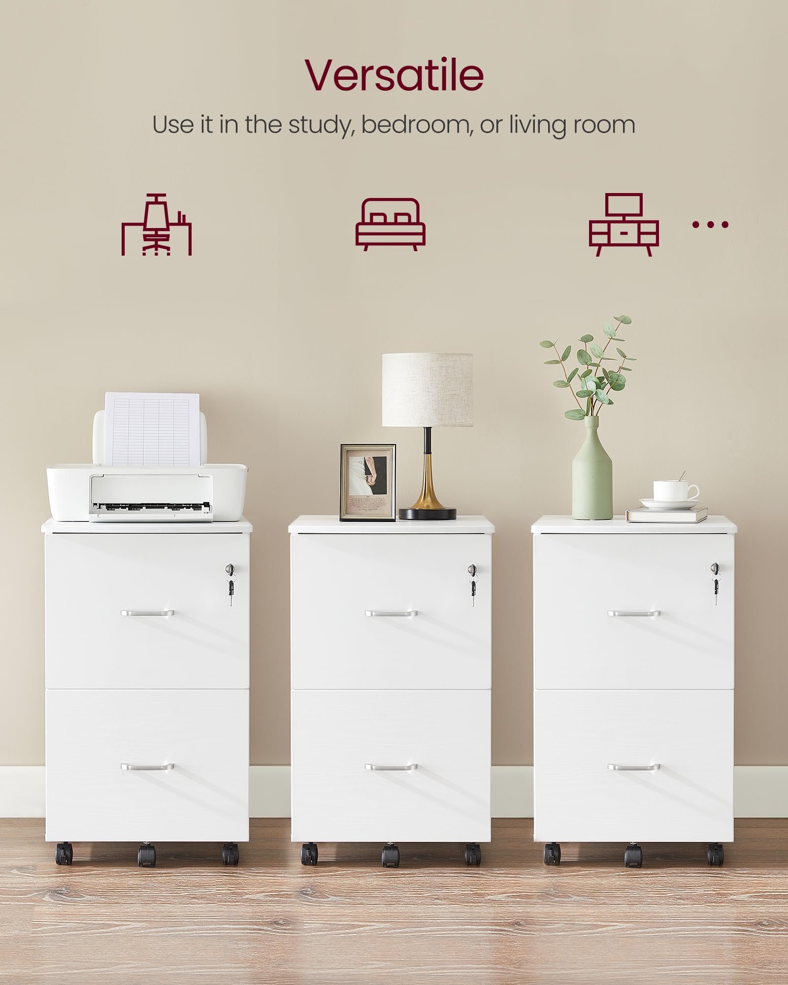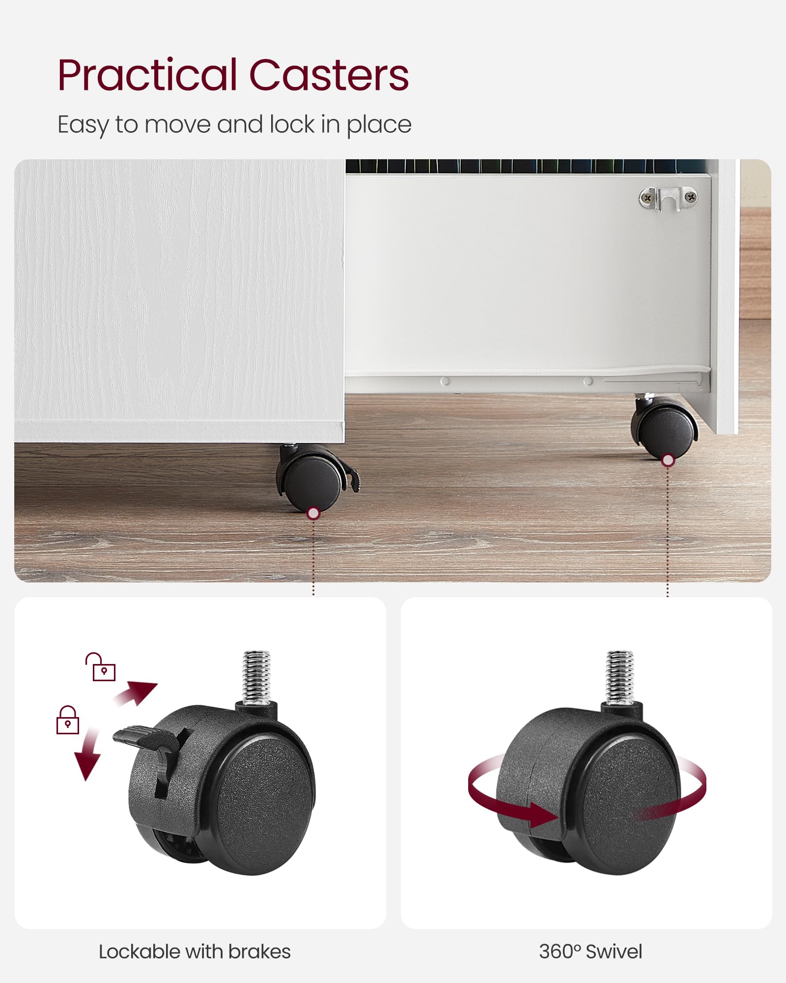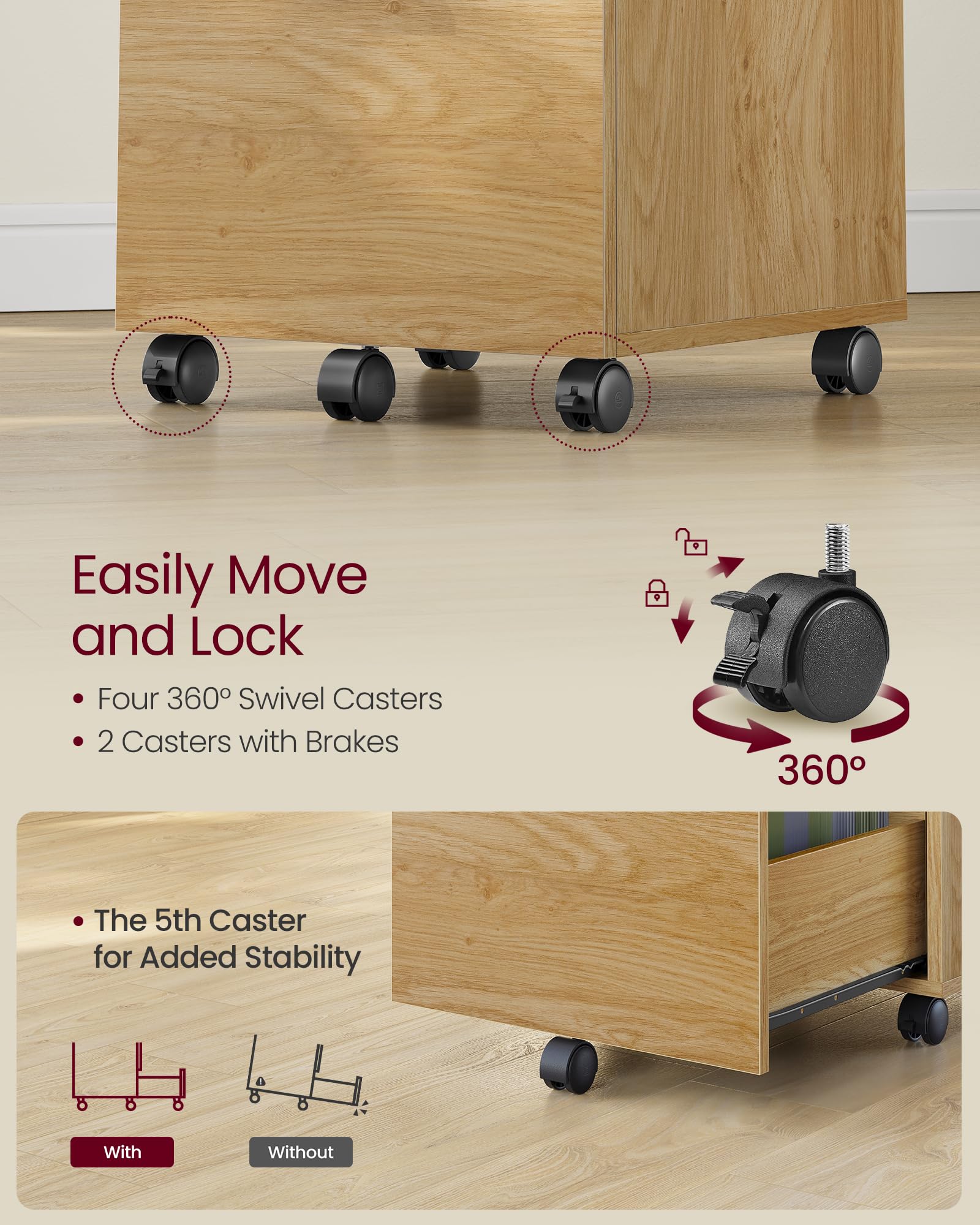 【LOCKABLE, SWIVEL CASTERS】Five 360° swivel casters allow you to move this filing cabinet around with ease. The 2 front casters are lockable to keep the cabinet in place when stationary and the fifth wheel on the bottom drawer adds to overall stability