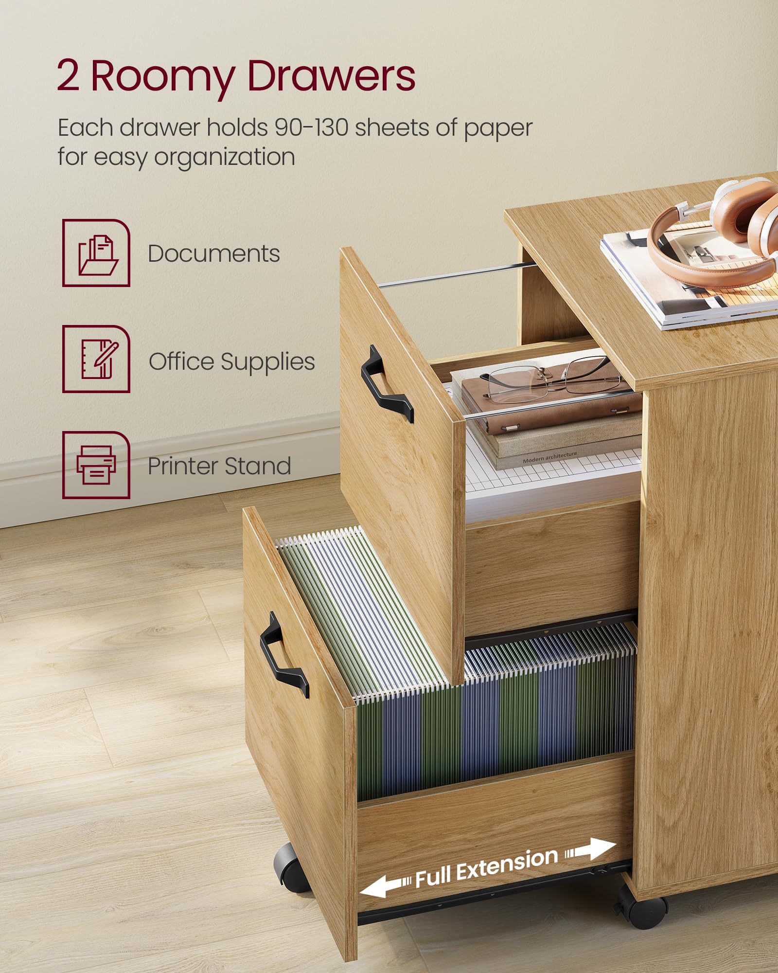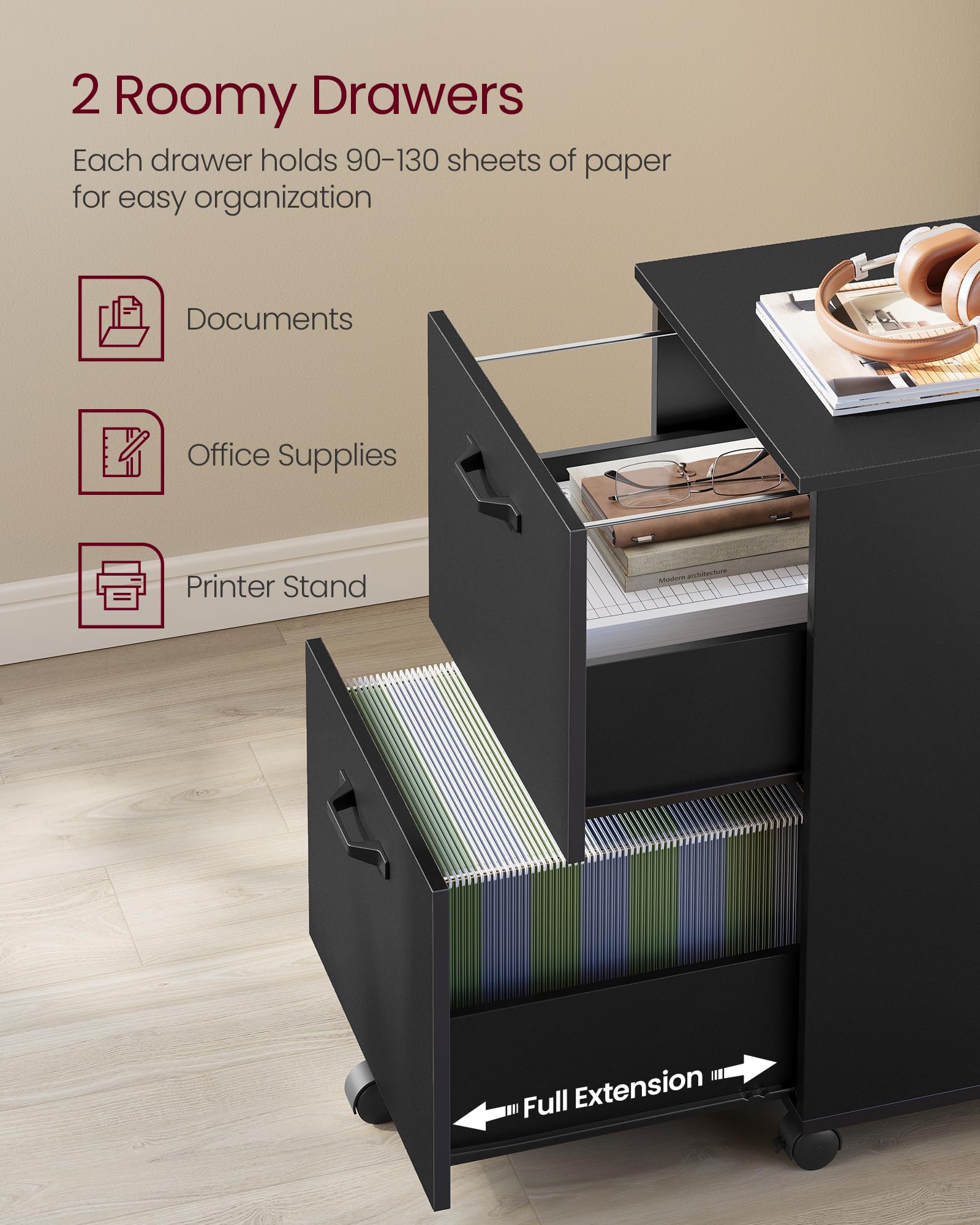 【PLENTY OF STORAGE】With 2 spacious drawers, this file cabinet can neatly store 90-130 sheets of documents in each, meeting your daily filing needs. Adjustable hanging rails inside the drawers fit both A4 and letter size folders