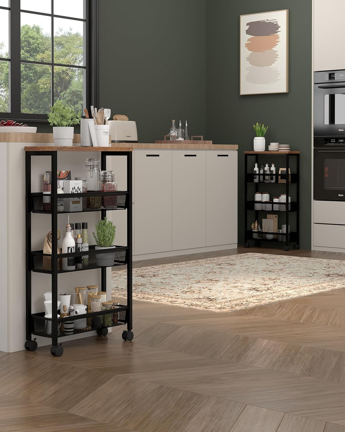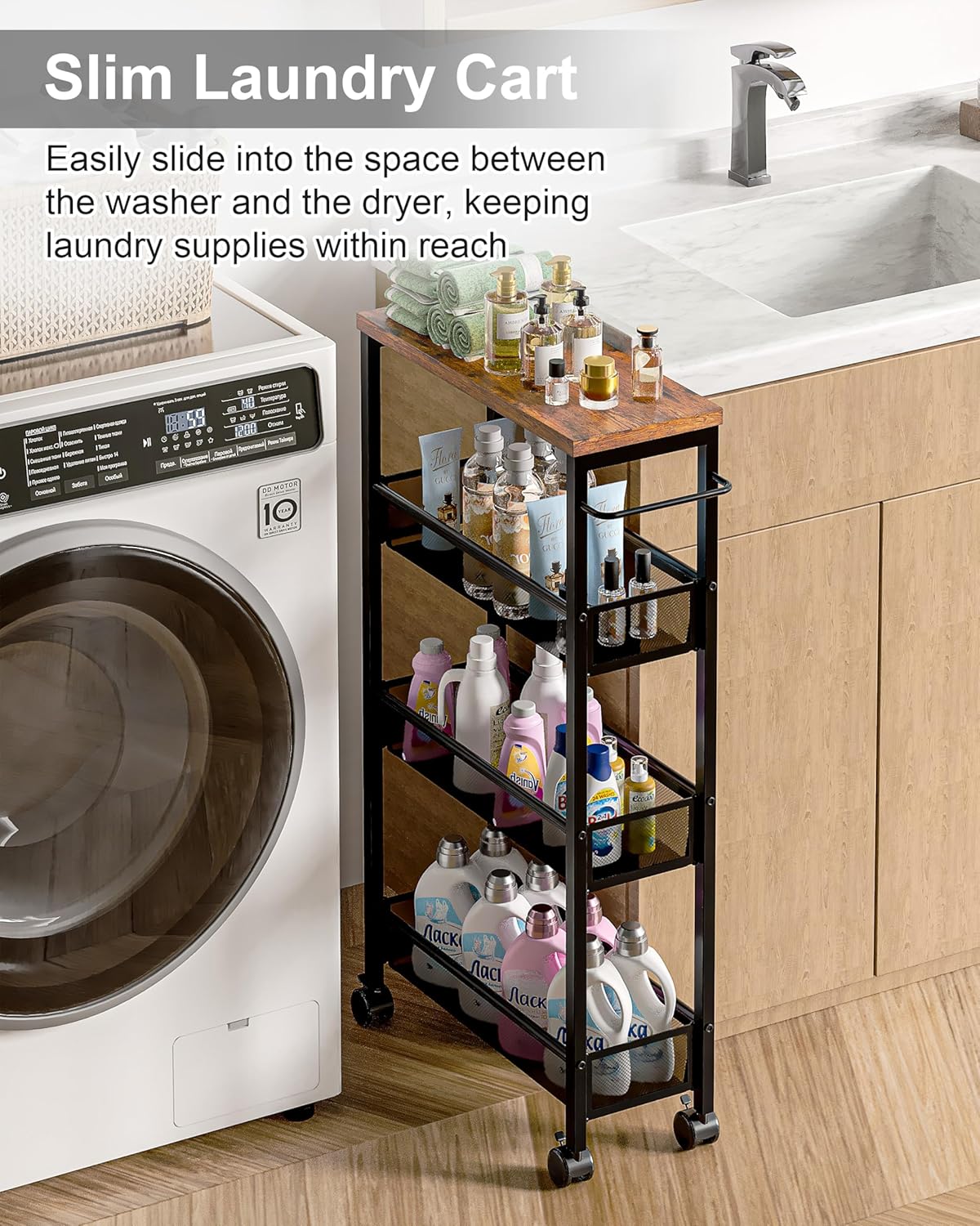 Ultimate Space Saver: This 17.9*7.1*34 inch slim rolling storage cart is designed for slim spaces, fit beside the fridge, washer or in cabinet gaps. Perfect gap filler for unused corners