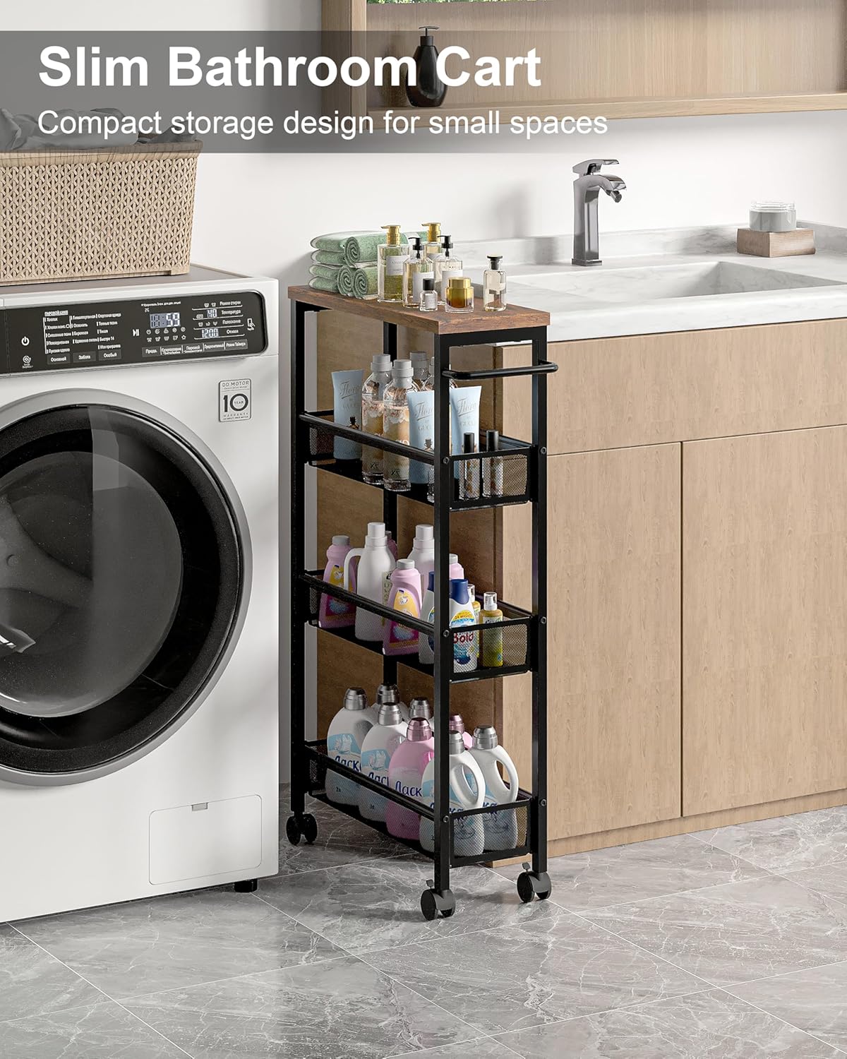 VECELO 4 Tier Slim Rolling Cart Organizer, Rolling Carts On Wheels with Storage, Sturdy Metal Frame Narrow Cart with Handle, Space Saving for Kitchen, Bathroom, Laundry, Rustic Brown