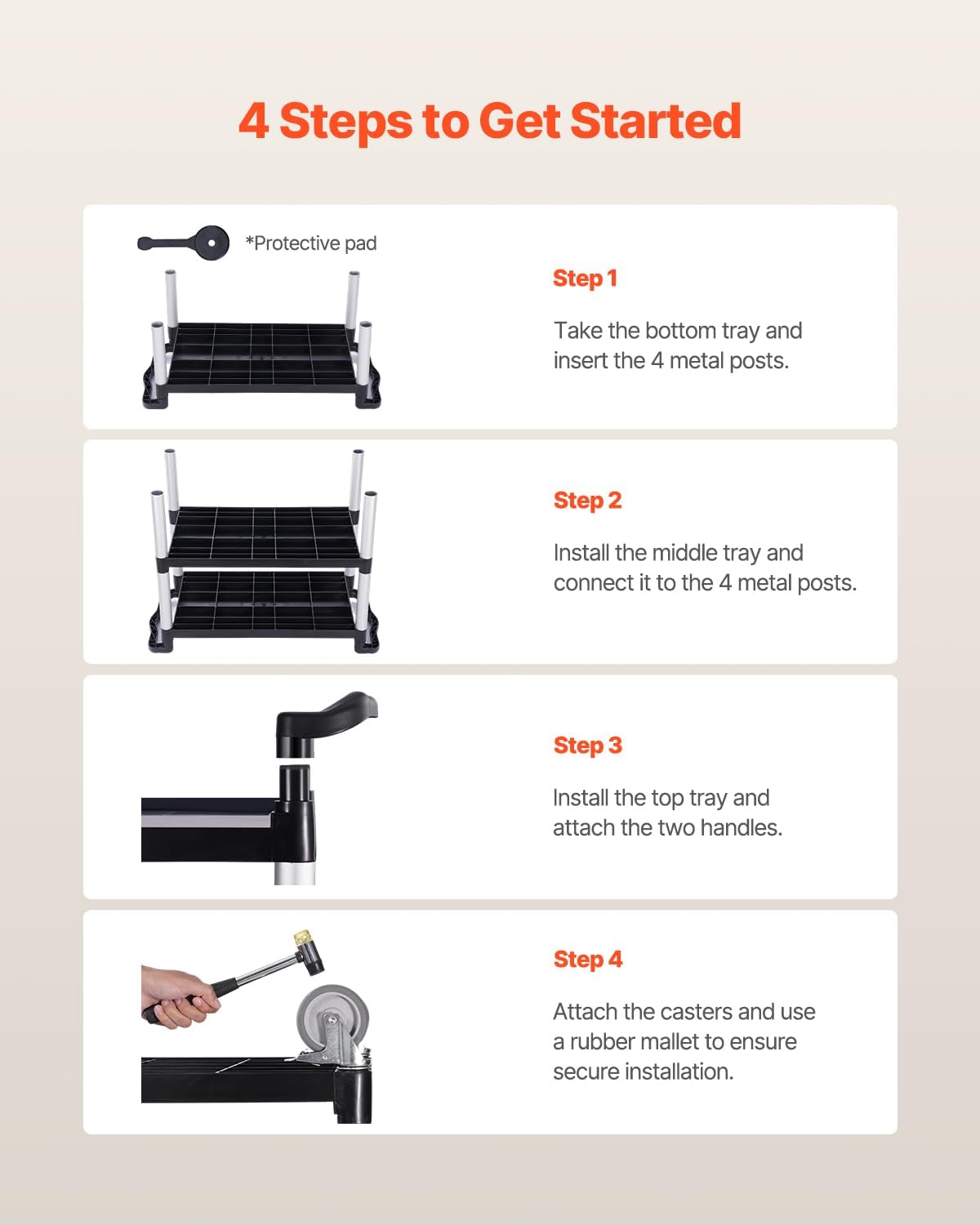 Quick Assembly: With clear instructions, assembling this rolling utility cart is quick and easy, making it great for use in the garage, office, or home to organize and transport items.