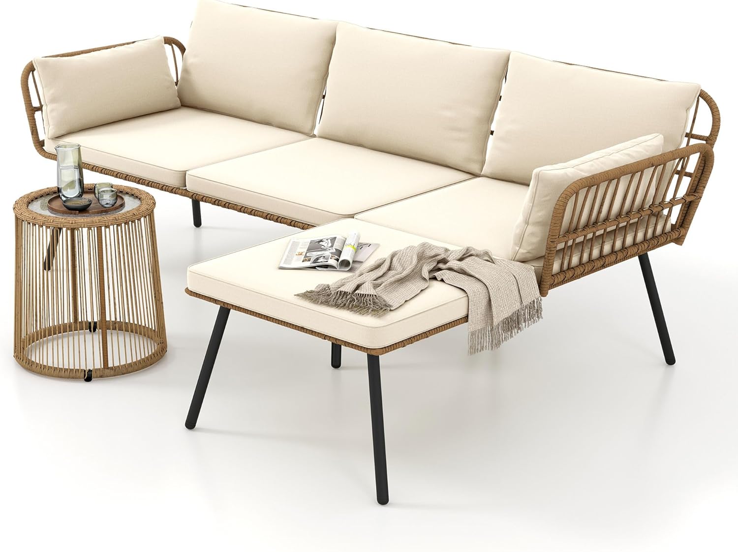 DWVO Patio Furniture Set 3 Piece Outdoor Wicker Conversation Set with Detachable Cushions and Coffee Table L-Shaped Sectional Sofa Set Outdoor Furniture Set for Backyard Porch Deck - Beige