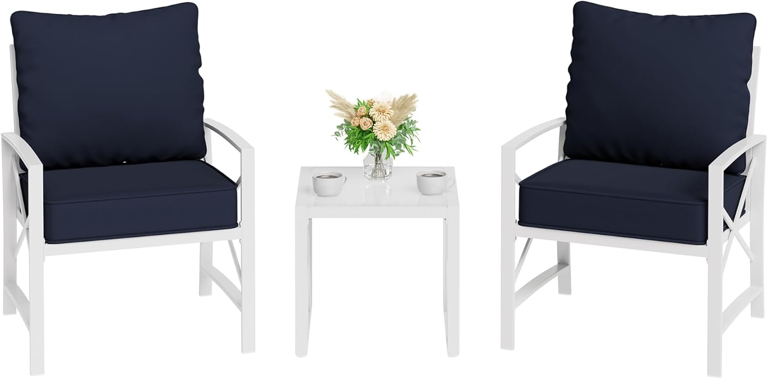 The patio furniture set includes 2xSINGLE CHAIR and 1xCOFFEE TABLE.The outdoor metal patio set with a stylish black finish and floral wood handrail design is not only elegant and modern, but also easy to clean.