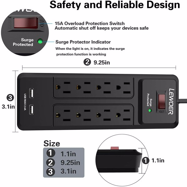 ❤SMART CHARGING USB PORTS - The power surge protector having 2 USB fast charging ports with smart IC technology, auto-adjust current according to your devices needs and provides the fastest charge speed up to 2.4A each port. Fast and efficient charging for your smartphone, tablet and other USB mobile devices.