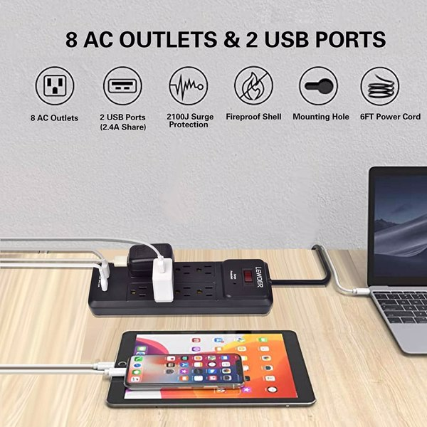 ❤POWERFUL SURGE PROTECTOR - The power strip surge protector has 8 AC outlets (maximum rated power is 1875W, 125V/15A ), 2 USB charging ports Outlets (5V/3.4A/17W), surge protector (2100 Joules) with overload protection prevents spikes and fluctuations.