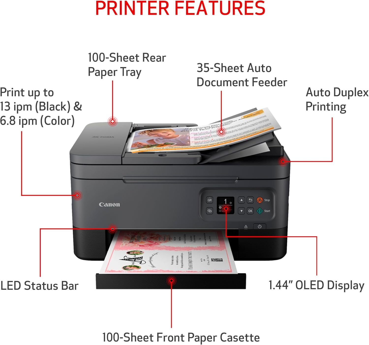 Use this TR7020A Wireless All-In-One Printer to meet your home and work needs when printing, copying or scanning. Printer handles a variety of tasks from scanning signed contracts with the auto document feeder to printing from your smartphone. It's easy to set up, simple to use and feature-rich - with a 1.44" OLED display, front/rear paper reader and auto-duplex printing. Front/rear paper feed holds plain paper in the front cassette, and rear tray extends to print on photo paper or other paper types. Enjoy sharp, black text for documents and great-looking photos thanks to the hybrid ink system. It prints a 4" x 6" photo in approximately 43 seconds and generates 6.8 ipm (color). When copying, it makes up to 99 copies in 6 ipm (color). The 35-sheet ADF copies and scans multiple documents with ease. Printer's resolution is up to 4800 x 1200 dpi. Standard interface uses Hi-speed USB, wireless PictBridge, Wi-Fi and Bluetooth 4.0 LE. Paper Capacity: Rear Paper Tray: 100 Sheets of Plain Paper OR 20 Sheets of 4 x 6 / 10 Sheets of 5 x 7 Photo Paper Front Paper Cassette: 100 Sheets of Plain Paper
