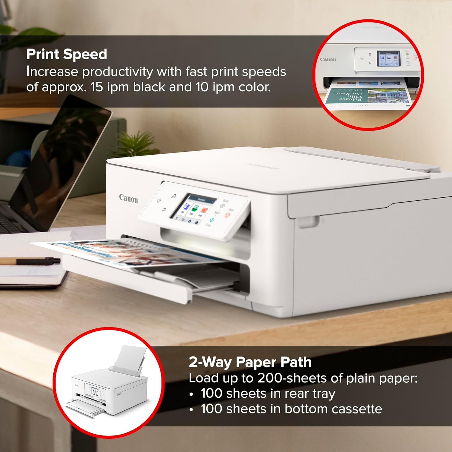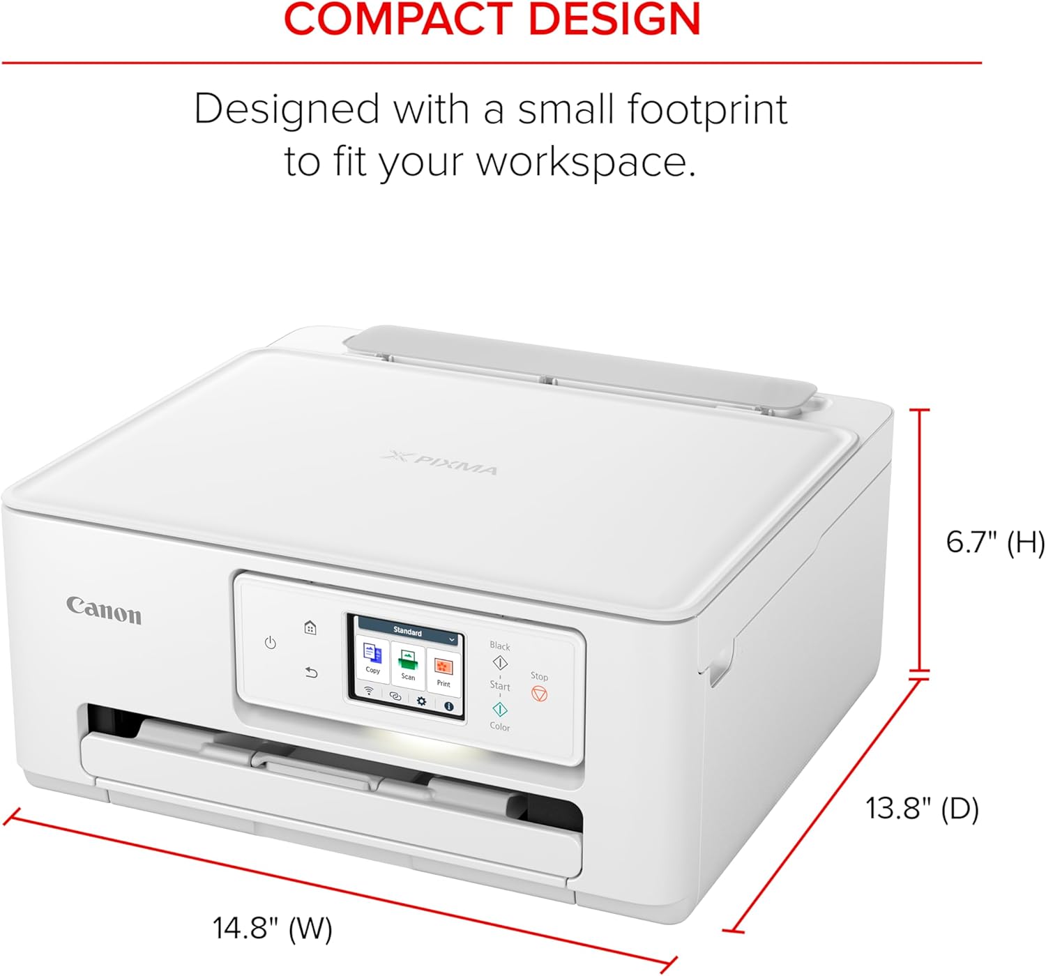 Designed for home use, the Canon PIXMA TS7720 All-in-One inkjet printer delivers high-quality printing and outstanding wireless connectivity in a compact size. The PIXMA TS7720 is easy to set up and maintain and offers great media versatility to print on a variety of media types and sizes, including photo paper, envelopes, borderless photos, banners and more. Use Poster Artist Online to create professional-posters, banners and signage. Print both documents and photos on a variety of paper types using a hybrid ink system with pigment black for sharp black text and dye-based colors for vivid photos up to 8.5” x 11”. Produce crisp, colorful documents and photos quickly and cost-effectively with fast print speeds and high-quality 2 cartridge FINE Hybrid ink system. Keep printing with a plain paper capacity of up to 100 sheets in the standard cassette, and 100 sheets in the rear tray. Easily connect and print through high-speed USB or wirelessly from computers or mobile devices. This comes with a 1-year limited warranty and is backed by Canon's Service and Support network.