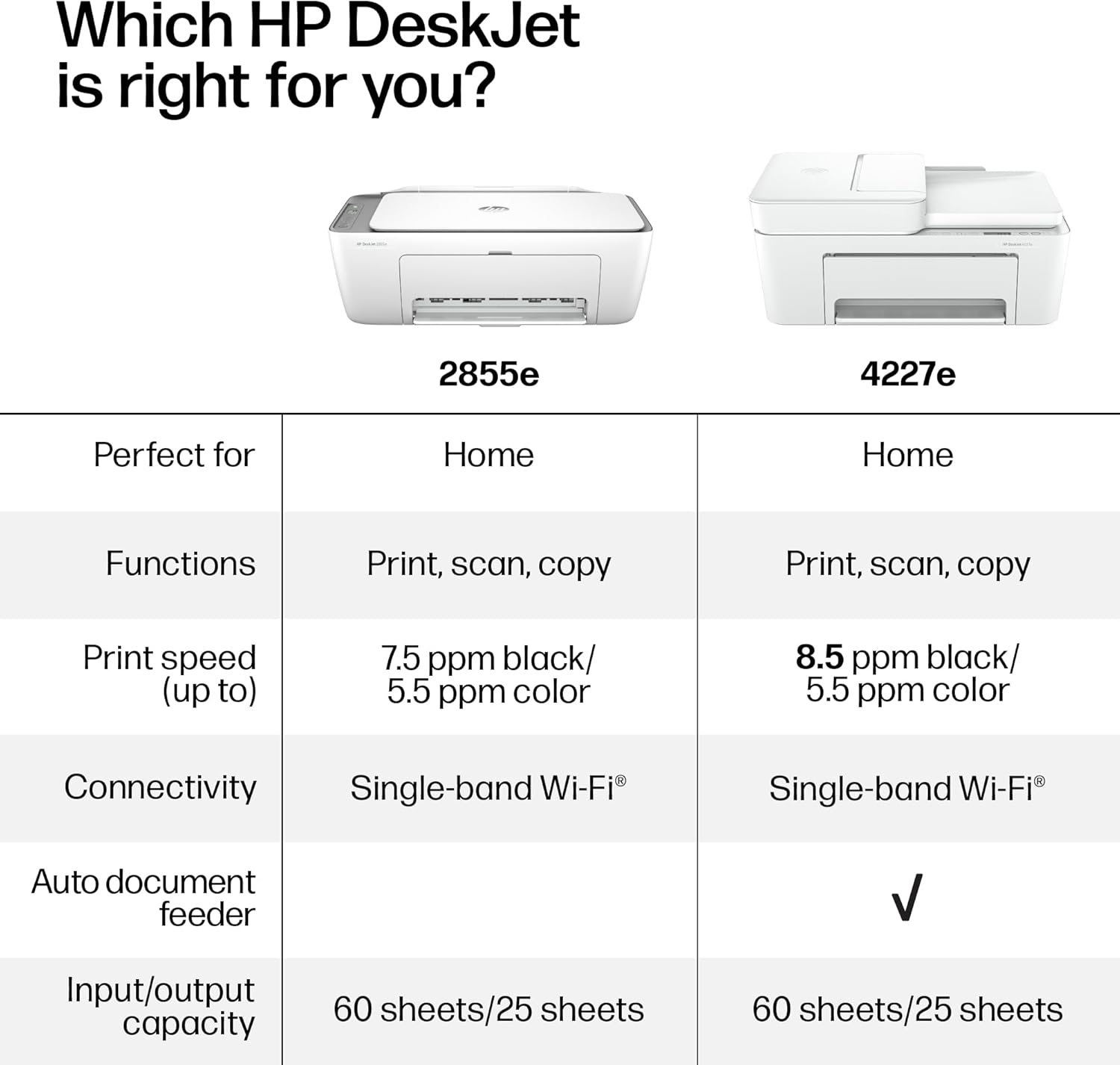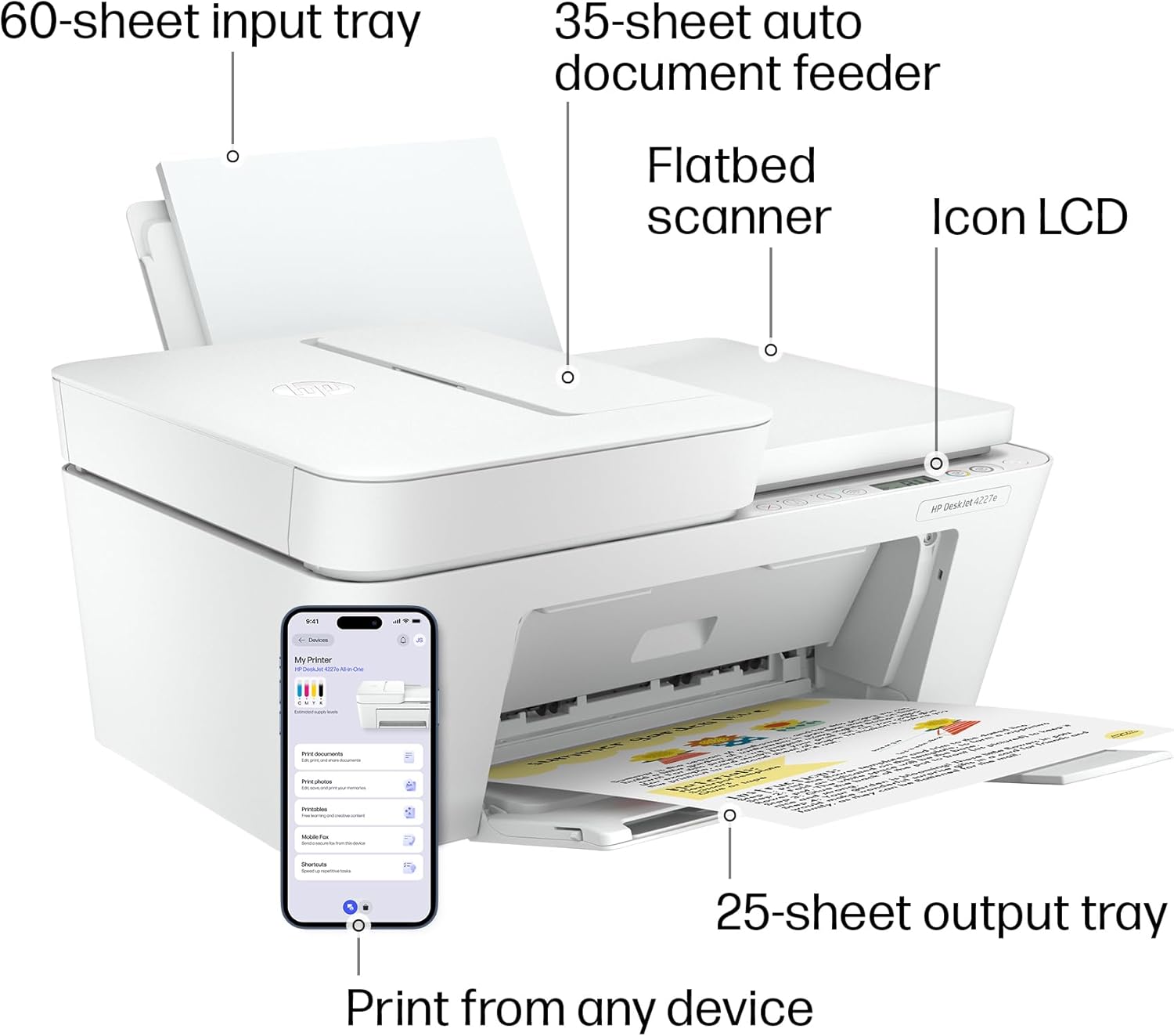 The HP DeskJet 4227e delivers color printing, 60-sheet paper capacity, and an auto document feeder for easy scanning and copying. It includes 3 months of Instant Ink with HP+ activation at printer setup. It's also AI-enabled to intuitively adapt to your workflow, with wireless and security features that keep your multifunction printer up to date and secure.