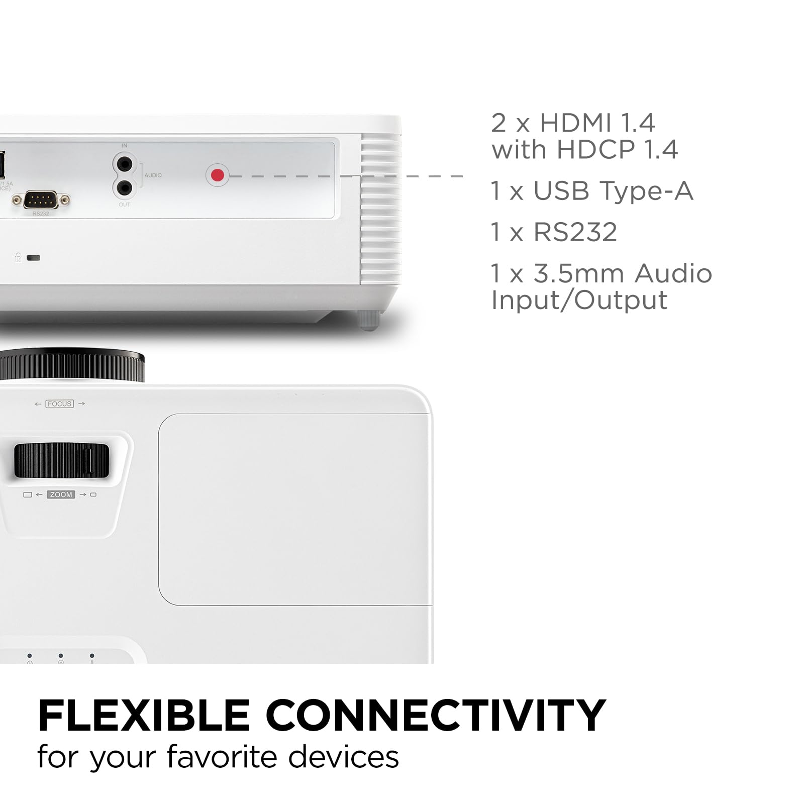 The PA503HD is a 4,000 ANSI Lumens lamp projector ideal for home and business use. Featuring a 1080p FHD resolution and up to 300” ultra-large projection, it showcases clear and vivid visuals for presentations and vedio. With a high native contrast ratio achieved through its 0.65” DMD chip, this projector showcases captivating visuals even with low-light vedio scenes. It offers two HDMI ports for easy multimedia connectivity. Designed for enhanced functionality, it includes a USB-A output to power HDMI wireless dongles, eliminating the need for extra adapters. Whether tilted up or down, the auto V keystone feature ensures automatic image correction, keeping perfectly-aligned visuals. Maintenance is hassle-free – simply use a laptop and USB cable for software updates.