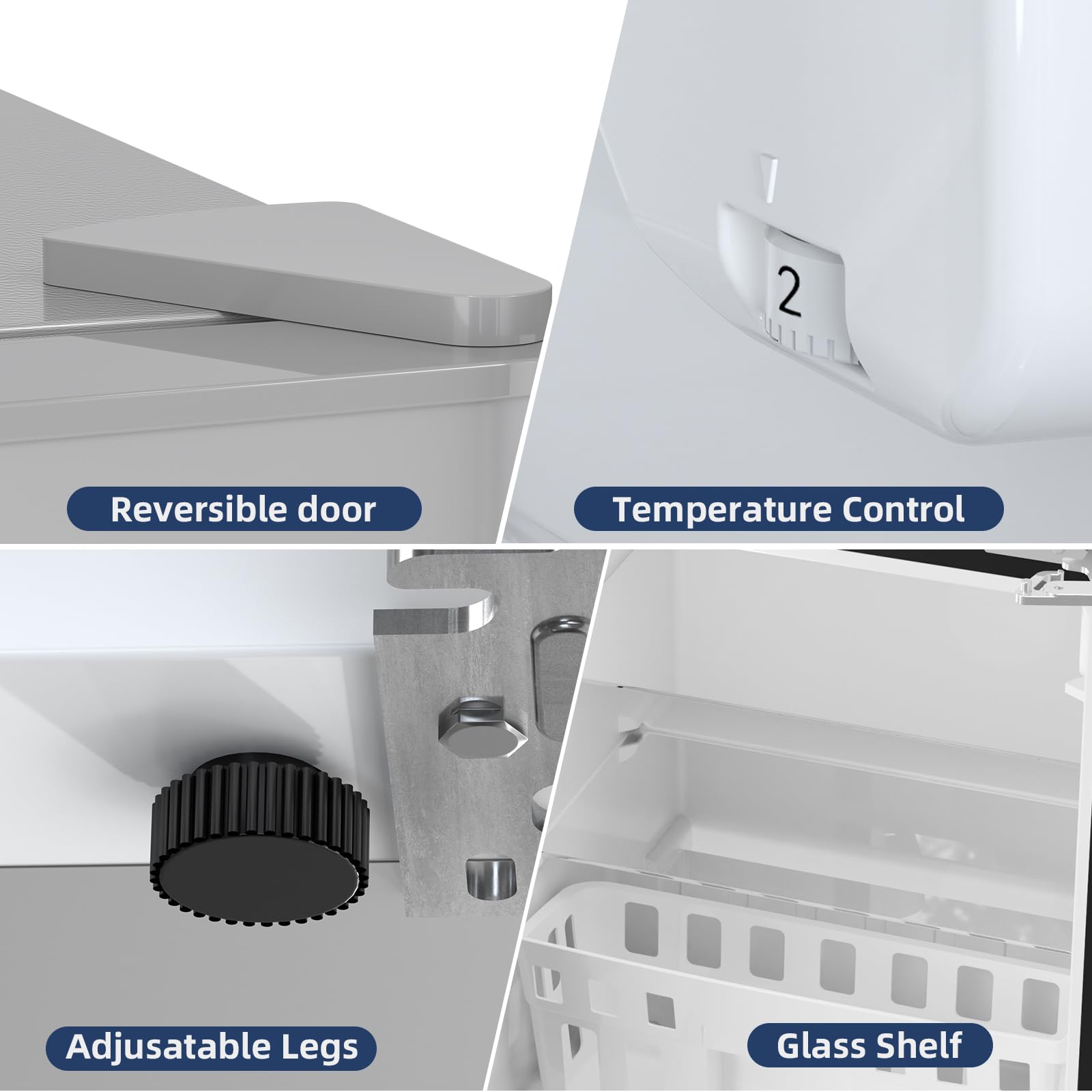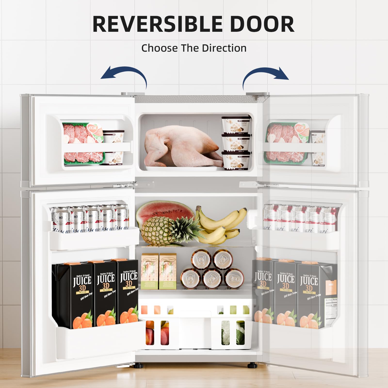 • Multi-Function Storage-Double Door Design: freezer compartment can be used for storing frozen foods or making Ice cubes. The door offers a spot for your favorite canned beverages.There are fresh fruits you like to eat in the drawer, sweet ice cream in the frozen area.