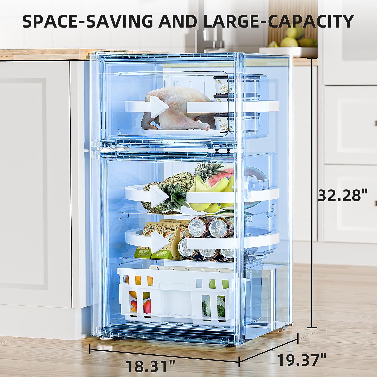 • Size and Capacity-Dimension: 19.37''(D)×18.31''(W)×32.28''(H) and 3.2cu.ft capacity. Sufficient space to store your eggs, vegetables, drinks,fruits and milk. 120 cans standard (330ml) beverage storage.