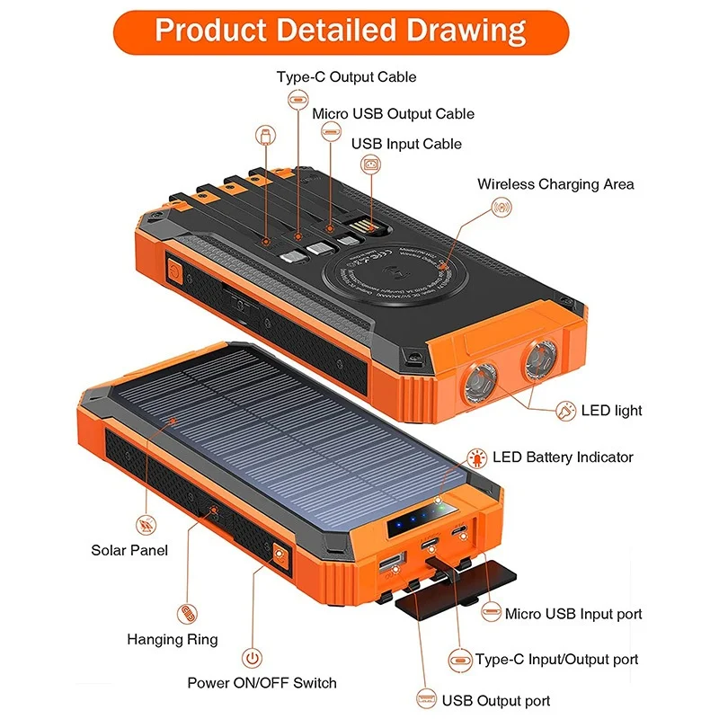20000mAh Waterproof Outdoor Solar PowerBank Portable Dual USB with 4 Cables and Micro USB Interface Wireless Travel Charger-4