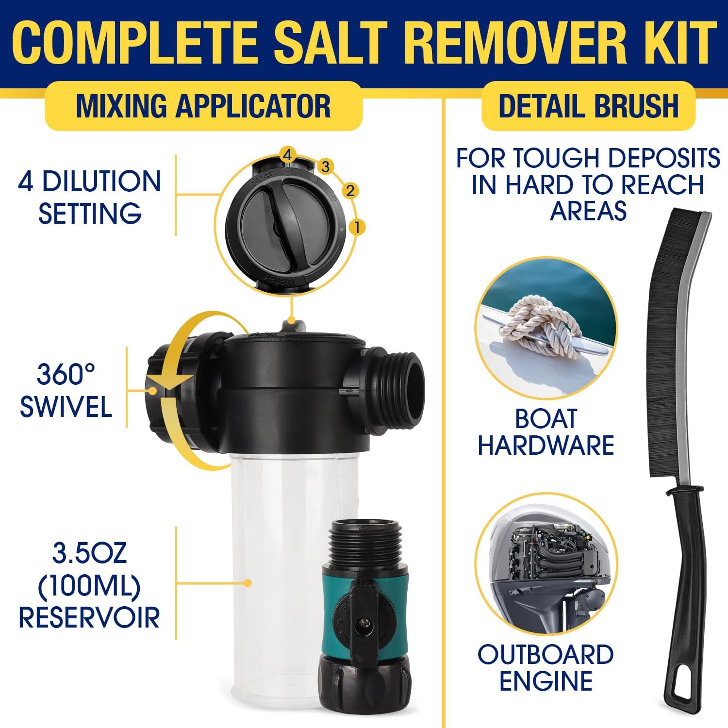 COMPLETE SALT REMOVER KIT – Comes with a mixing applicator that easily connects to any standard garden hose, offering 4 dilution settings for fast, effective coverage. Includes a detail brush to tackle stubborn deposits in hard-to-reach areas. This boat salt remover doubles as an engine flush kit—just spray, wait, and rinse
