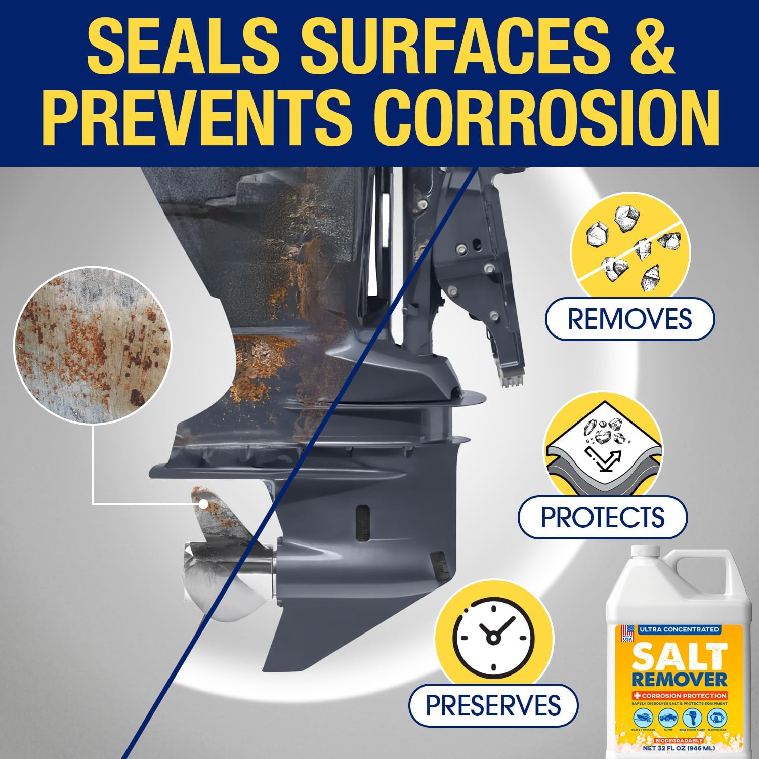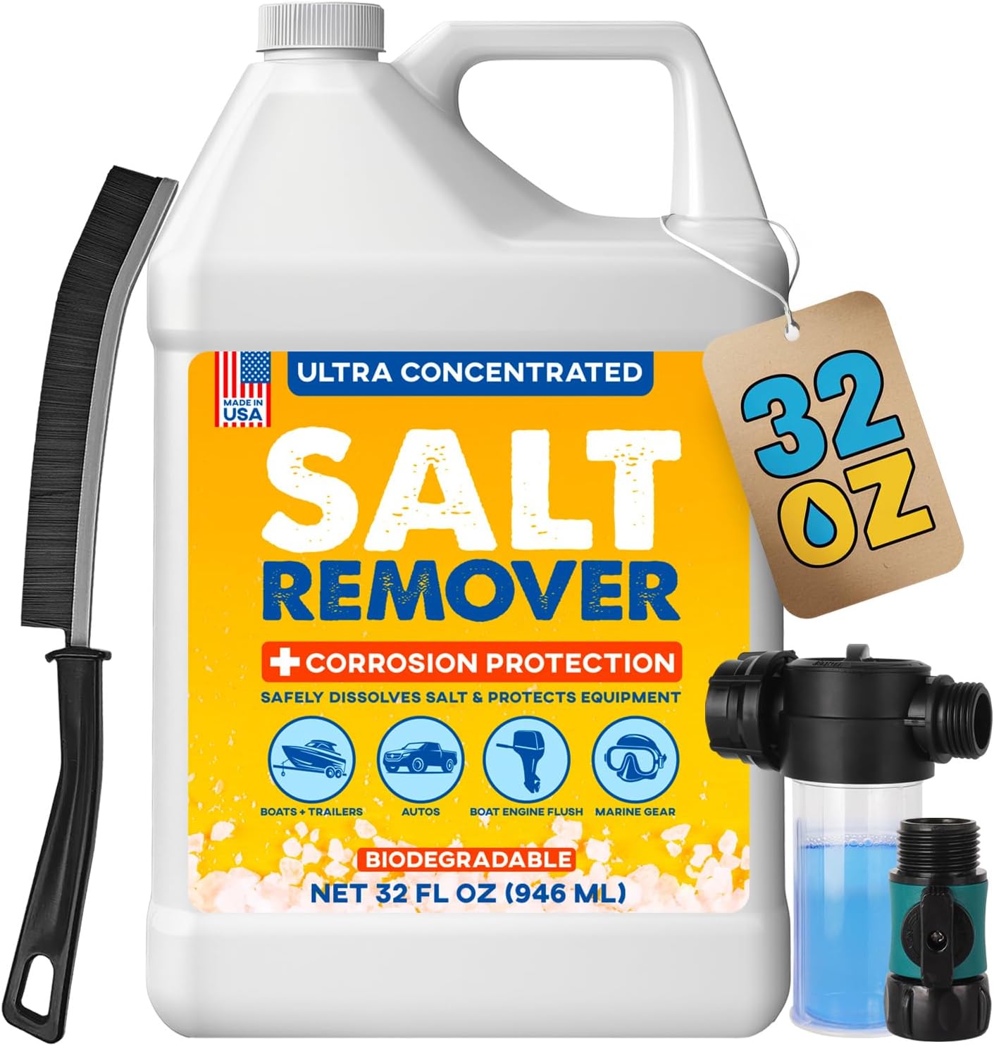 Concentrated Salt Remover Flush Kit + Corrosion Protection – Made in USA | Salt Cleaner Ideal for Boats, Cars, Marine Engine & Outboard Motor Flush, Washes Salt Away from Vehicles, & Trailers | 32 oz