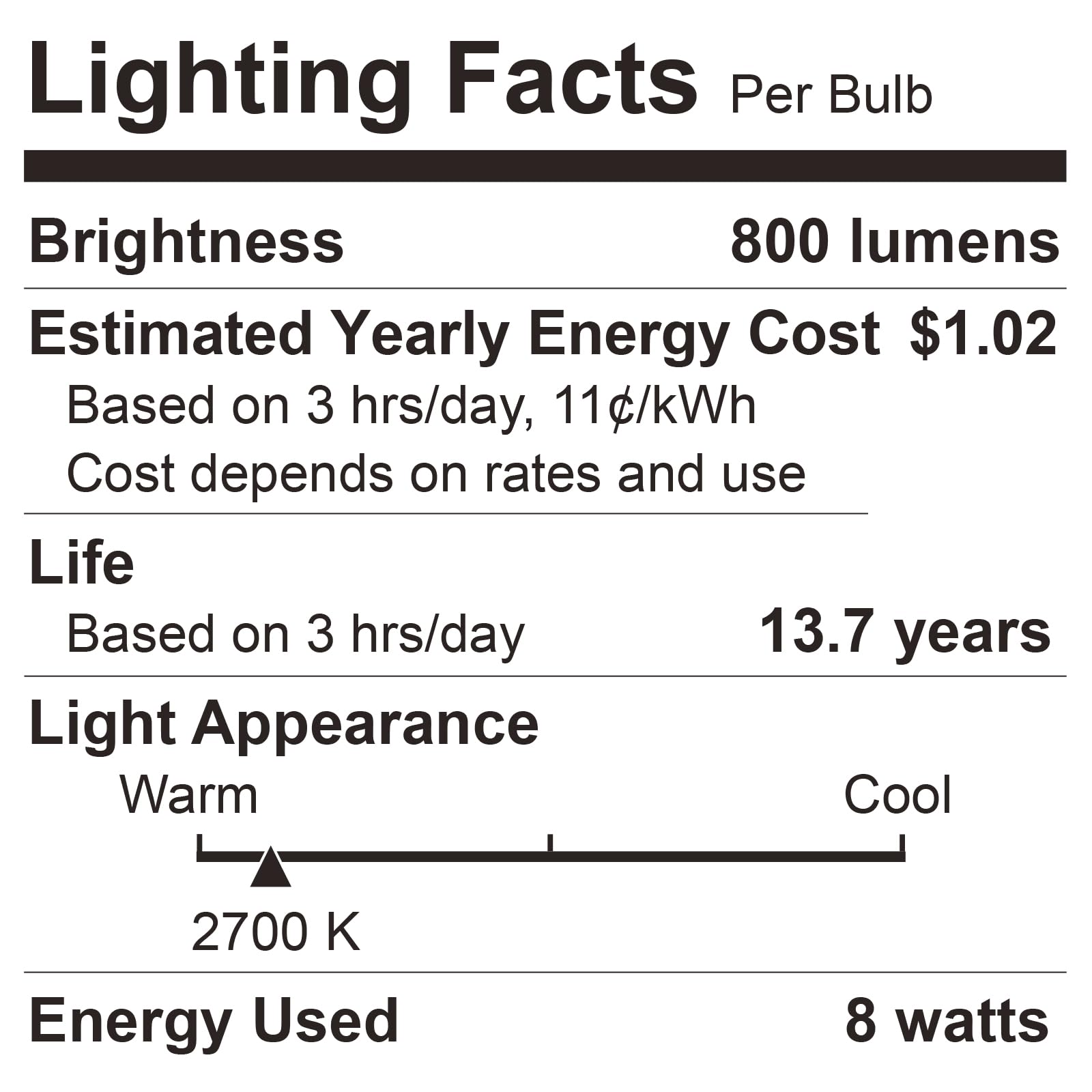 | Special Feature | ★ 2700K Soft White ★ 800 Lumens ★ 60 Watts Equivlent ★ 8 Watts ★ 15000+ Hours Lifespan ★ E26 Medium Standard Base ★ High CRI 80+ ★ Non-dimmable ★ Instant On ★ Less Heat Output ★ Flicker-free ★ 90% energy saving See more |