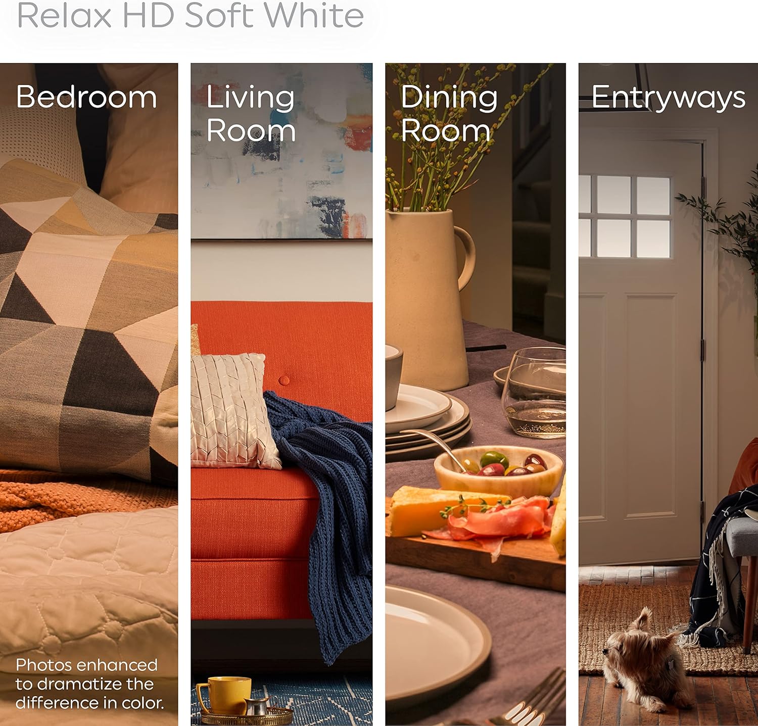 The GE Relax HD Soft White Light Bulbs are improved, energy-saving LED bulbs that enhance home decor and the appearance of colors. Experience the difference with bolder colors and enhanced contrast vs standard LED white light bulbs. Dim the lights and set the right mood for any occasion with these dimmable light bulbs. Our high-definition light bulbs offer a warm, soft white light that is perfect for comfortable moments and cozy spaces. We recommend these HD bulbs for use in spaces like bedrooms, family rooms, dining rooms, and entryways. These energy-efficient soft white bulbs replace 60-Watt bulbs and are rated to last up to 13.7 years based on 3 hours of daily use, saving you money for years to come.