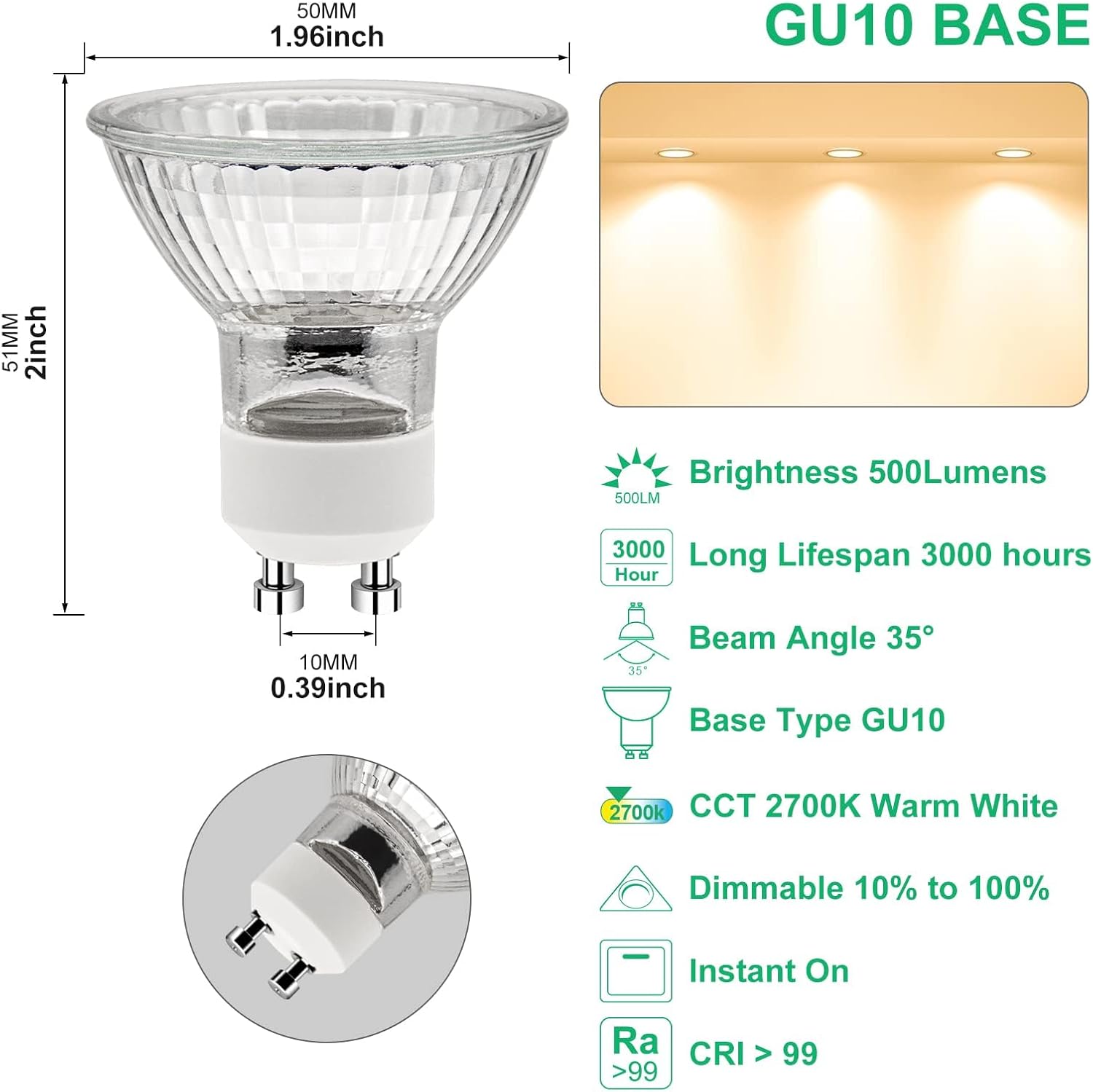 Warm White 2700K: Emitting a high output of 290 lumens, this GU10 Bulb provides a bright warm white light at 2700K, creating a cozy and inviting atmosphere. The CRI up to 99 restores the real color of objects, making the illuminated area more colorful.