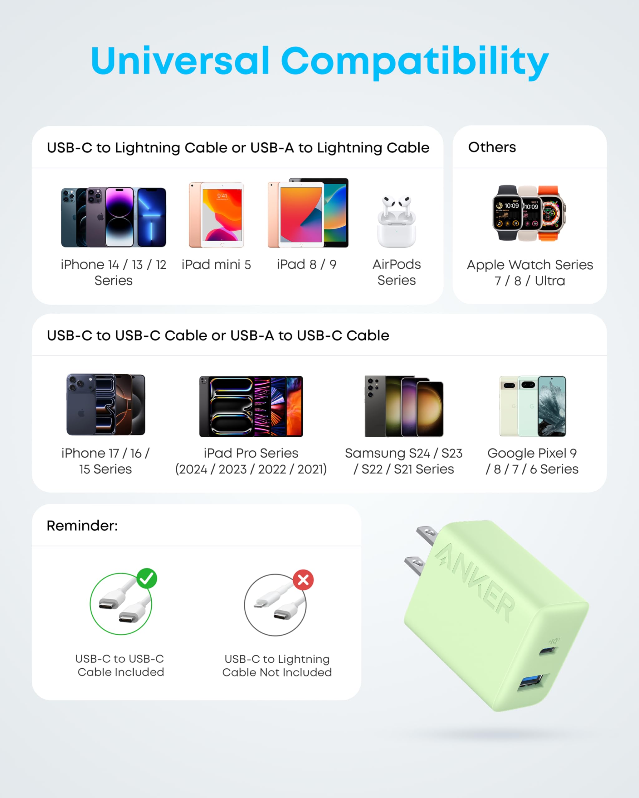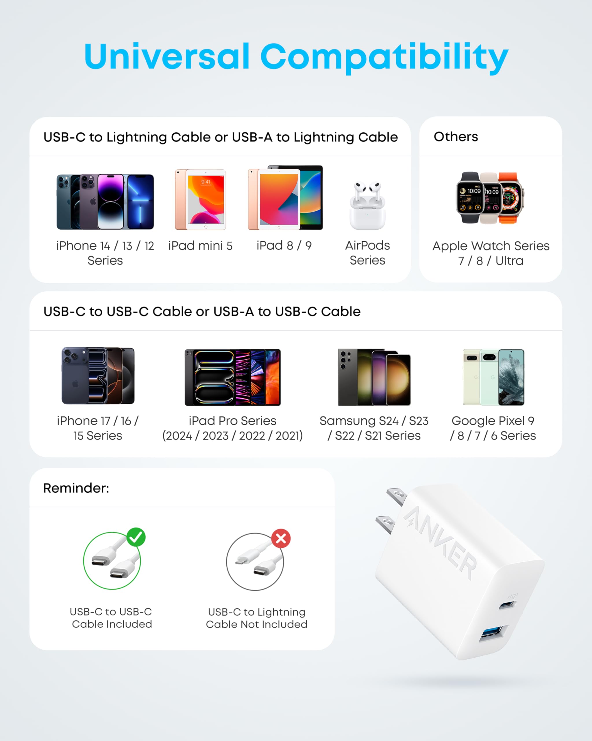 • What You Get: Anker Charger (2-Port, 20W), 2-pack 5 ft USB-C to USB-C cable, welcome guide, 18-month warranty, and our friendly customer service.