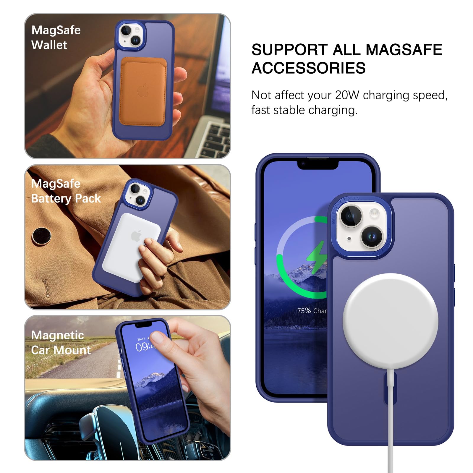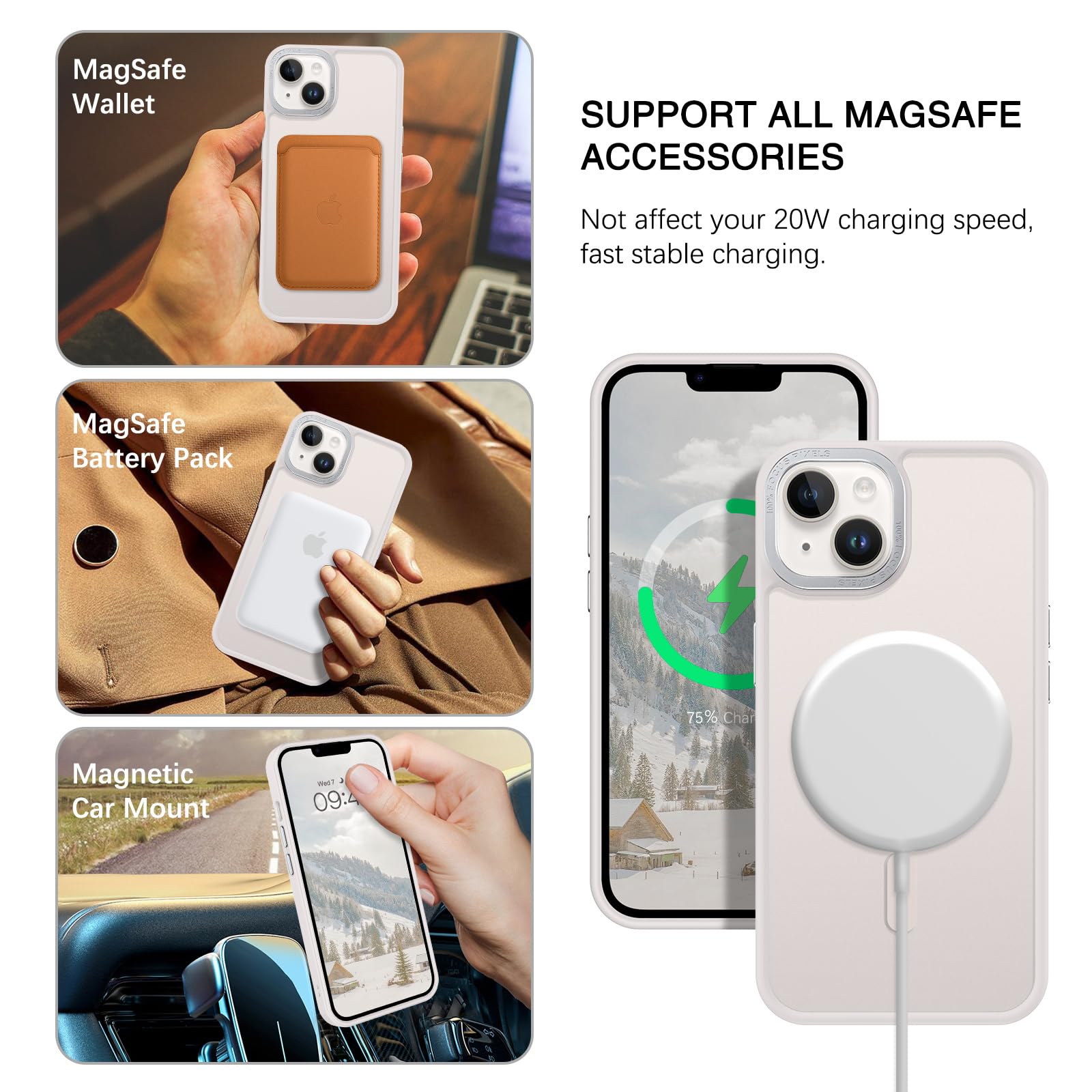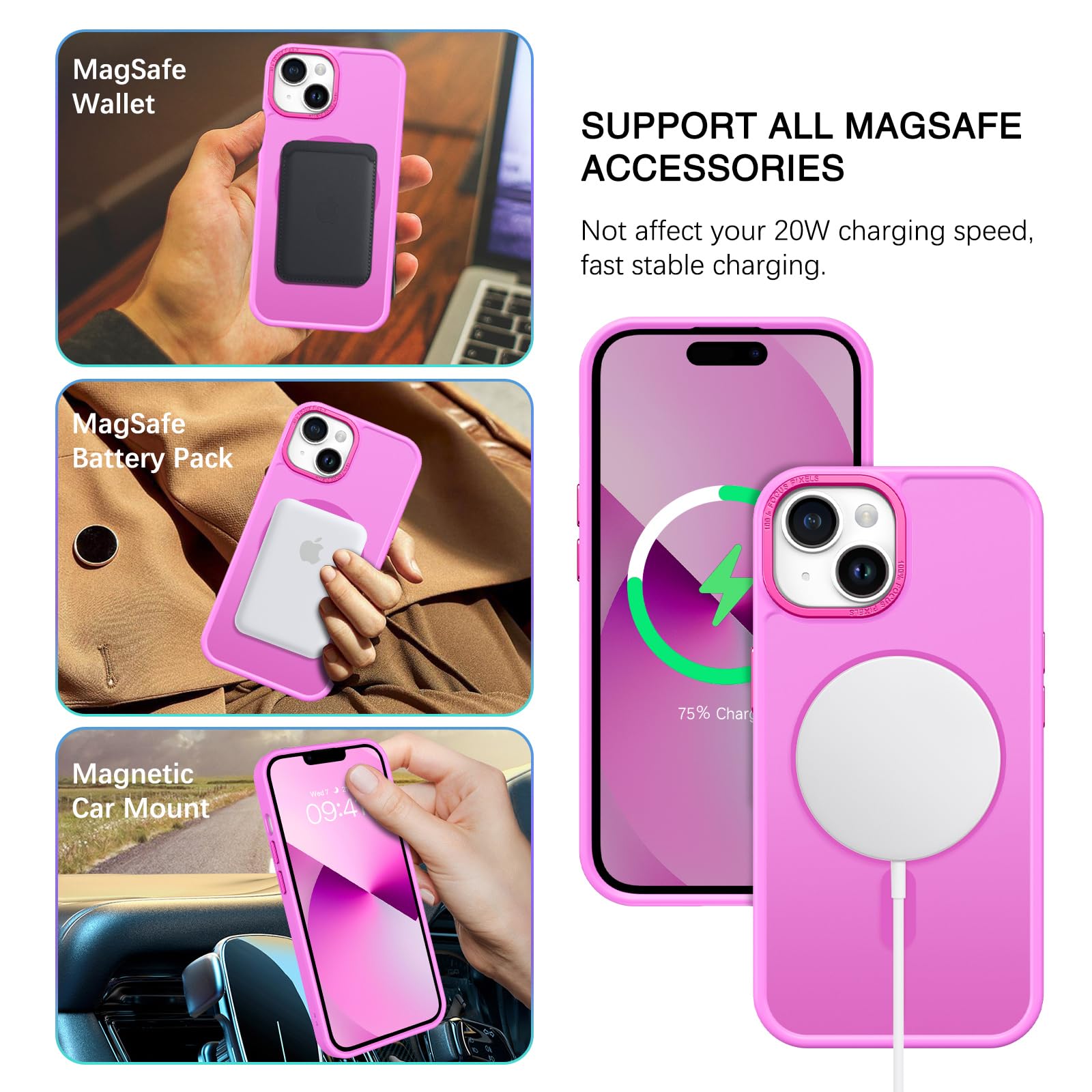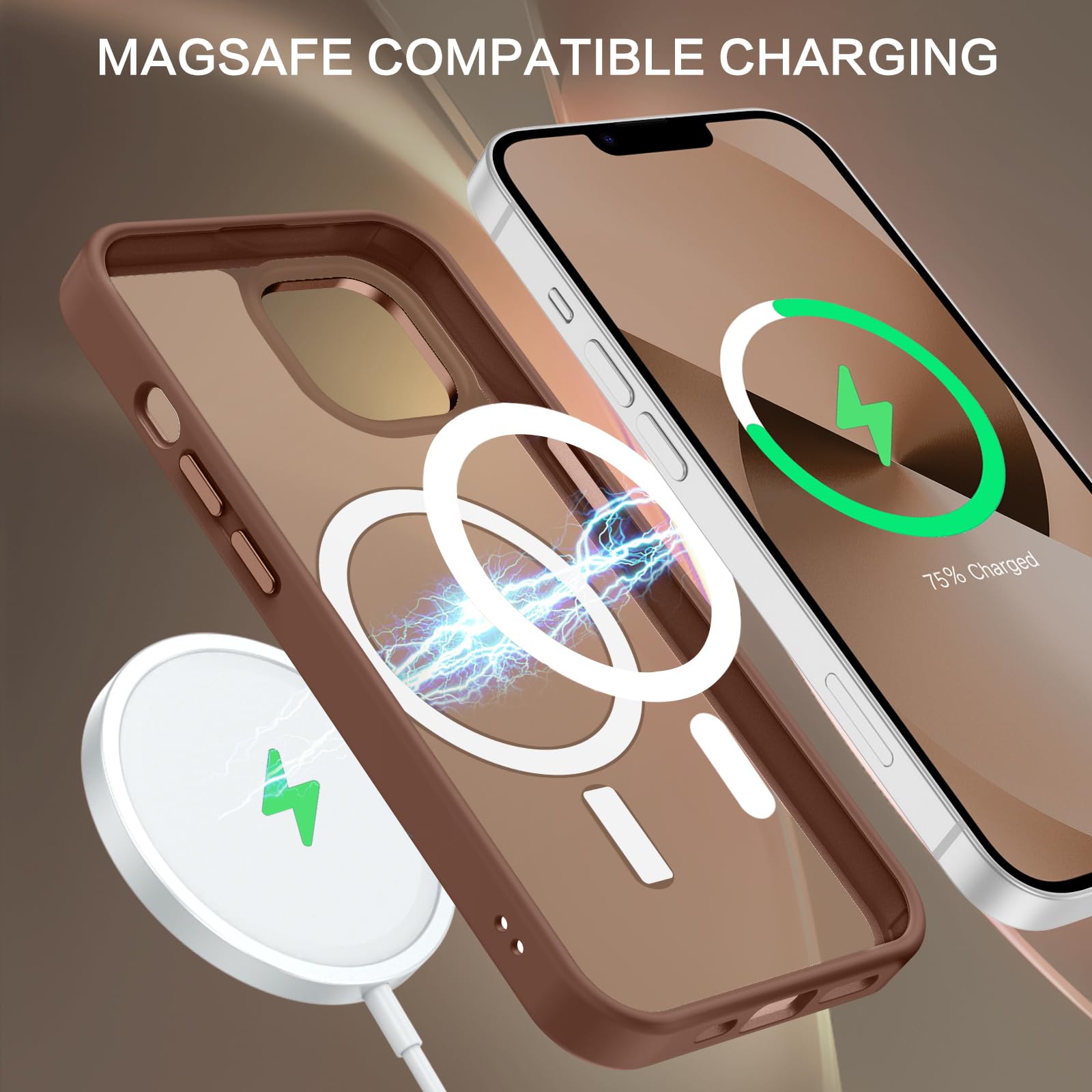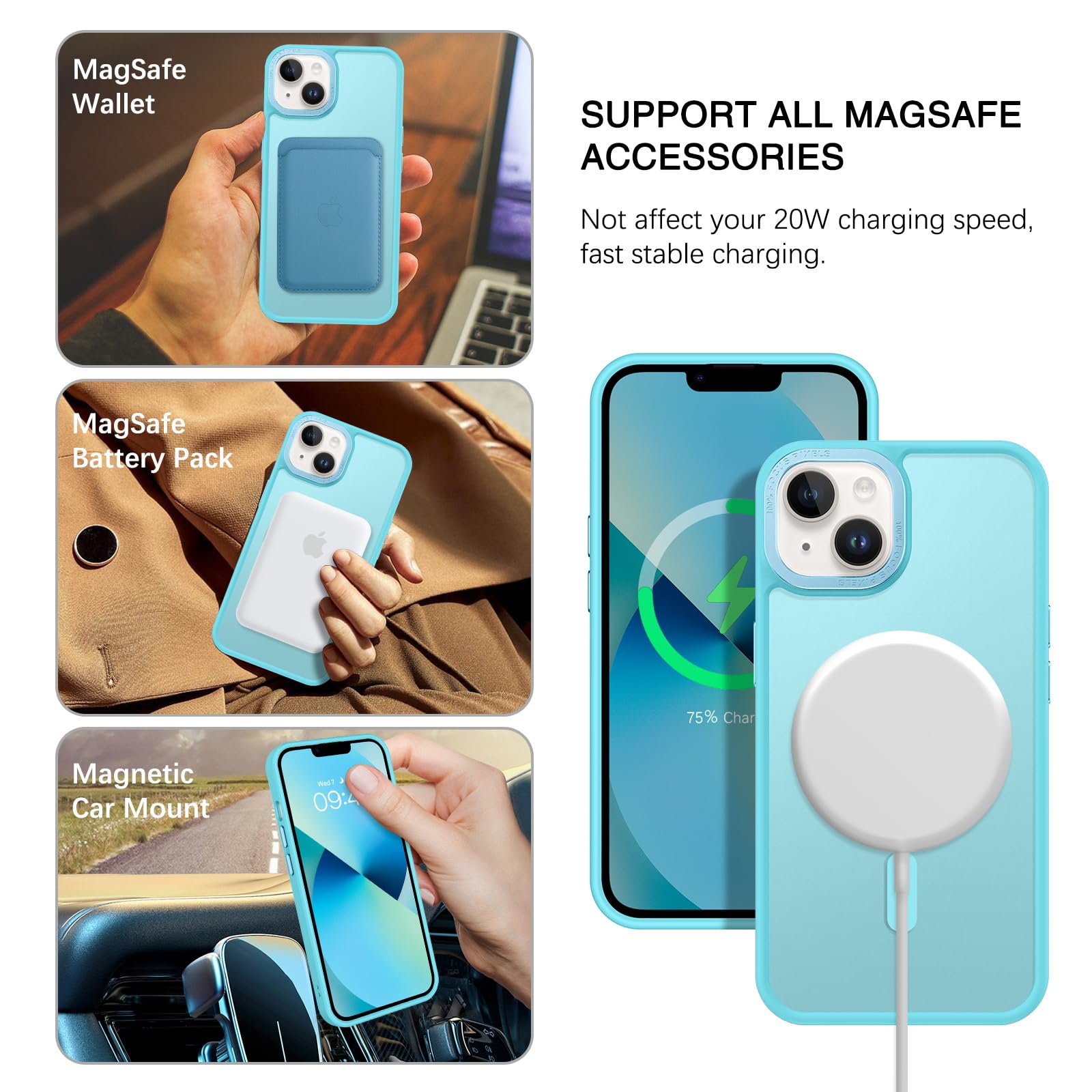 【Compatible with MagSafe Accessories】 This iPhone 13/14 Phone Case, with a built-in magnetic ring that aligns perfectly with MagSafe chargers and other Qi-certified chargers, offers a strong attach experience and faster wireless charging. This iPhone 13/14 Case magnetism is super strong, it can be firmly connected with all magnetic accessories such as Magnetice chargers, wallets, battery packs, car mounts, etc.,using chargers and other Qi wireless chargers and will not affect the signal.