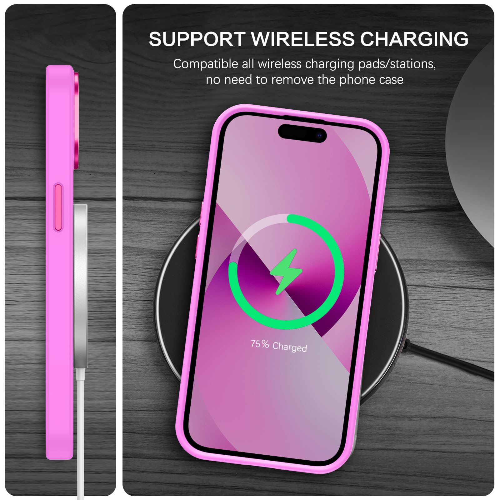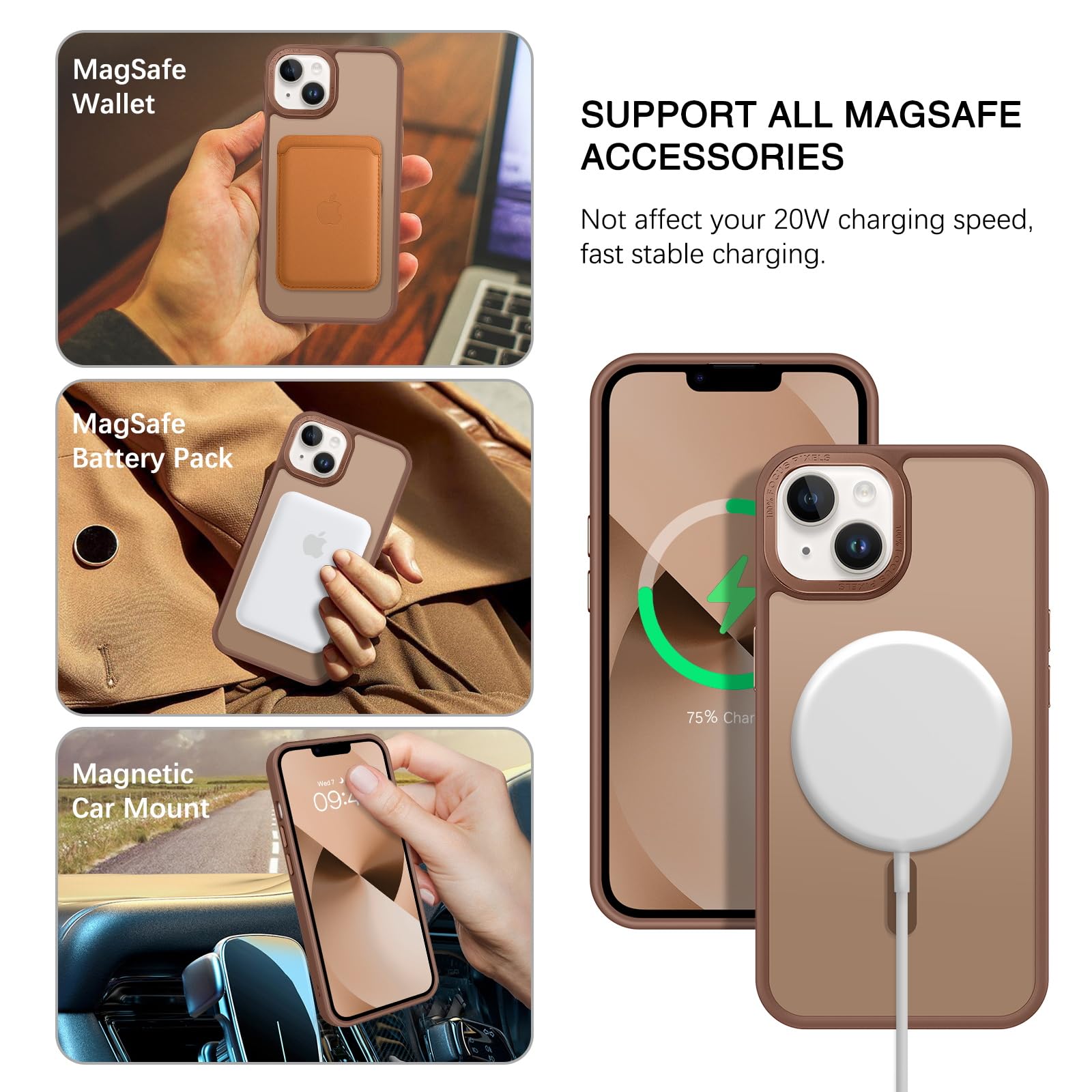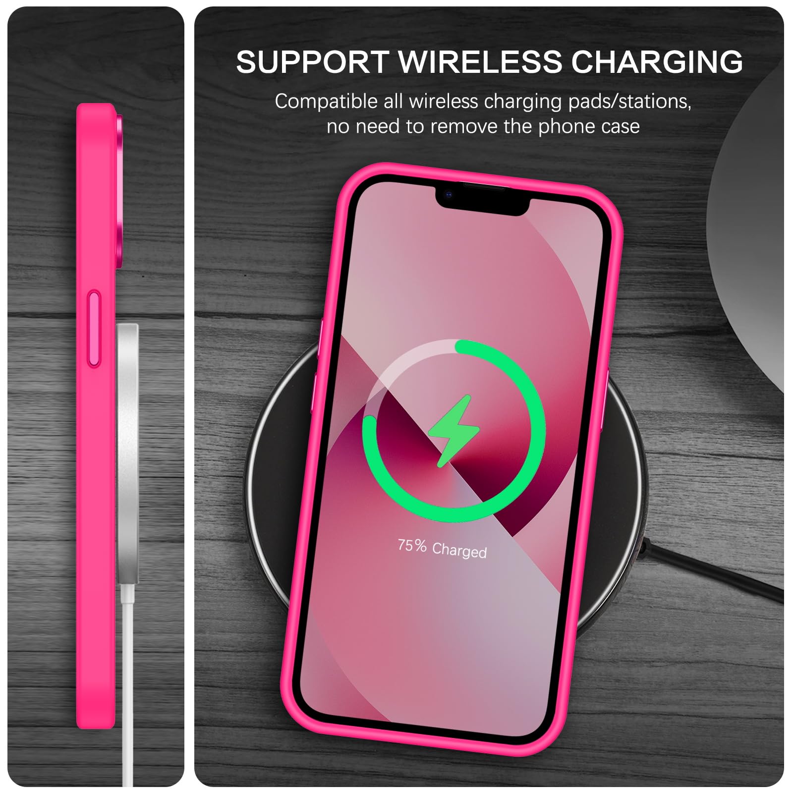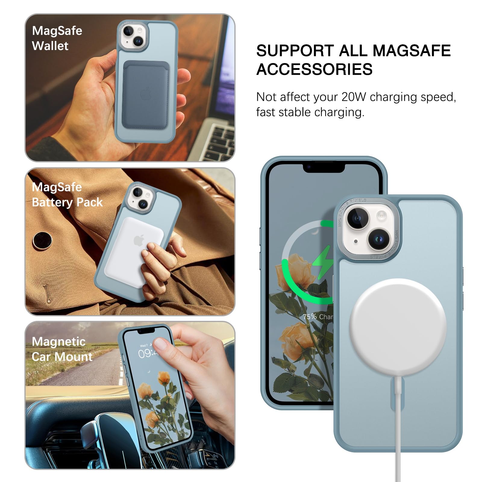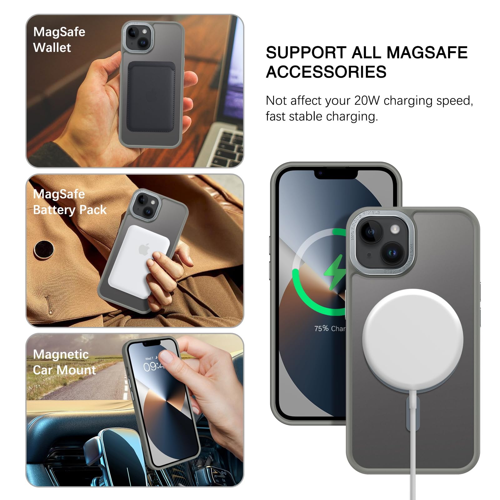 【Compatible with MagSafe Accessories】 This iPhone 13/14 Phone Case, with a built-in magnetic ring that aligns perfectly with MagSafe chargers and other Qi-certified chargers, offers a strong attach experience and faster wireless charging. This iPhone 13/14 Case magnetism is super strong, it can be firmly connected with all magnetic accessories such as Magnetice chargers, wallets, battery packs, car mounts, etc.,using chargers and other Qi wireless chargers and will not affect the signal.