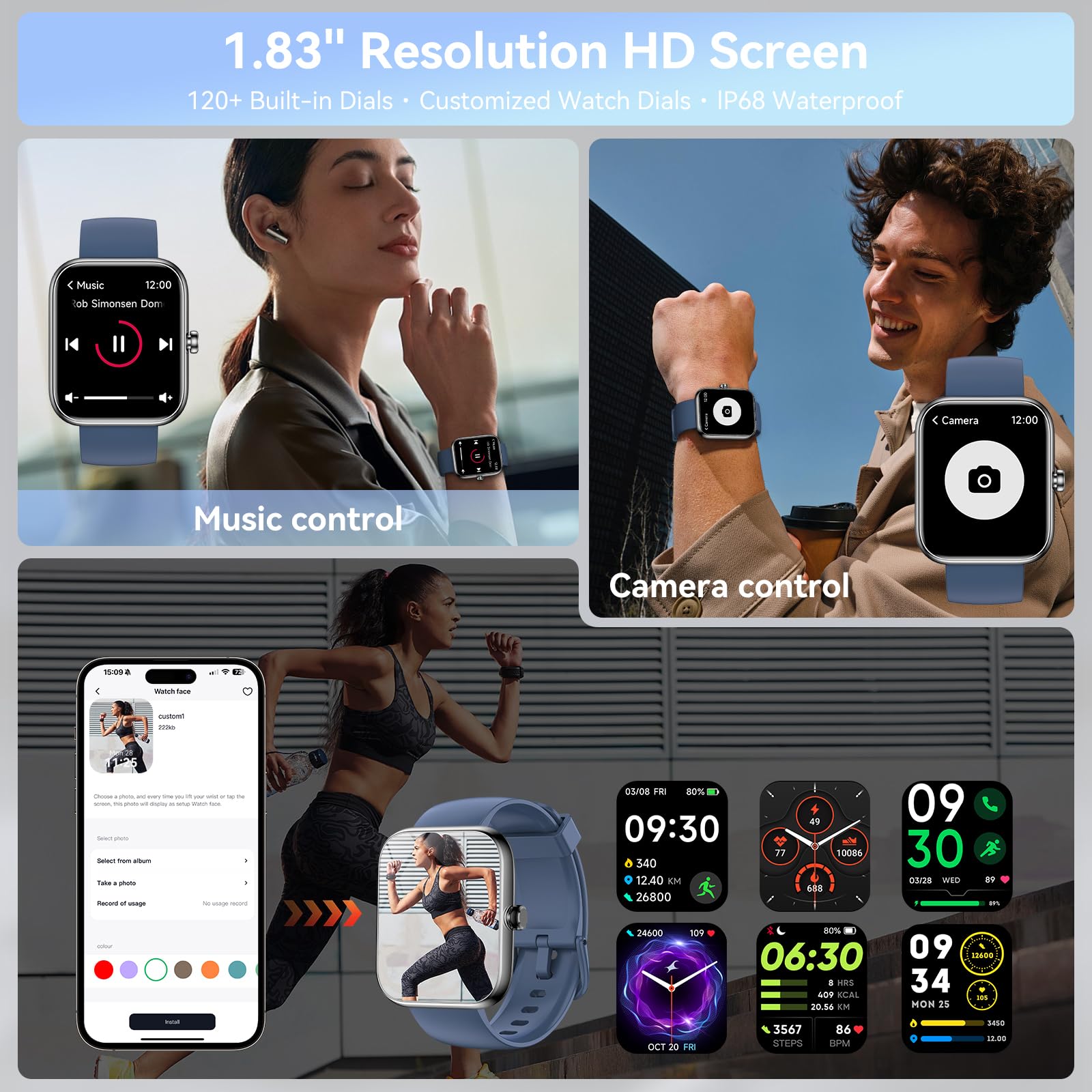 • 1.83"HD Touch and DIY Dials: Smartwatch let you have different touch screen watch experience, watch smart light up the screen for your use, equipped with 100+screens for you to choose, you can also DIY unique fitness tracker screen