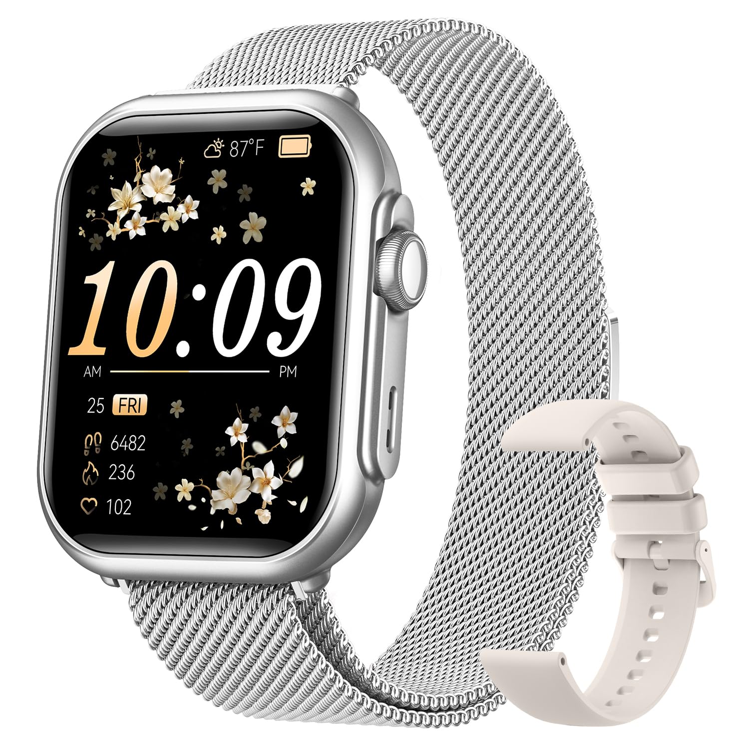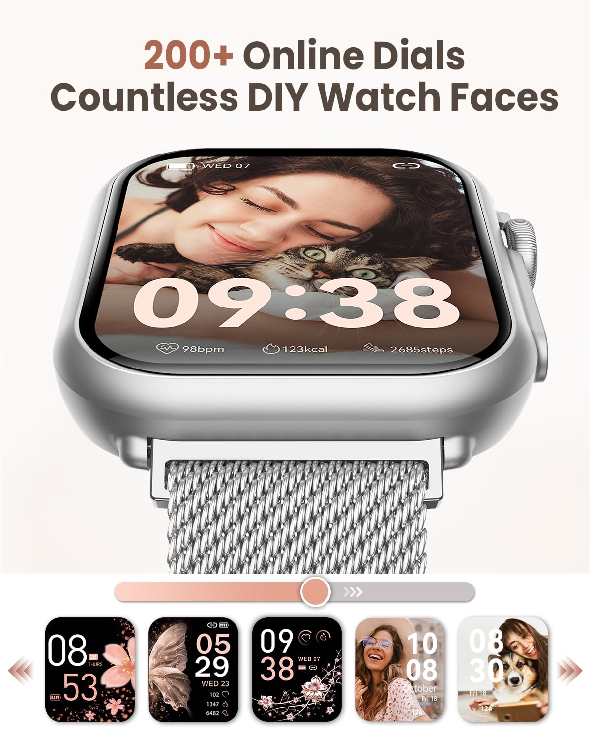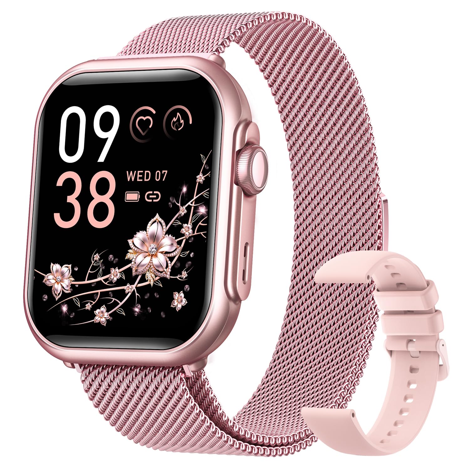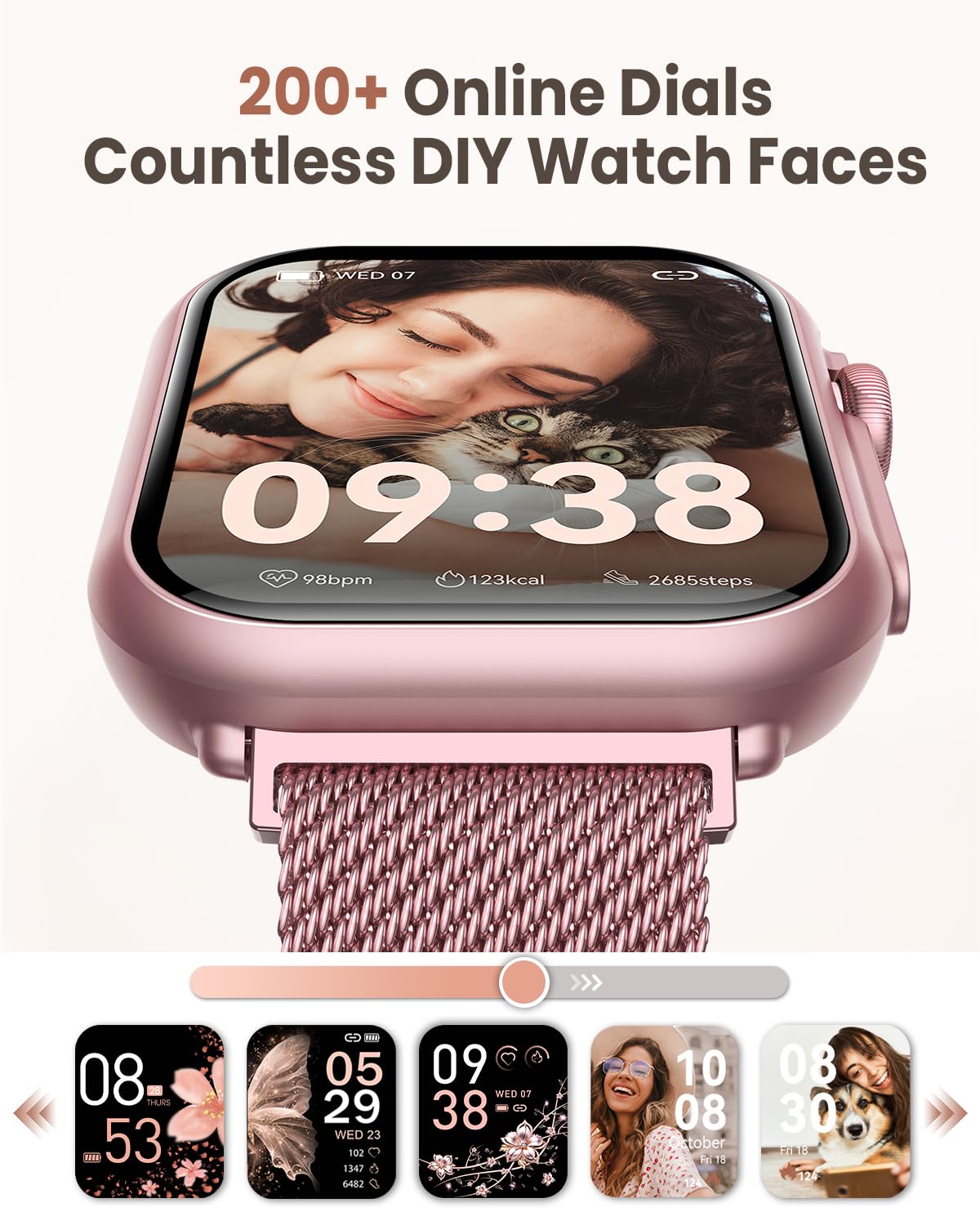 • Elegant Smart Watches for Women: This smartwatch comes with a blush pink metal frame and a 1.83" HD screen, which is elegant and stylish overall. 2 different styles of watch bands (1 metal, 1 silicone) are perfect for work, casual wear and special occasions. In addition, there are more than 200 watch face styles to choose from, and you can also upload photos to customize your unique watch face