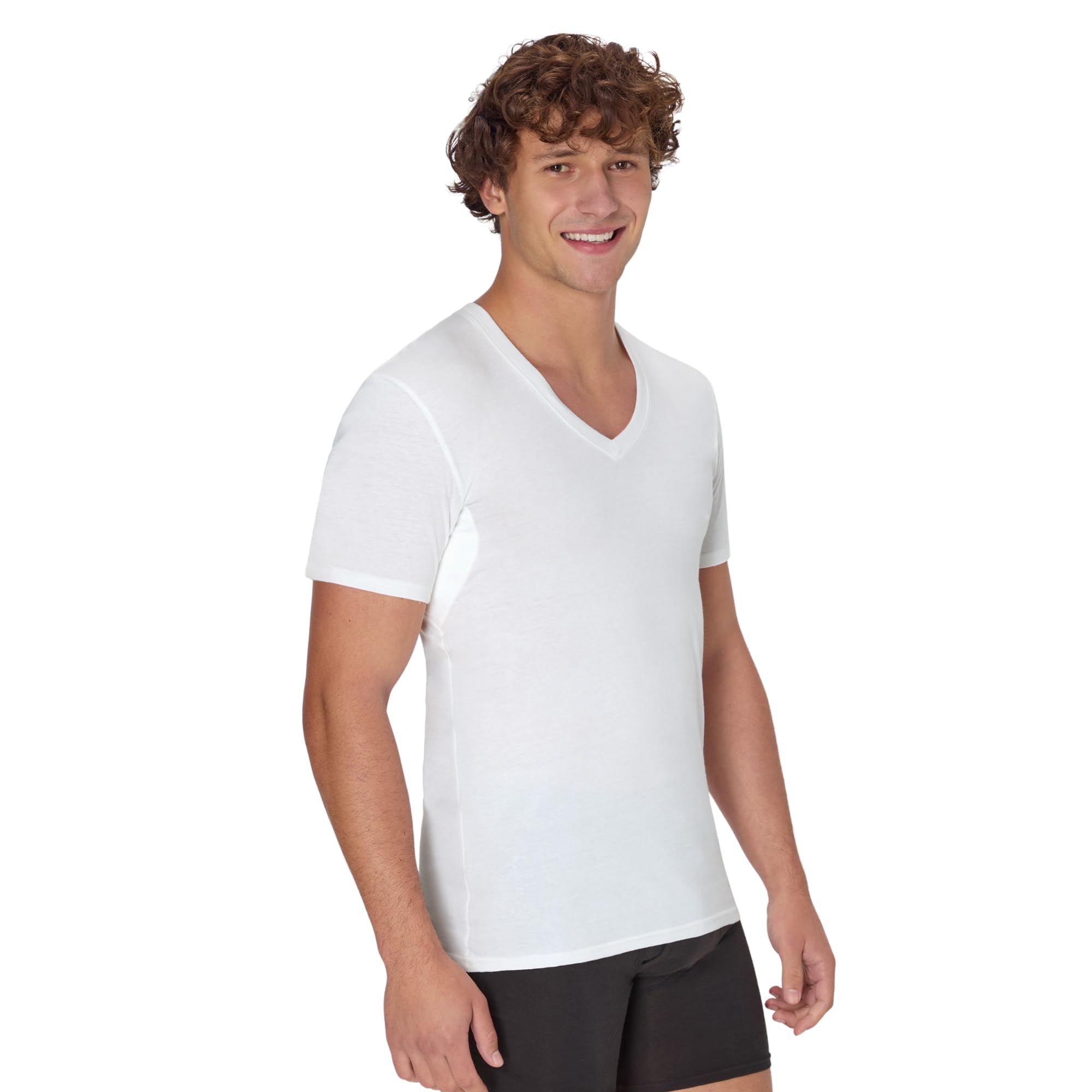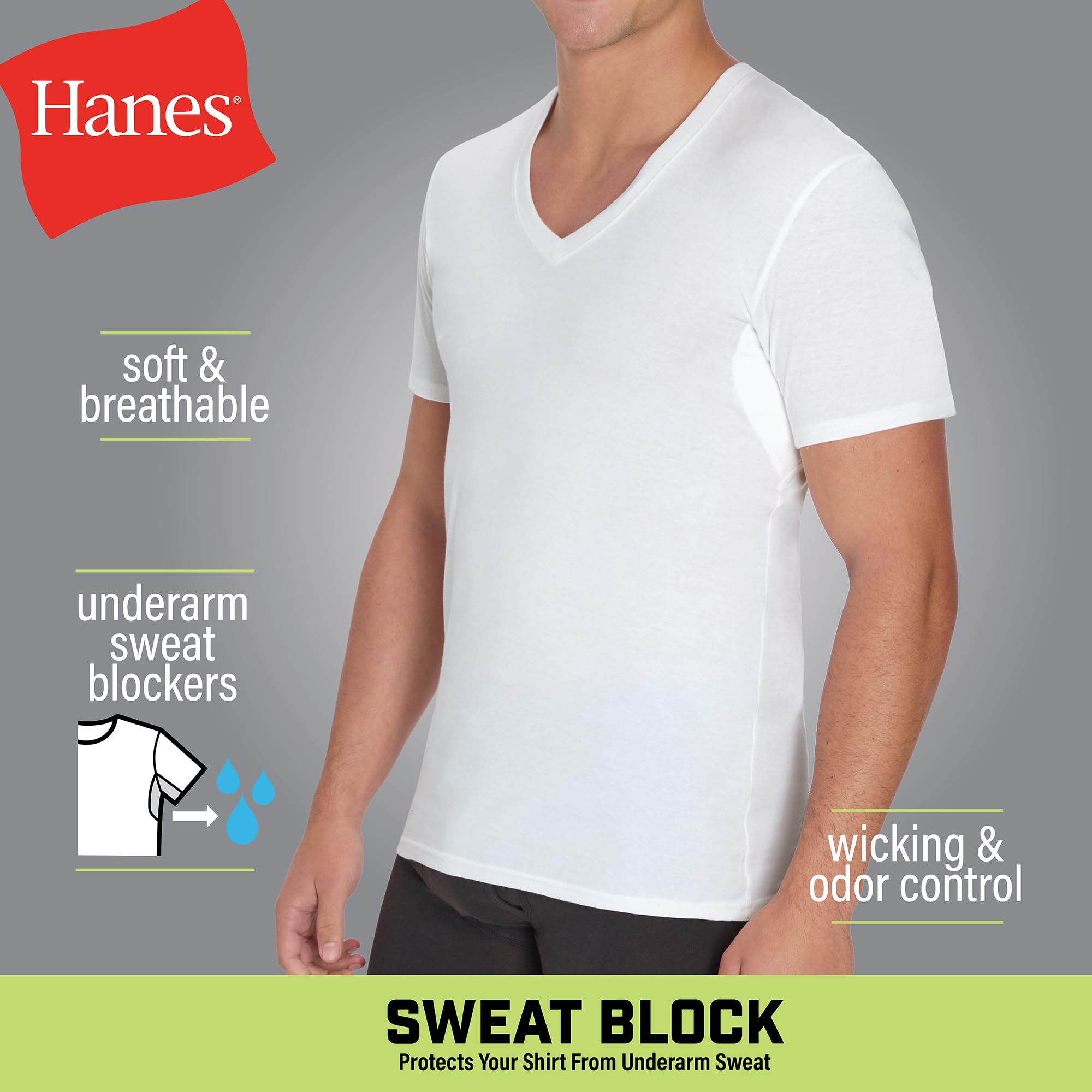 Keep your cool and your confidence intact - the Hanes Sweat Block Tee is designed to stop underarm sweat in its tracks. Innovative sweat block zones located beneath the arms capture sweat, helping you remain dry while shielding your outerwear from those embarrassing underarm stains no one likes. Crafted from quality fabric, this men’s t-shirt is both soft and breathable - making it ideal for all-day wear. Built-in moisture-wicking technology and odor control help you stay fresh and comfortable, and you’ll appreciate the Tagless® interior. This V-neck undershirt stays neatly tucked for a clean appearance under your favorite dress shirt or polo. Whether you're powering through a stressful workday or simply hanging out, it will keep you looking sharp and feeling your best, all at a price point that won’t break your budget.