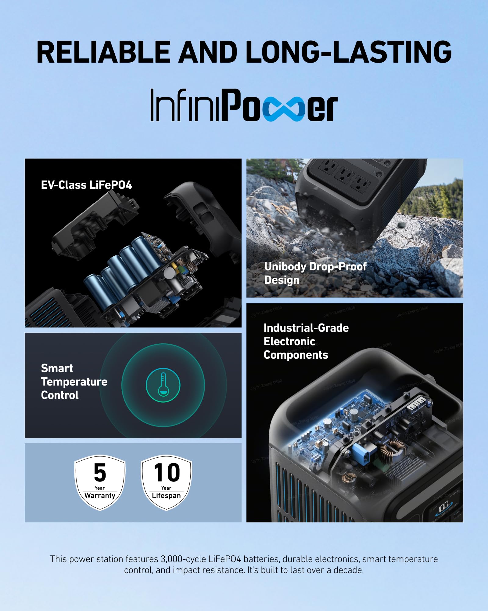 10 Years of Power: Built to last a decade, power up with LiFePO4 batteries, designed to last 3,000 cycles. Also enjoy smart temperature control, impact resistance, and a 5-year warranty.