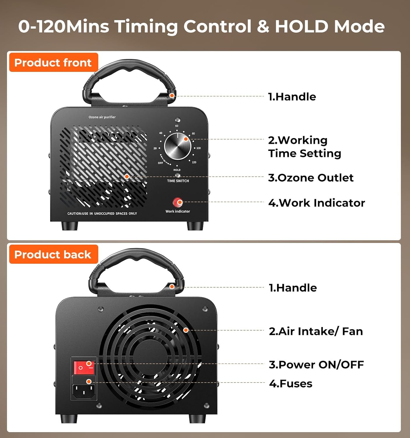 If you turn the knob from "OFF" to "HOLD". Machine will continuously release ozone until you manually turned off ใEASY TO USEใJust turn the timing knob of the air ozone machine to set the ozone generation time and leave the room. If you turn the knob from "OFF" to "HOLD". The Machine will continuously release ozone until you manually turned off. It will be more effective to remove the odor source before using the machine