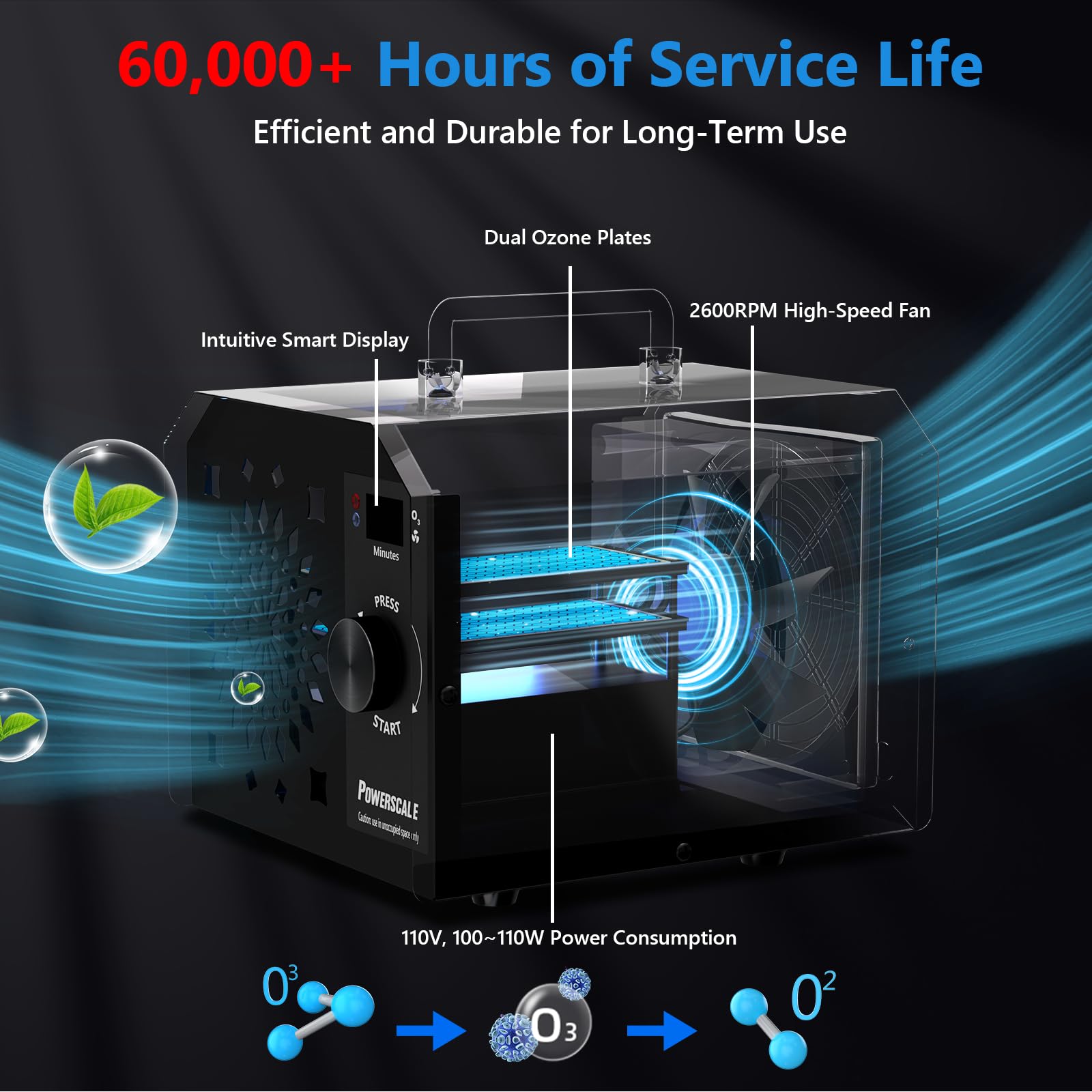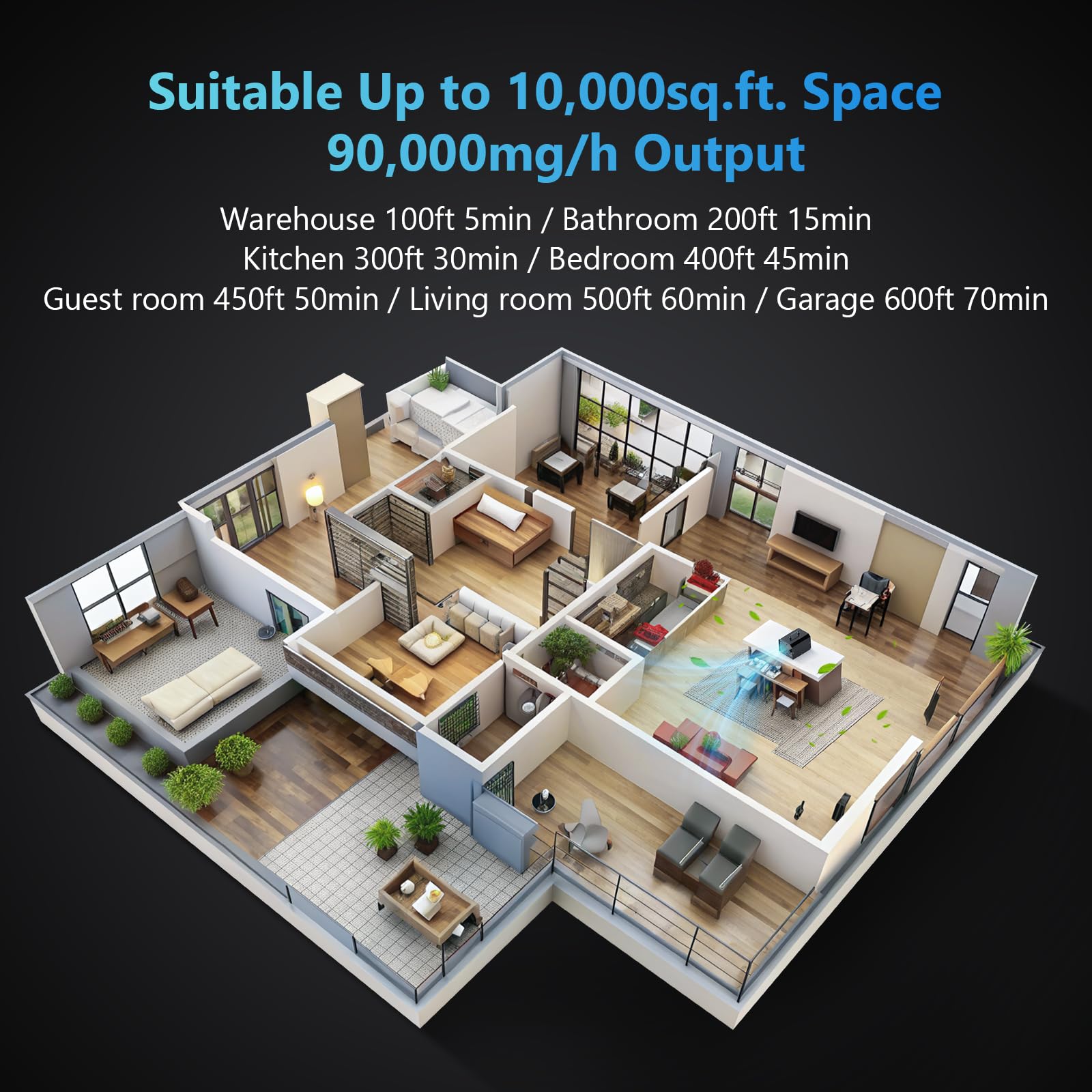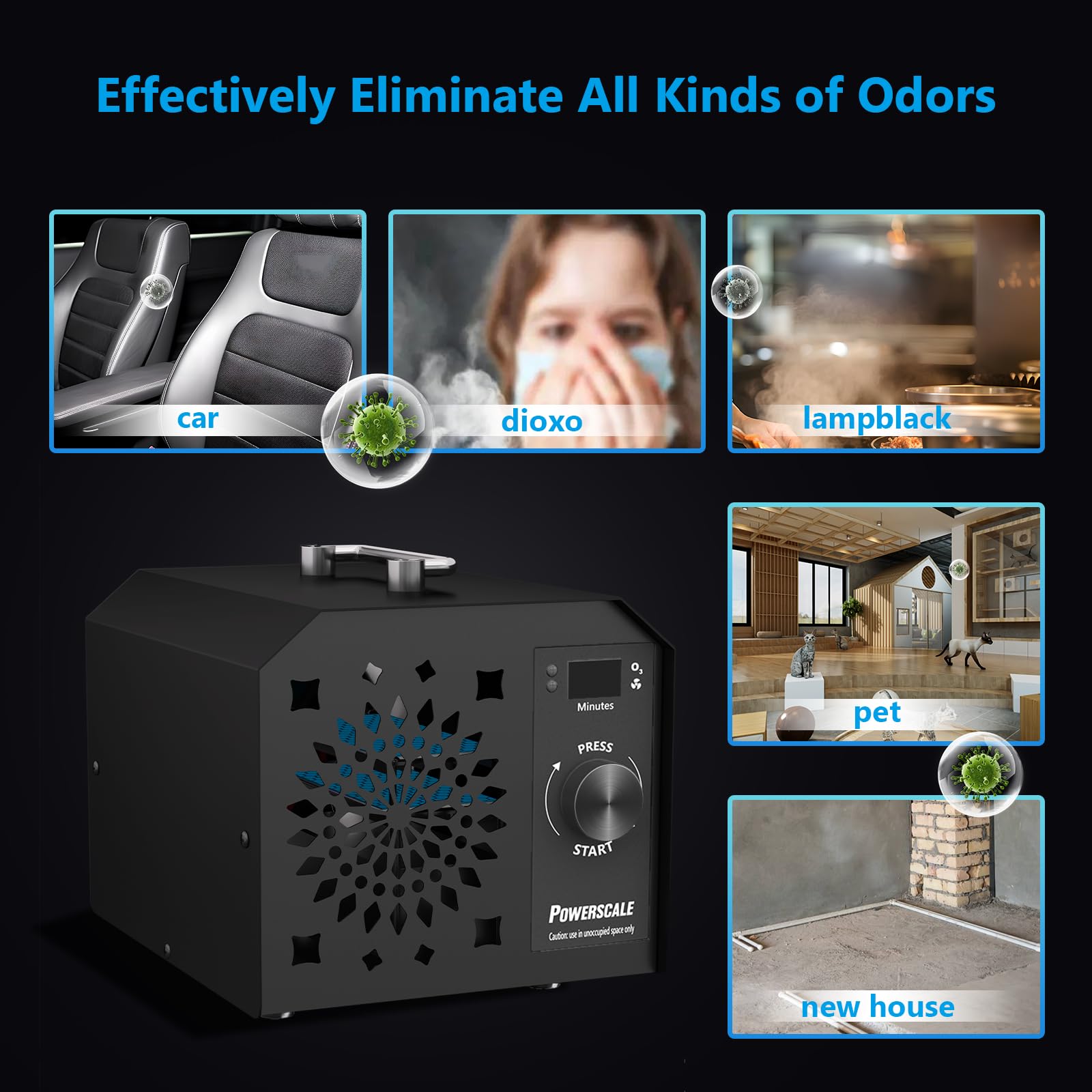 PowerScale Ozone Generator 90,000mg/h O3 Intelligent Control Ozone Odor Eliminator Commercial Ozone Machine Odor Removal, For Home, Car, Pet Room - High Capacity Ionizer Ozone Air Purifier, Black