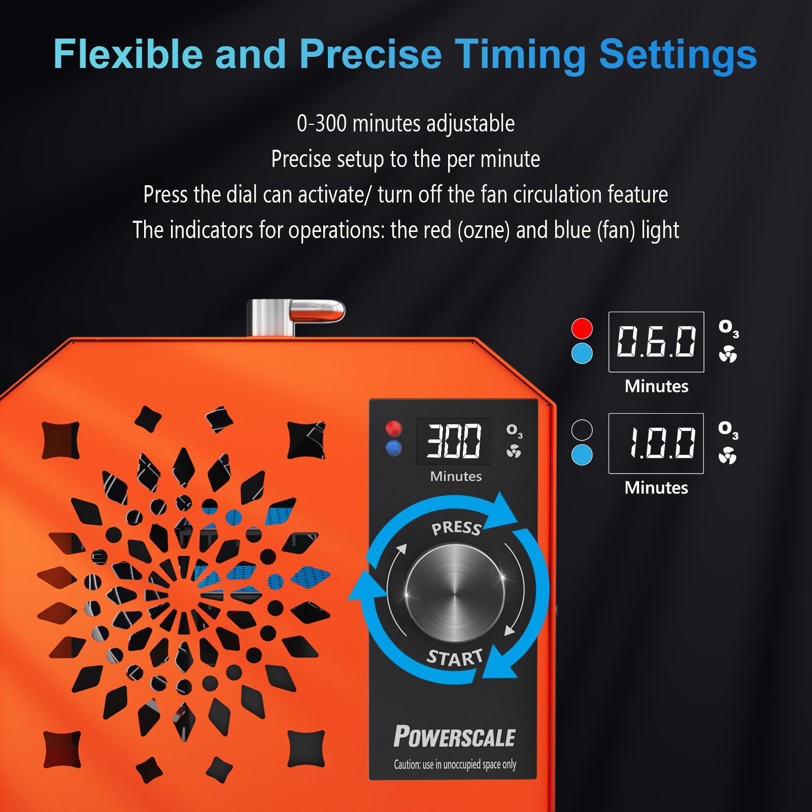 Intuitive Smart Display: Our ozone odor eliminator is equipped with an advanced smart display that makes operation effortless. Easily and choosing up to 300 minutes for flexible timer settings that ensures optimal ozone machine performance for any room size 10-Second Safety Delay: The built-in 10-second delay prevents accidental ozone inhalation. This ozone machine odor removal feature ensures your safety while effectively eliminating odors