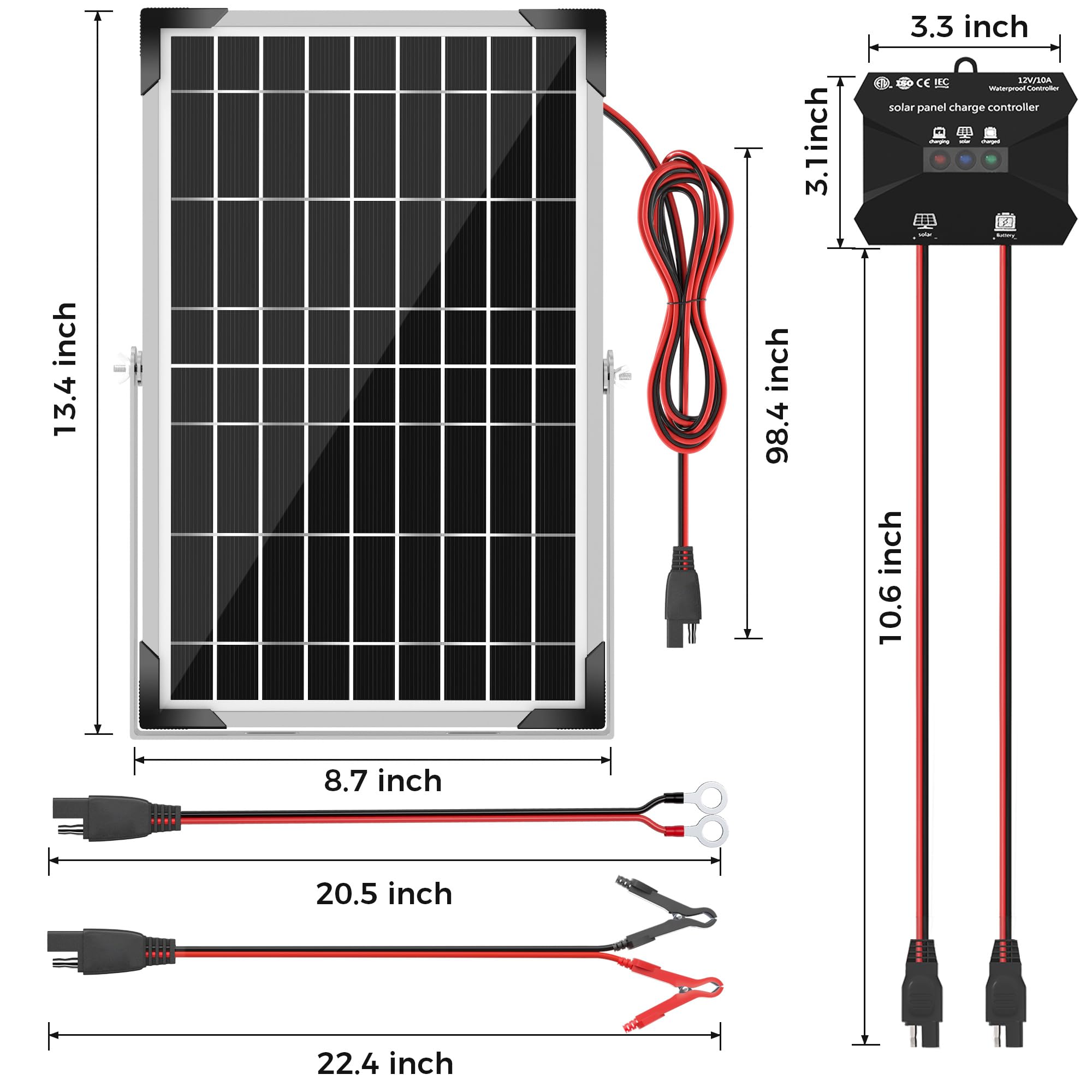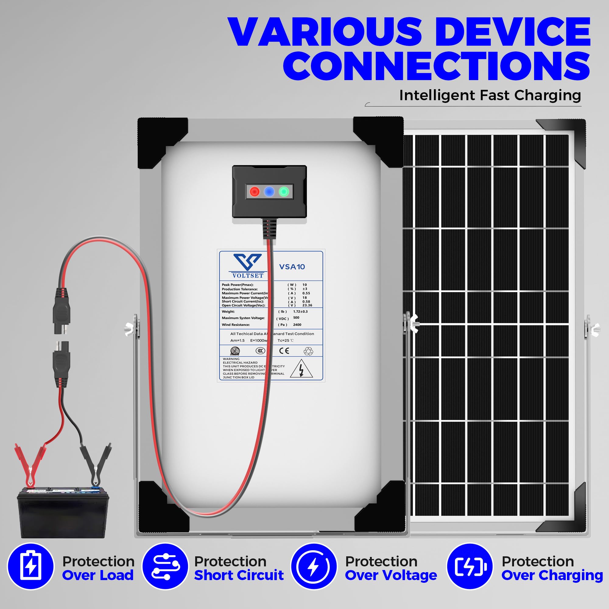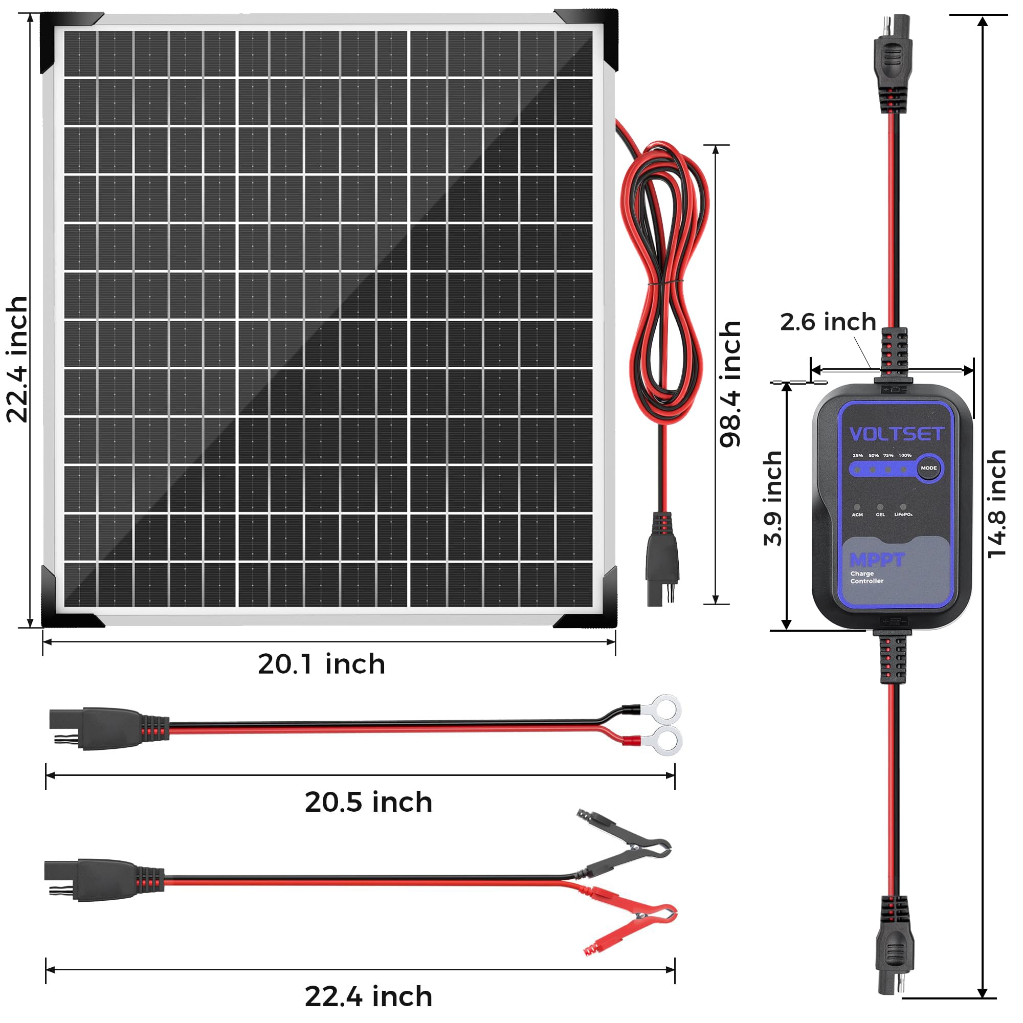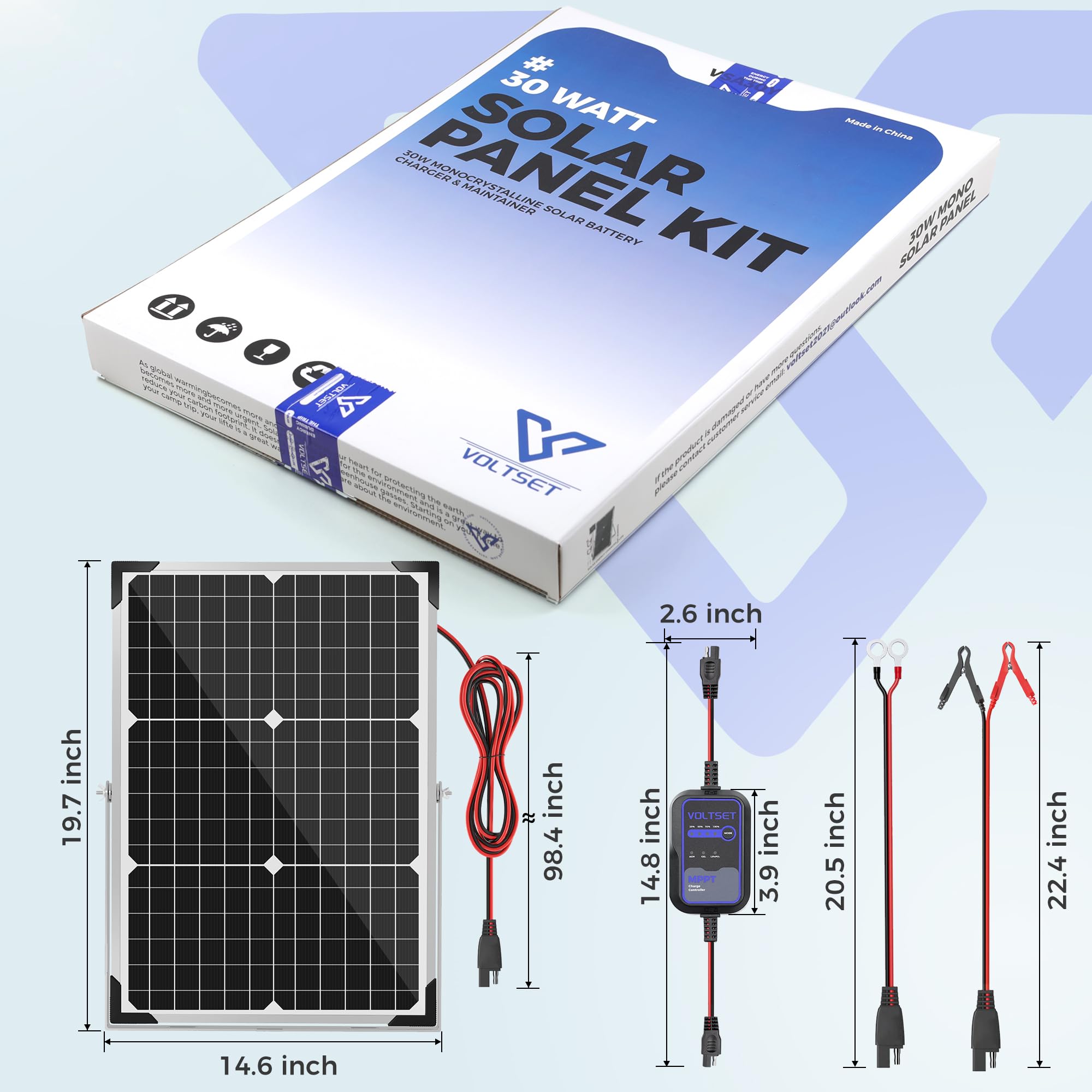 Quality Assurance: VOLTSET offers 24/7 professional customer service and a 12-month warranty. The package includes 1 solar panel; 1 charging controller; 1 mounting bracket; 1 set of alligator clips; and 1 set of O-rings with installation screws