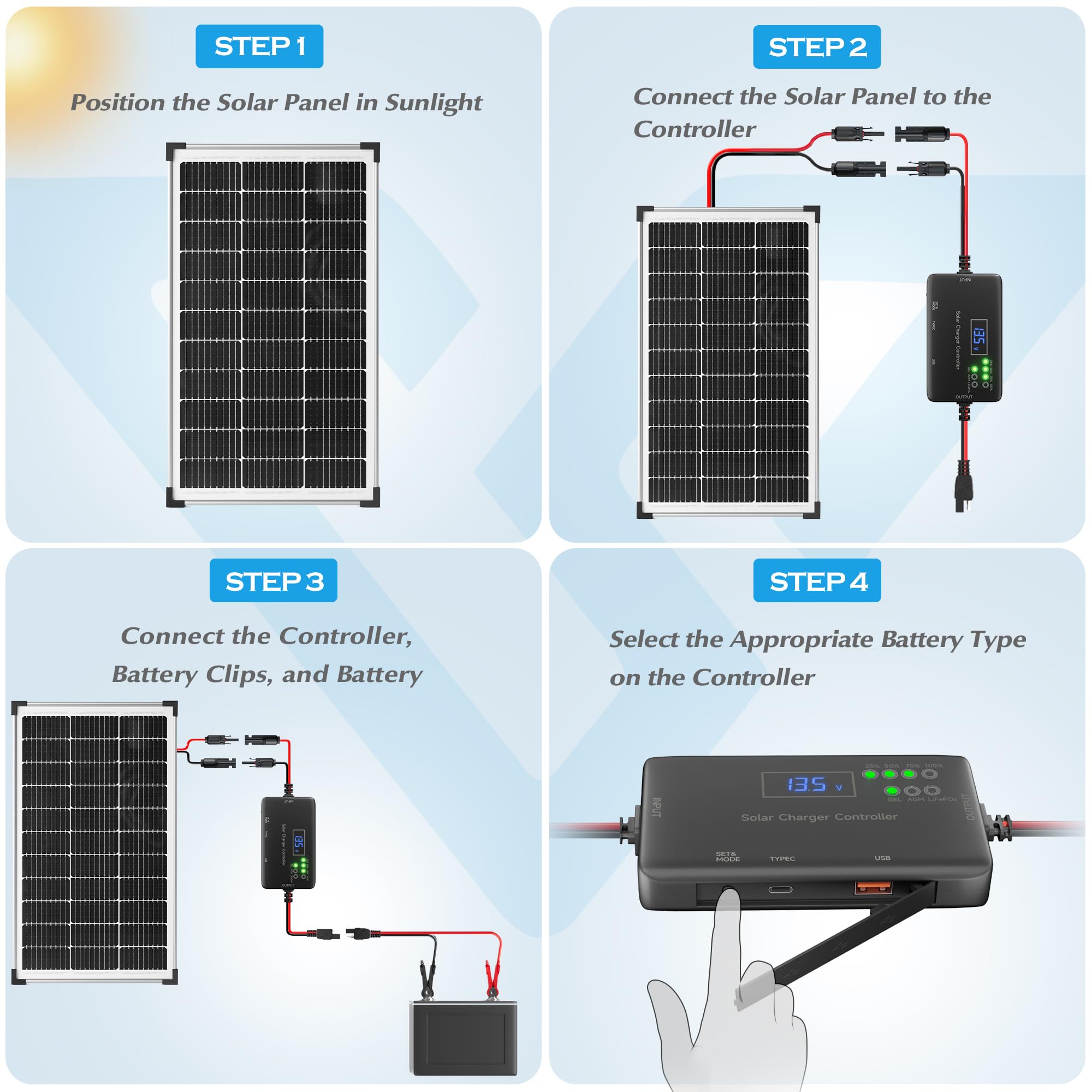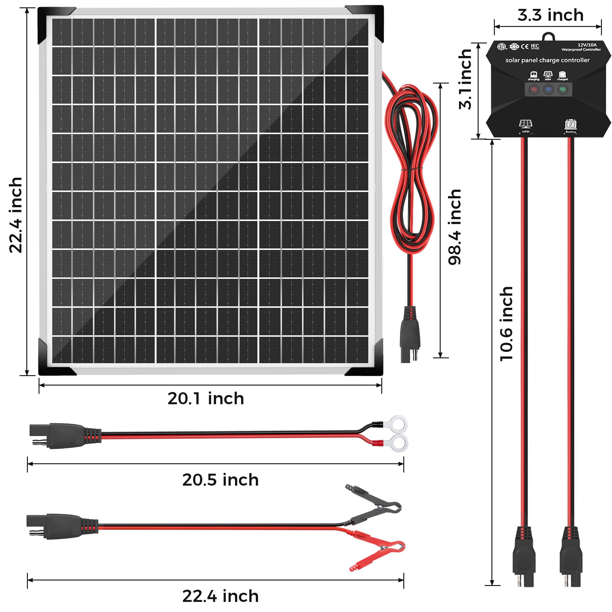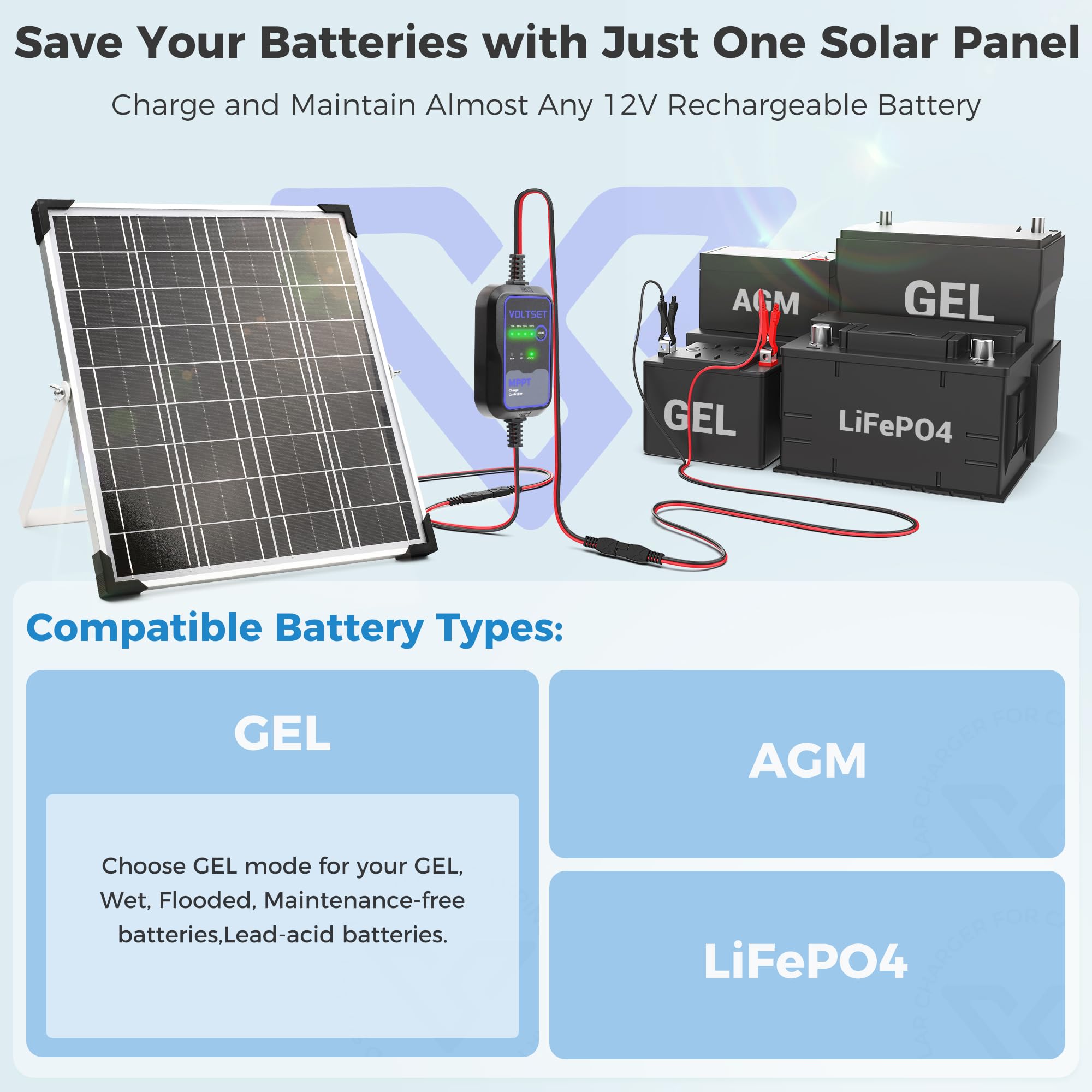 Quality Assurance: VOLTSET offers 24/7 professional customer service and a 12-month warranty. The package includes 1 solar panel; 1 charging controller; 1 mounting bracket; 1 set of alligator clips; and 1 set of O-rings with installation screws