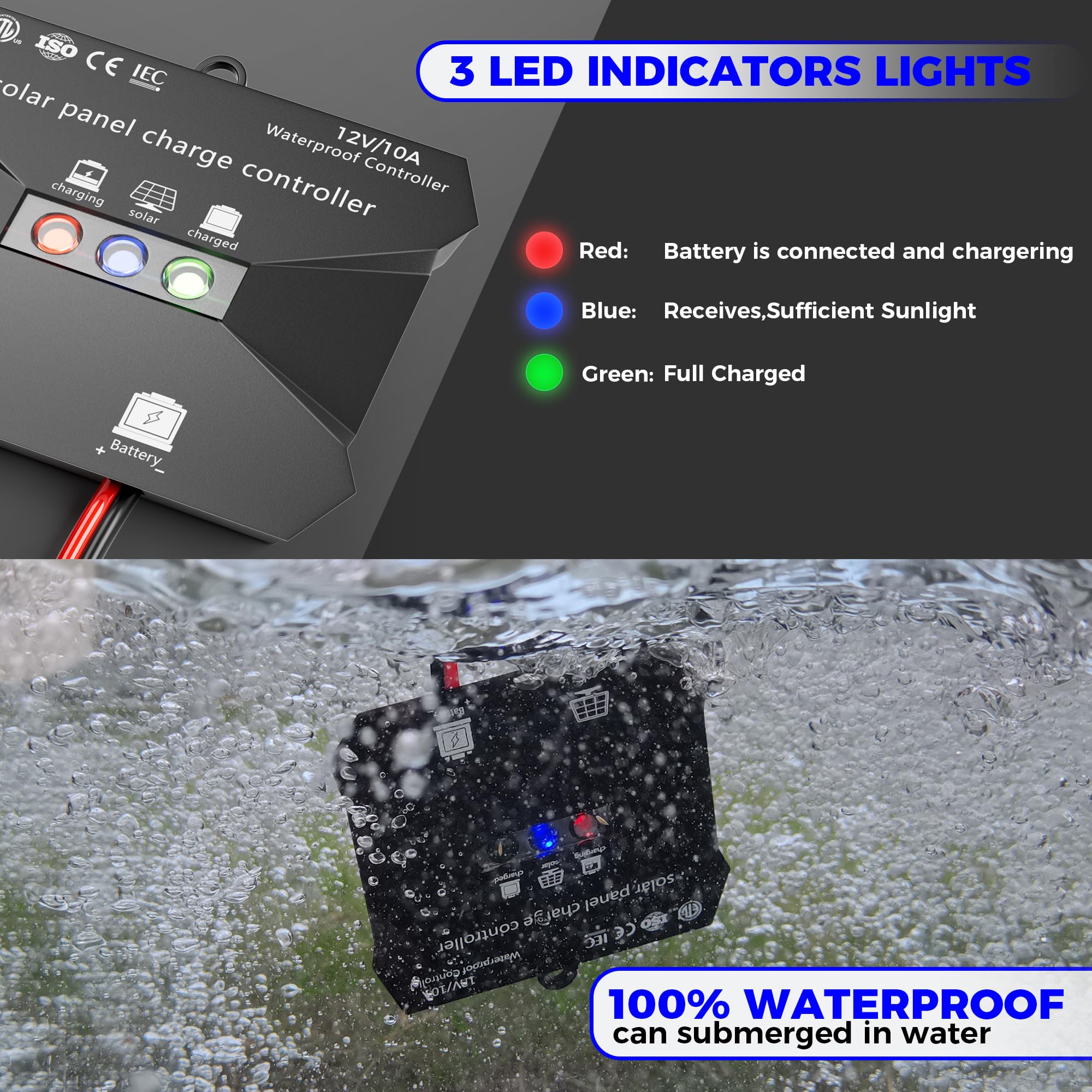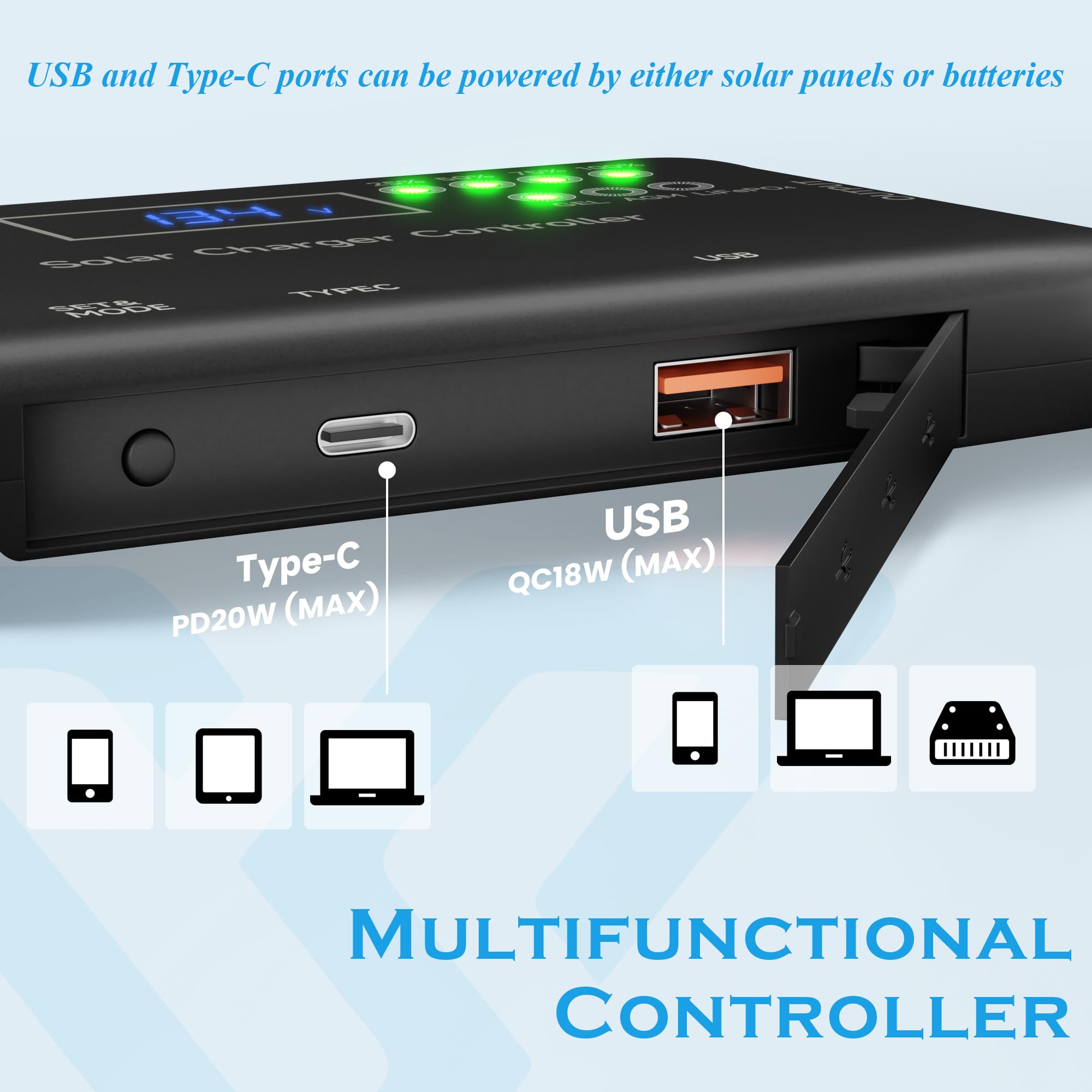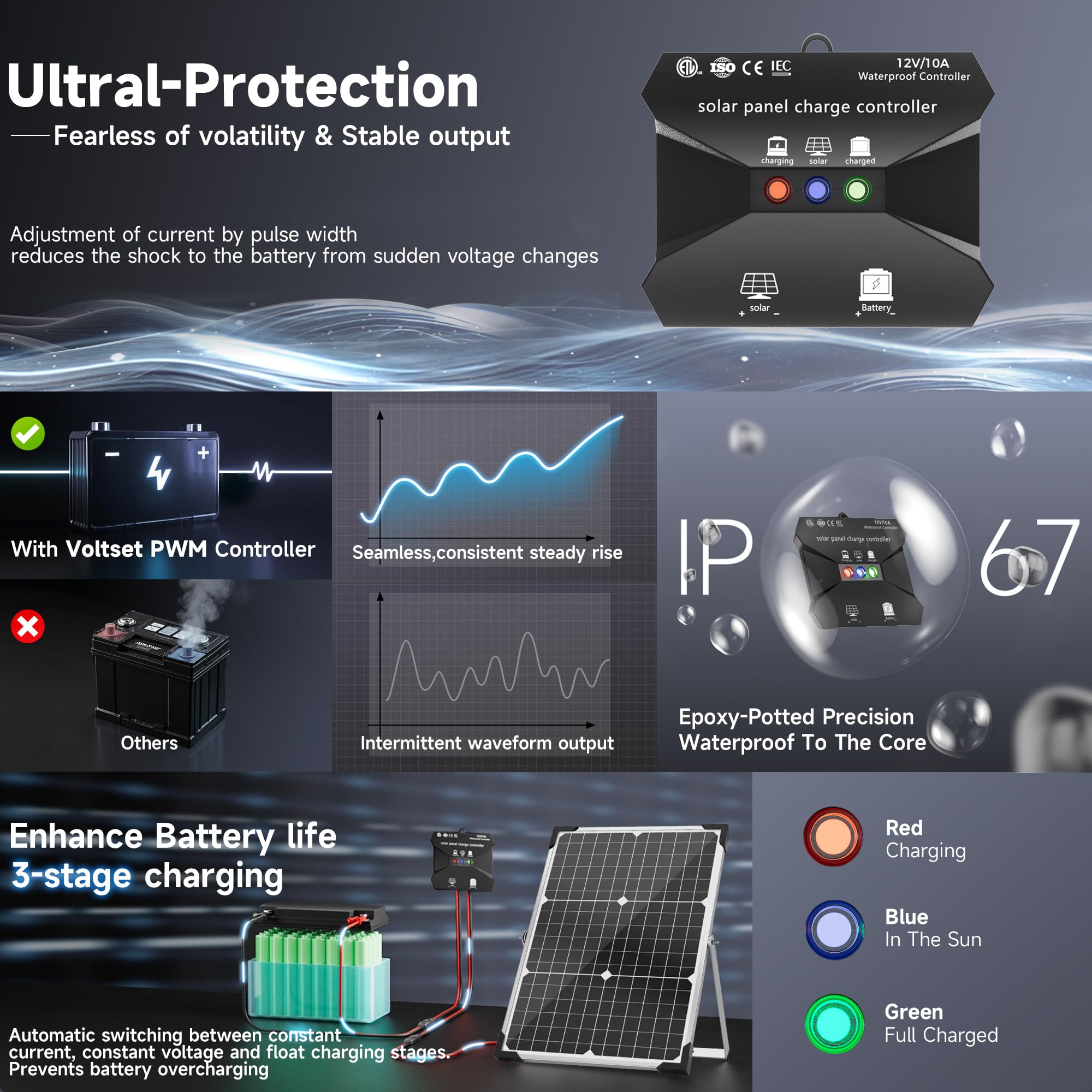 Smart 3-stage Visual Charge: PWM 3-stage charging technology (direct/float/trickle charge) for 12V LiFePO₄, lithium, AGM, SLA, GEL, etc, charging efficiency increased by 18%, controller LED screen displays charging status in real time, three indicators: blue (sunlight exposure), red (charging), green (battery fully charged)