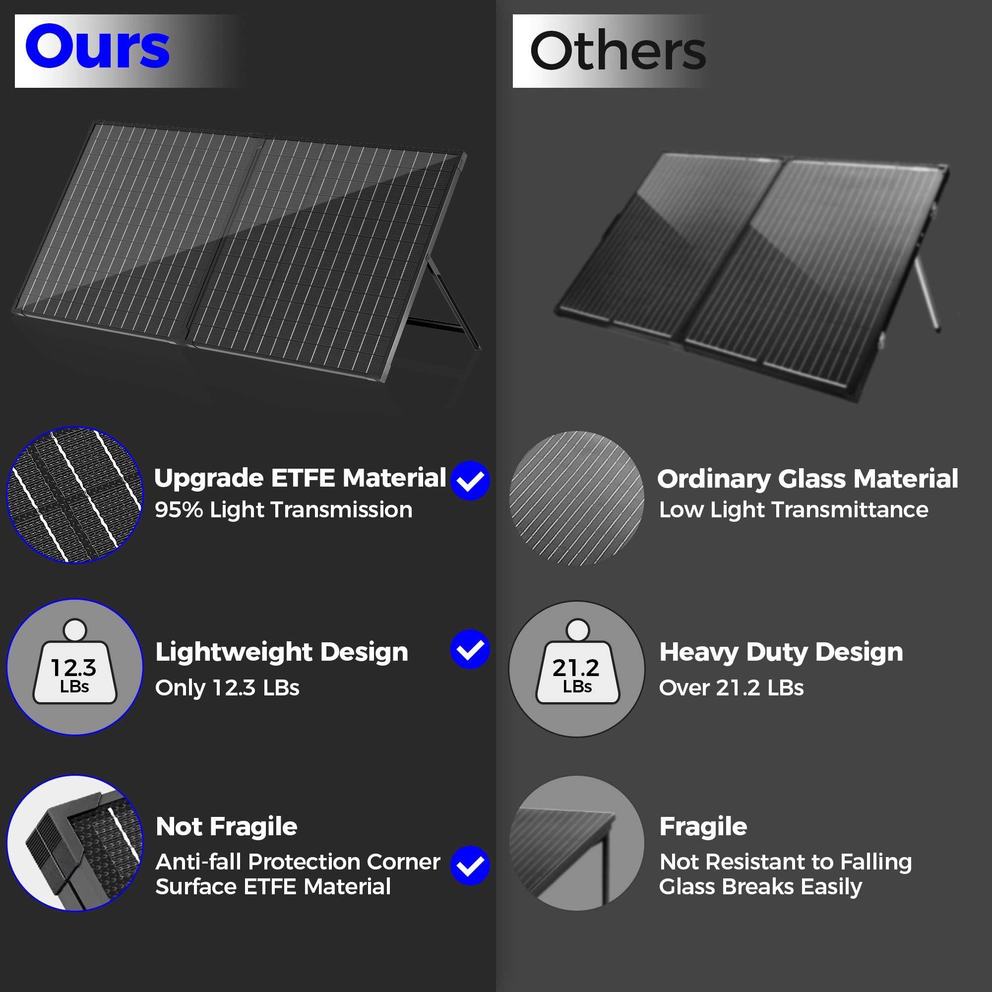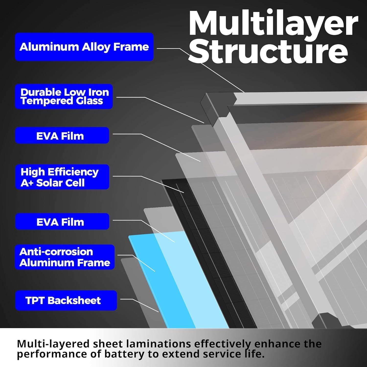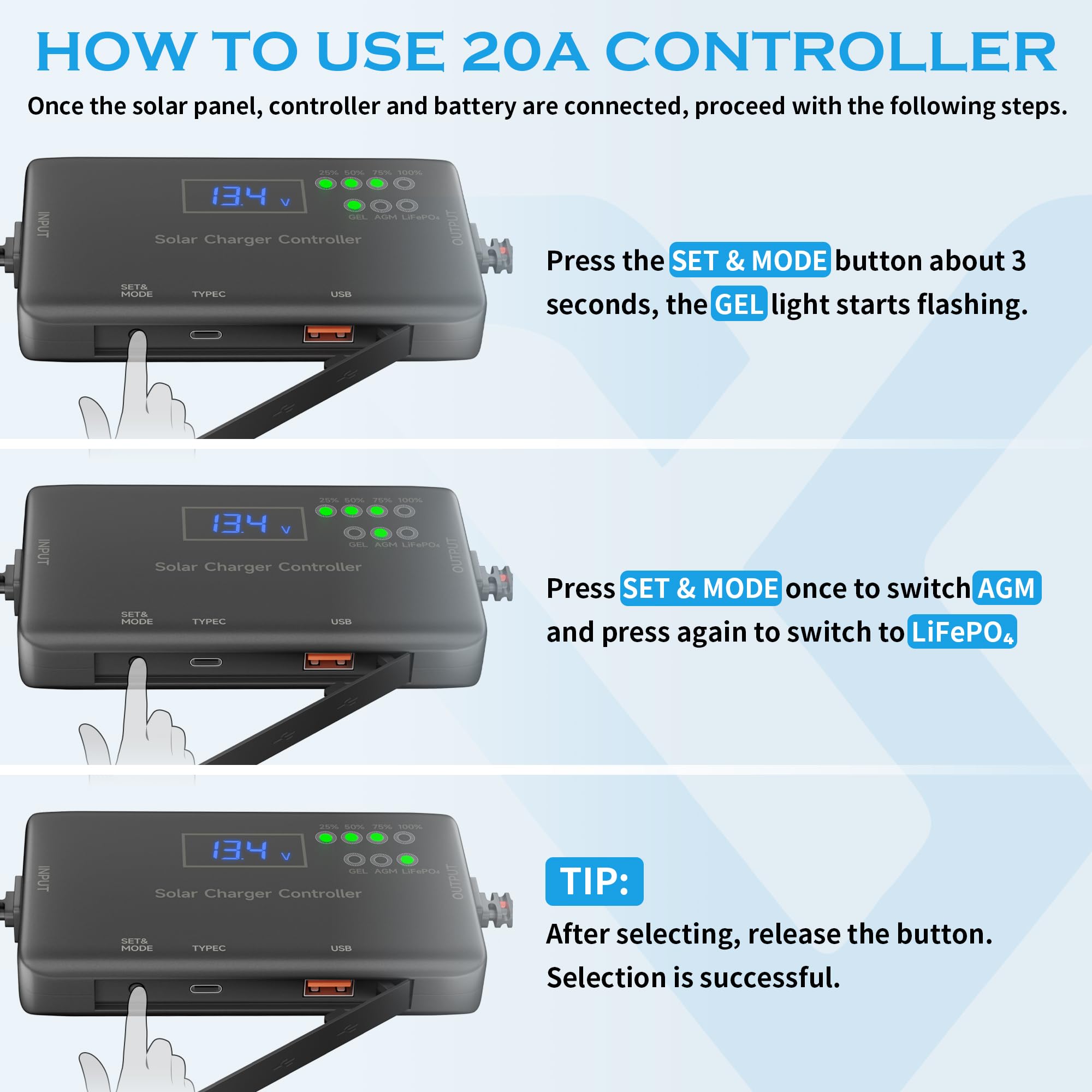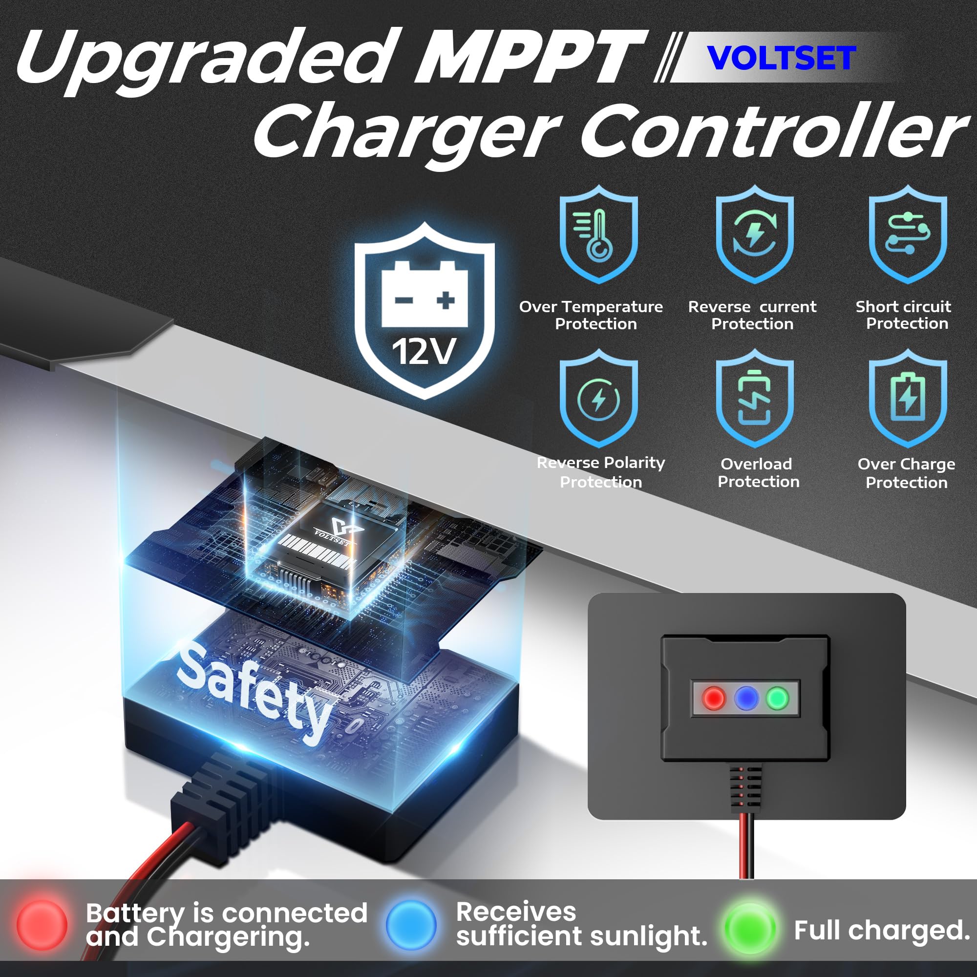 Smart 3-stage Visual Charge: PWM 3-stage charging technology (direct/float/trickle charge) for 12V LiFePO₄, lithium, AGM, SLA, GEL, etc, charging efficiency increased by 18%, controller LED screen displays charging status in real time, three indicators: blue (sunlight exposure), red (charging), green (battery fully charged)